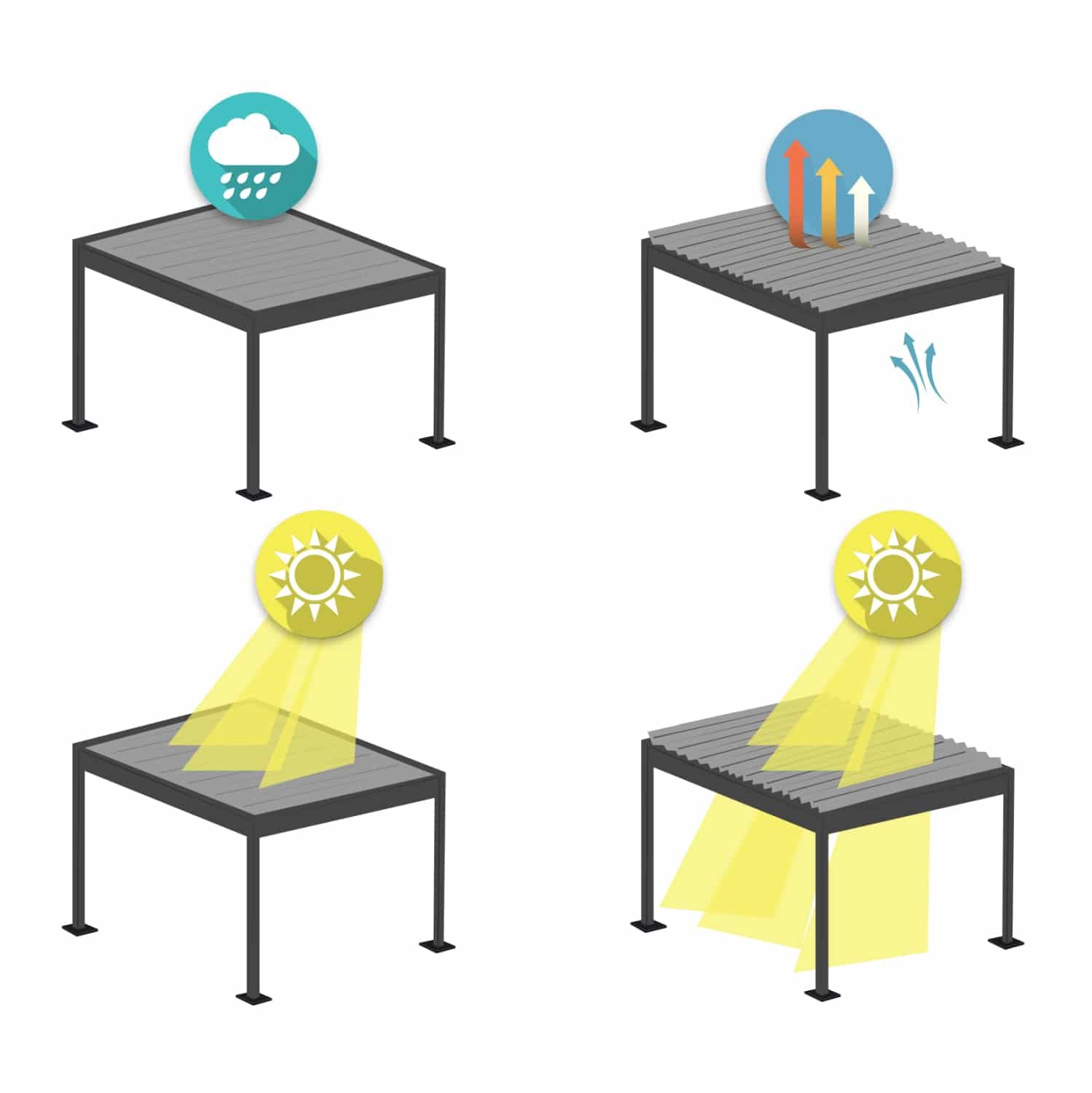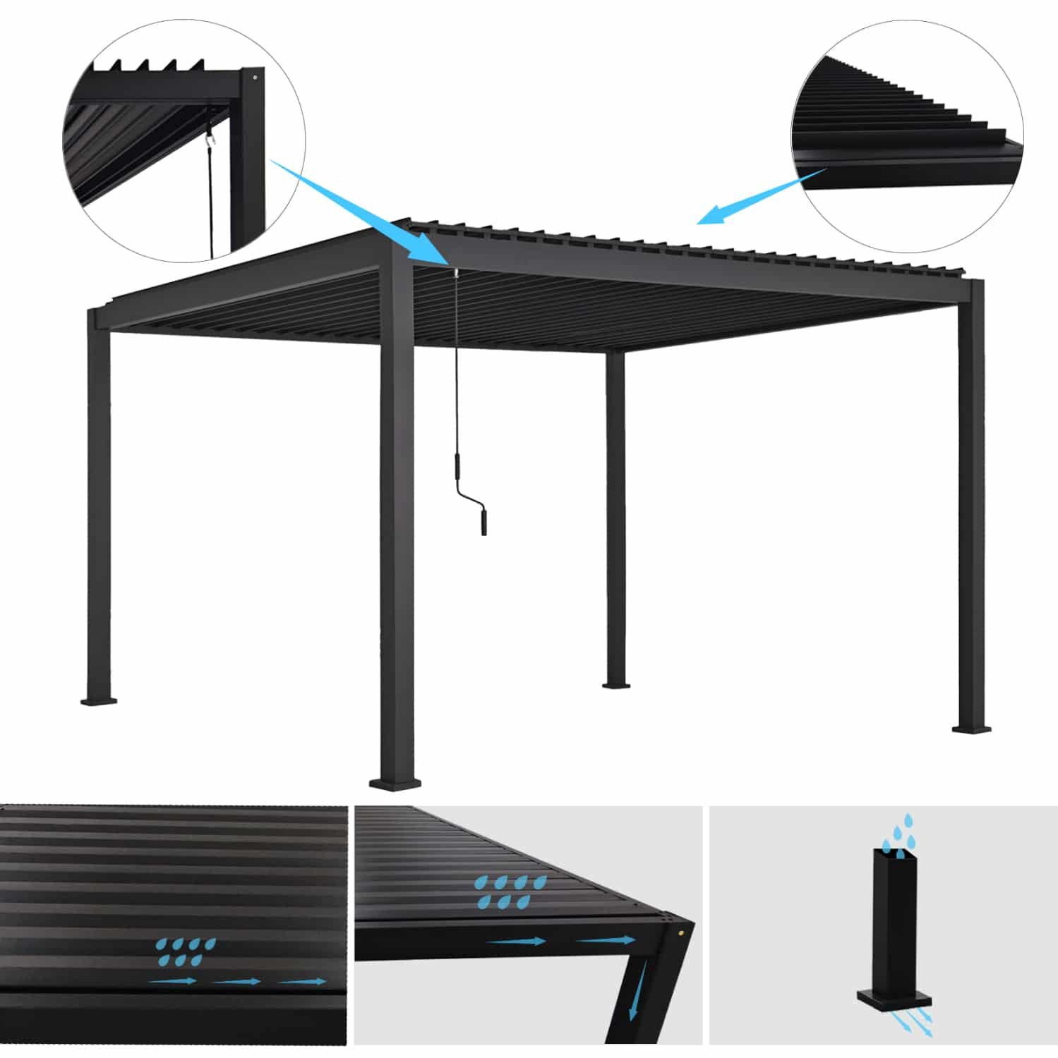 Ο χειροκίνητος μηχανισμός ΜΕ ΜΑΝΙΒΕΛΑ λειτουργεί ομαλά και αξιόπιστα, επιτρέποντας ακριβή ρύθμιση με ελάχιστη προσπάθεια, ενώ οι ενσωματωμένες υδροροές στις κολώνες της πέργκολας βοηθούν στην τέλεια απομάκρυνση των νερών σε περίπτωση βροχής.