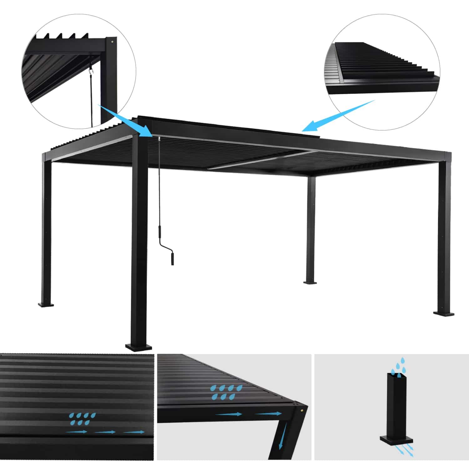 Ο χειροκίνητος μηχανισμός ΜΕ ΜΑΝΙΒΕΛΑ λειτουργεί ομαλά και αξιόπιστα, επιτρέποντας ακριβή ρύθμιση με ελάχιστη προσπάθεια, ενώ οι ενσωματωμένες υδροροές στις κολώνες της πέργκολας βοηθούν στην τέλεια απομάκρυνση των νερών σε περίπτωση βροχής.