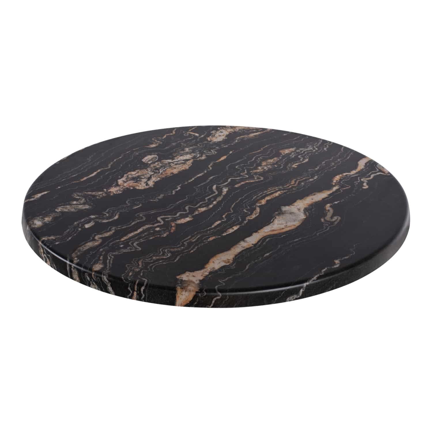 Επαγγελματική στρογγυλή επιφάνεια τραπεζιού σε χρώμα ΜΑΥΡΟ-ΧΡΥΣΟ μαρμάρου, η οποία είναι κατάλληλη για επαφή με τρόφιμα και γενικά το υλικό είναι φιλικό προς το περιβάλλον. Μπορεί να χρησιμοποιηθεί σε καφετέριες, εστιατόρια, και τουριστικά καταλύματα, είτε σε εσωτερικούς, είτε σε εξωτερικούς χώρους.