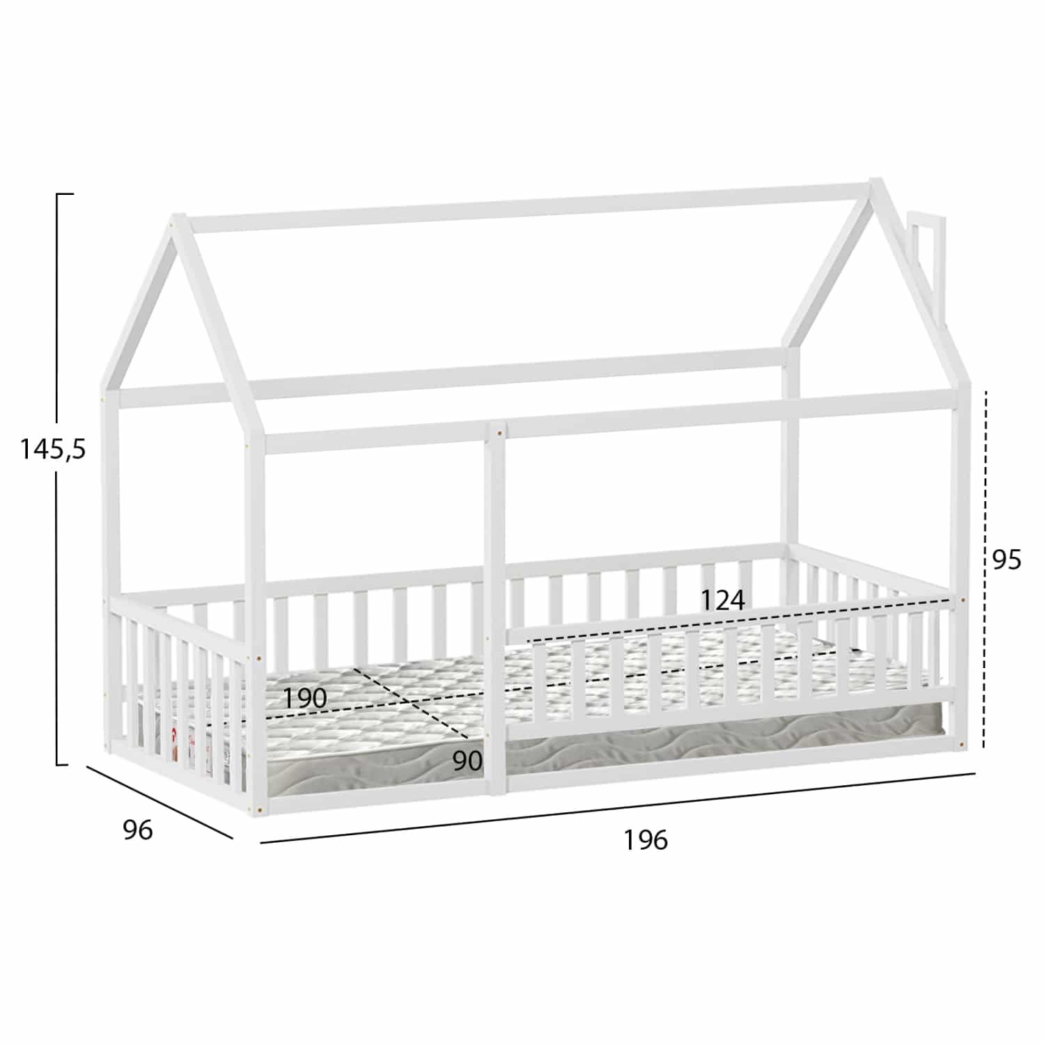 Το παιδικό κρεβάτι HOUSER τύπου Montessori σε διάσταση για στρώμα 90×190εκ, είναι κατασκευασμένο από ξύλο πεύκου σε ΛΕΥΚΟ χρώμα. Όλο το κρεβάτι που πατάει στο πάτωμα έχει σχήμα σπιτιού με καμινάδα και περιμετρικά κάγκελα, ενώ το στρώμα τοποθετείται σε τάβλες από κόντρα-πλακέ ξυλεία.