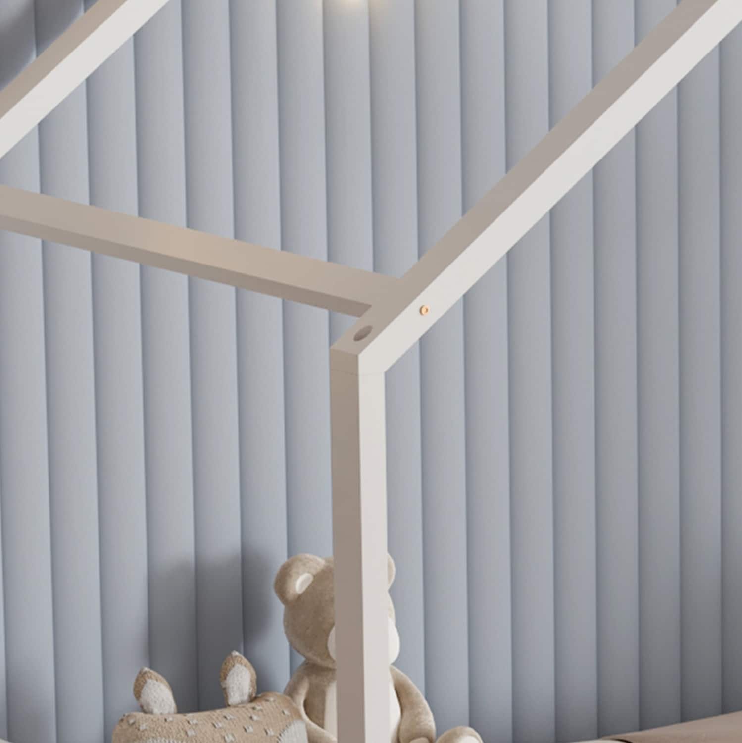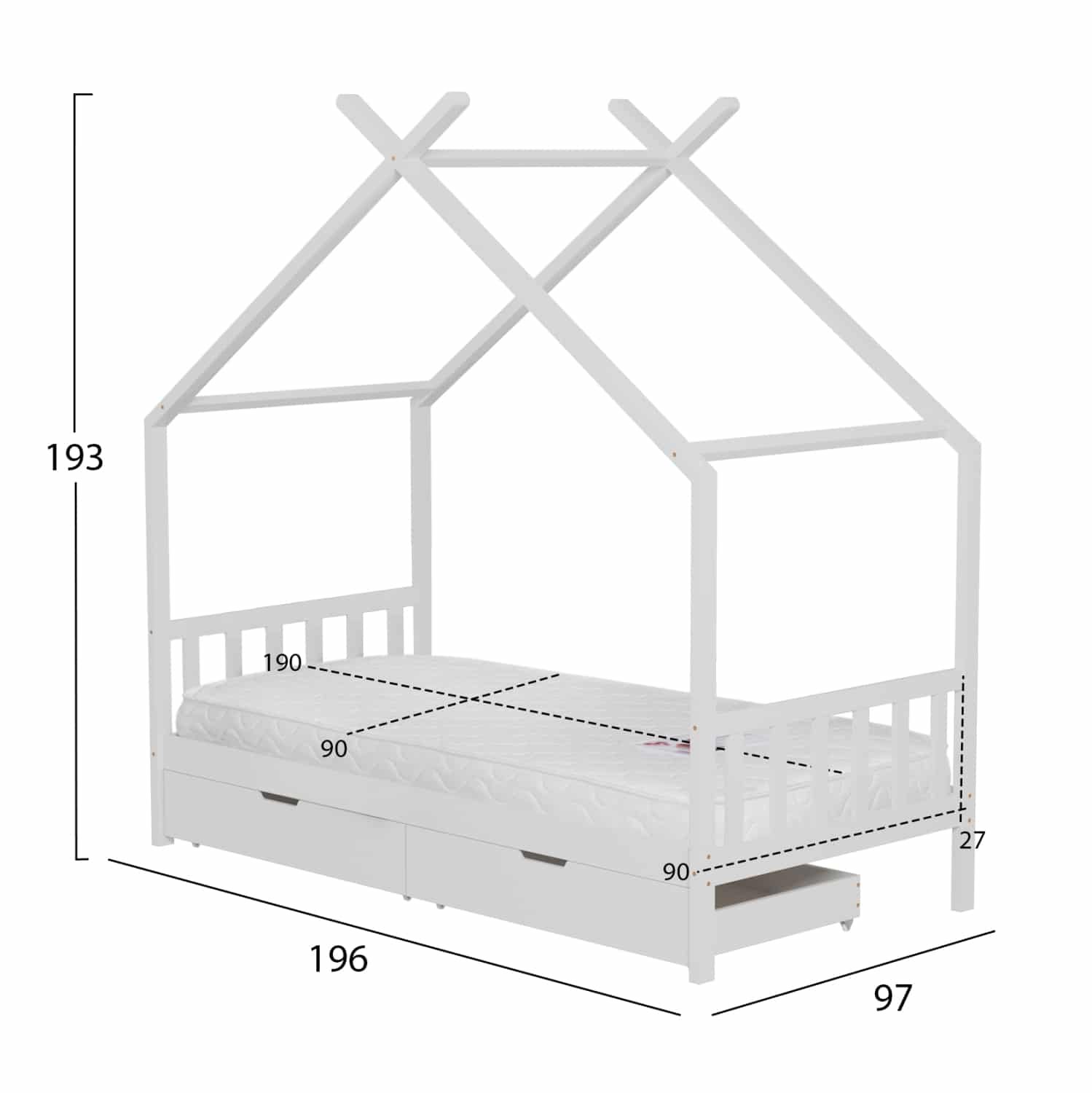 Το παιδικό κρεβάτι KLARICE τύπου Montessori σε διάσταση για στρώμα 90×190εκ, είναι κατασκευασμένο από ξύλο πεύκου σε ΛΕΥΚΟ χρώμα. Όλο το κρεβάτι έχει σχήμα σπιτιού και διαθέτει 2 συρτάρια στο κάτω μέρος ως αποθηκευτικό χώρο αλλά και προστατευτικό κάγκελα σε 2 πλευρές, ενώ το στρώμα τοποθετείται σε τάβλες από κόντρα-πλακέ ξυλεία.