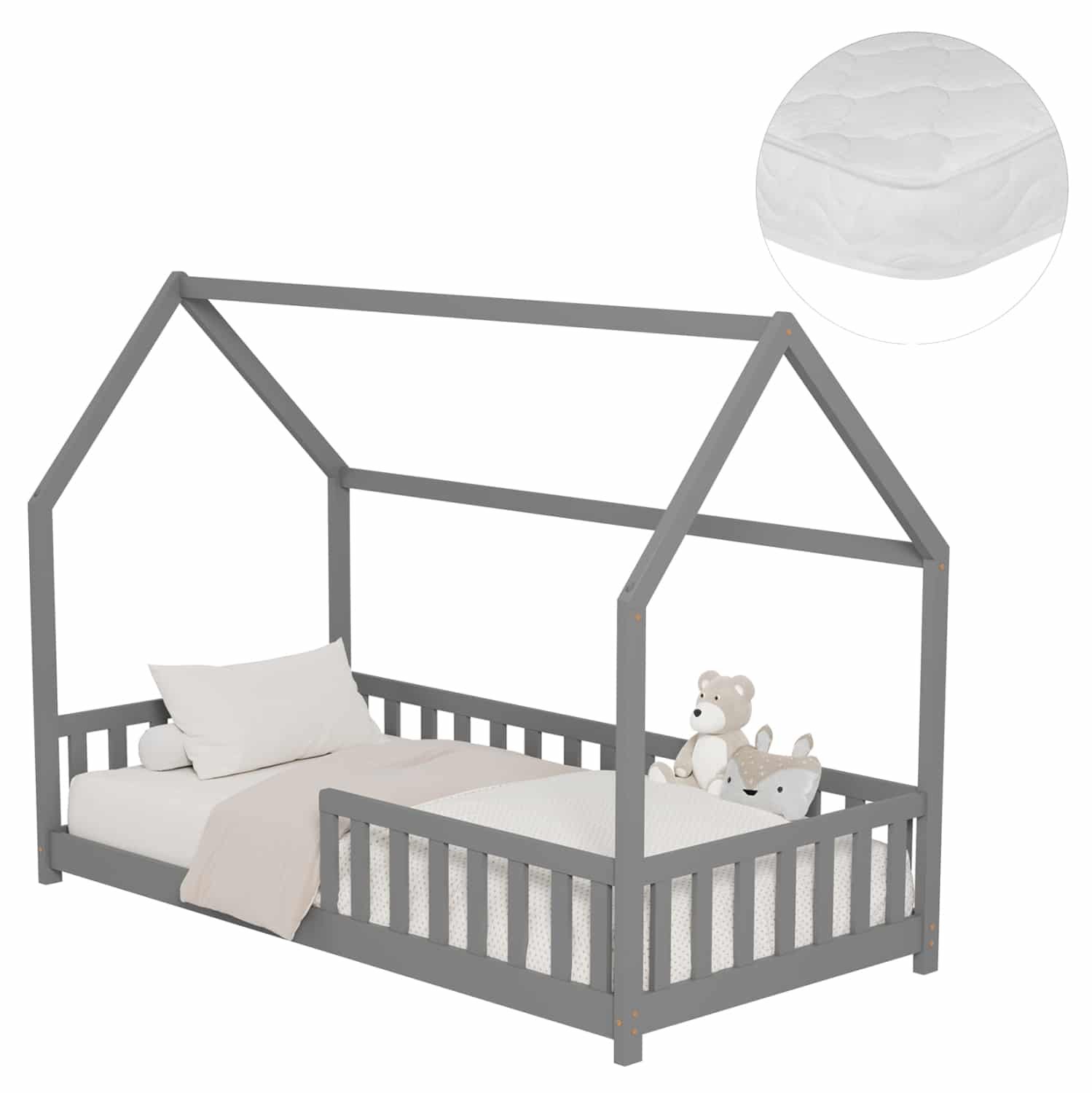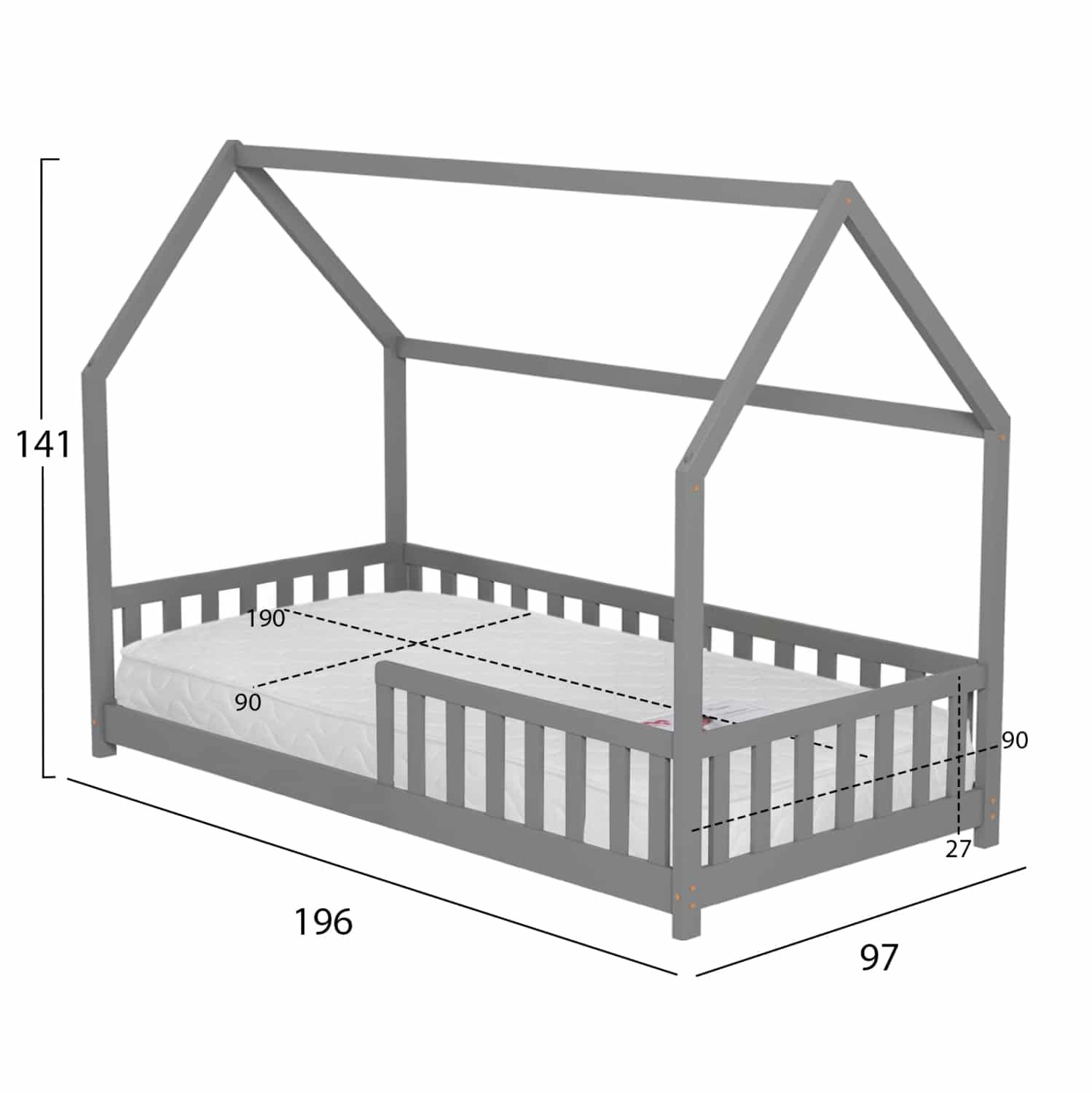 Το παιδικό κρεβάτι PHYLLIS τύπου Montessori σε διάσταση για στρώμα 90×190εκ, είναι κατασκευασμένο από ξύλο πεύκου σε ΓΚΡΙ χρώμα. Όλο το κρεβάτι έχει σχήμα σπιτιού με εξαιρετικά χαμηλά πόδια και περιμετρικά κάγκελα, ενώ το στρώμα τοποθετείται σε τάβλες από κόντρα-πλακέ ξυλεία.