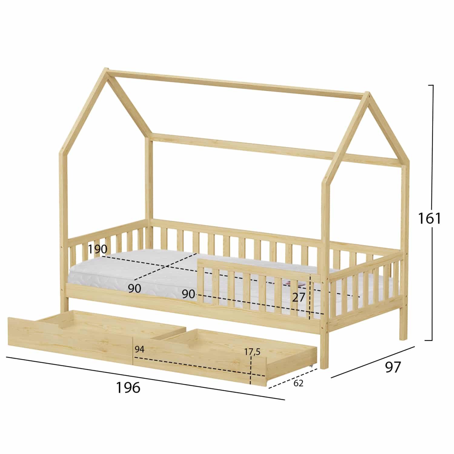 Το παιδικό κρεβάτι PHYLLIS τύπου Montessori σε διάσταση για στρώμα 90×190εκ, είναι κατασκευασμένο από ξύλο πεύκου σε ΦΥΣΙΚΟ χρώμα. Όλο το κρεβάτι έχει σχήμα σπιτιού με περιμετρικά κάγκελα και διαθέτει 2 συρτάρια στο κάτω μέρος ως αποθηκευτικό χώρο, ενώ το στρώμα τοποθετείται σε τάβλες από κόντρα-πλακέ ξυλεία.