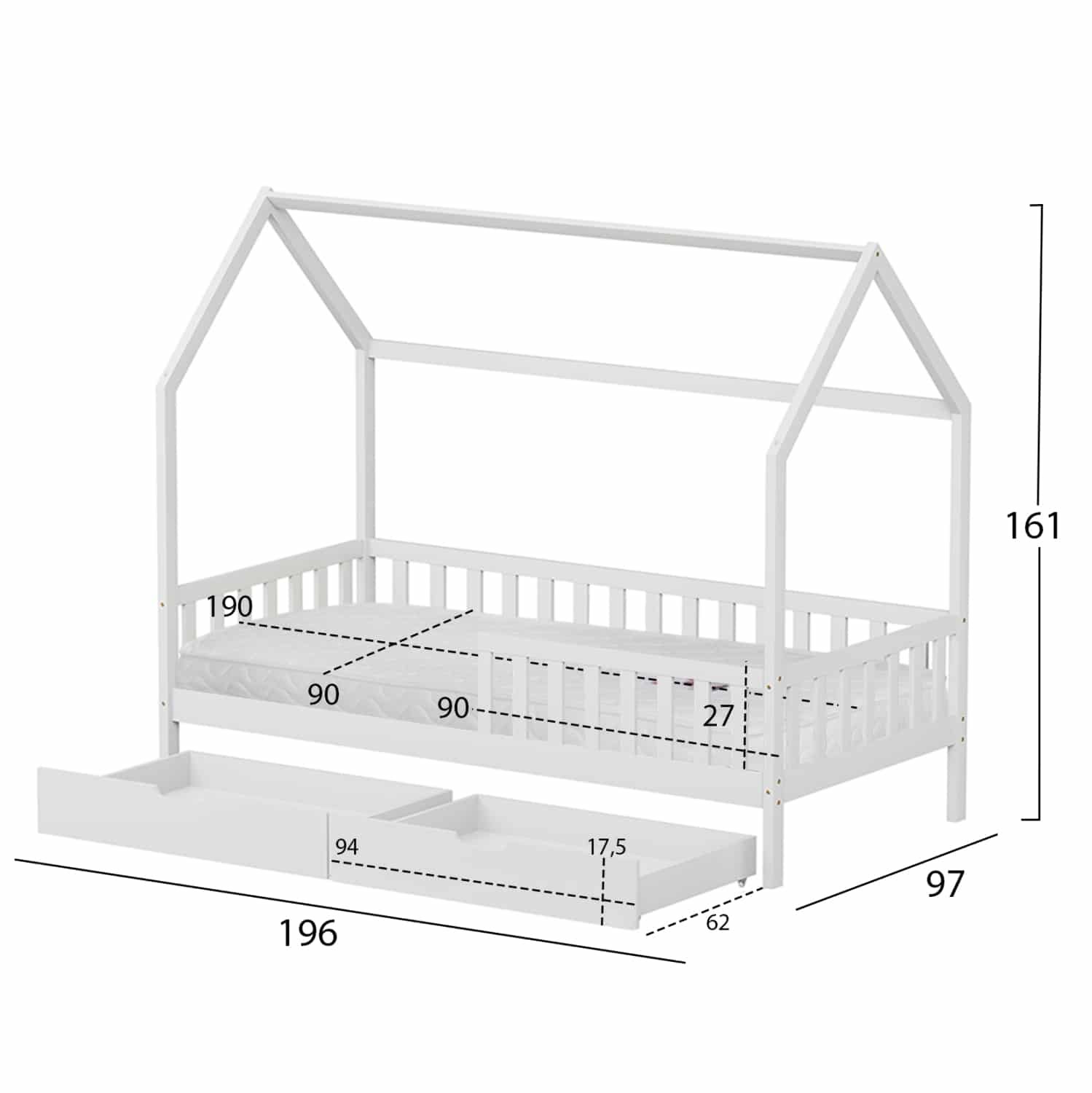 Το παιδικό κρεβάτι PHYLLIS τύπου Montessori σε διάσταση για στρώμα 90×190εκ, είναι κατασκευασμένο από ξύλο πεύκου σε ΛΕΥΚΟ χρώμα. Όλο το κρεβάτι έχει σχήμα σπιτιού με περιμετρικά κάγκελα και διαθέτει 2 συρτάρια στο κάτω μέρος ως αποθηκευτικό χώρο, ενώ το στρώμα τοποθετείται σε τάβλες από κόντρα-πλακέ ξυλεία.