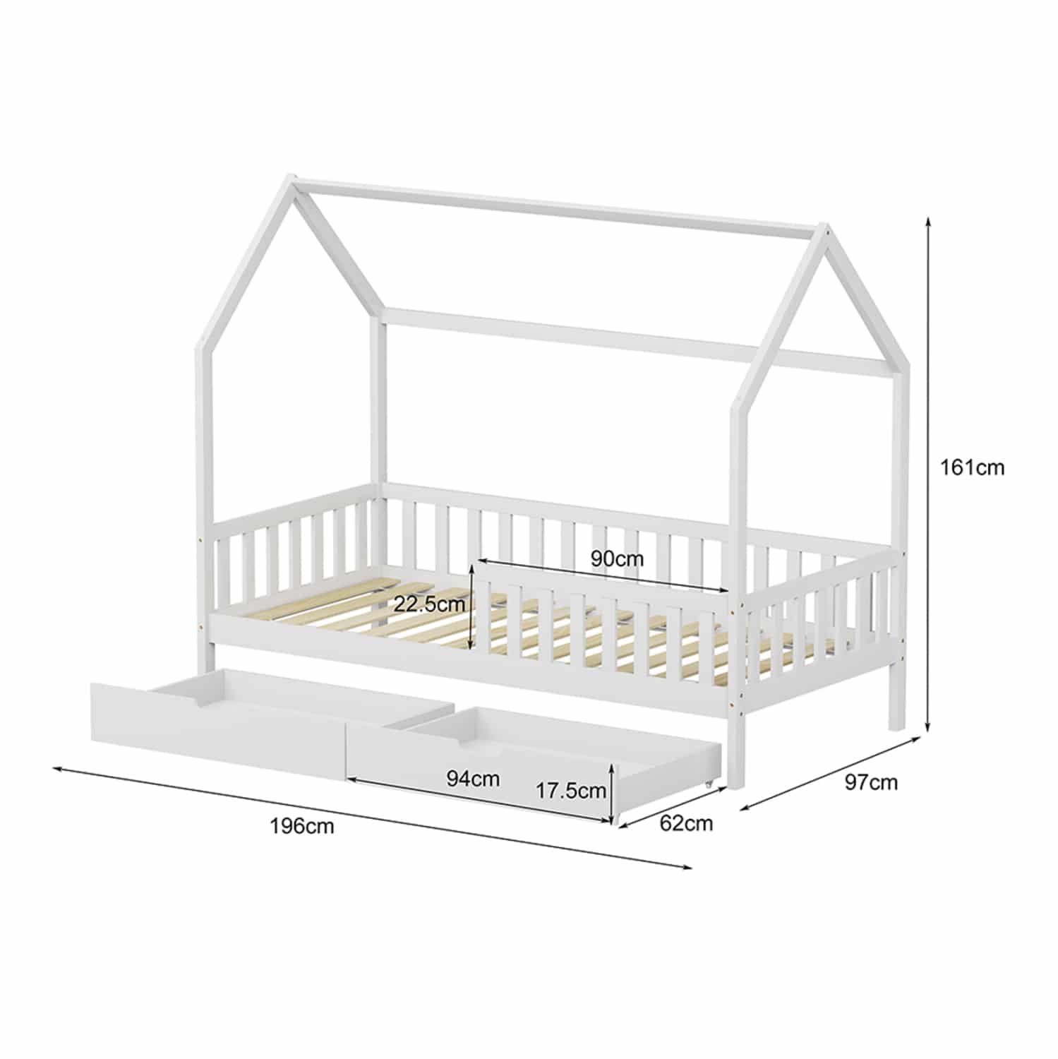 Το στρώμα τοποθετείται σε τάβλες κατασκευασμένες από ξυλεία κόντρα πλακέ. Ολόκληρο το κρεβάτι έχει σχήμα σπιτιού και μάλιστα αρκετά ψηλό, που θα δώσει μια ευχάριστη, «ζεστή», και παιχνιδιάρικη όψη σε κάθε παιδικό δωμάτιο.