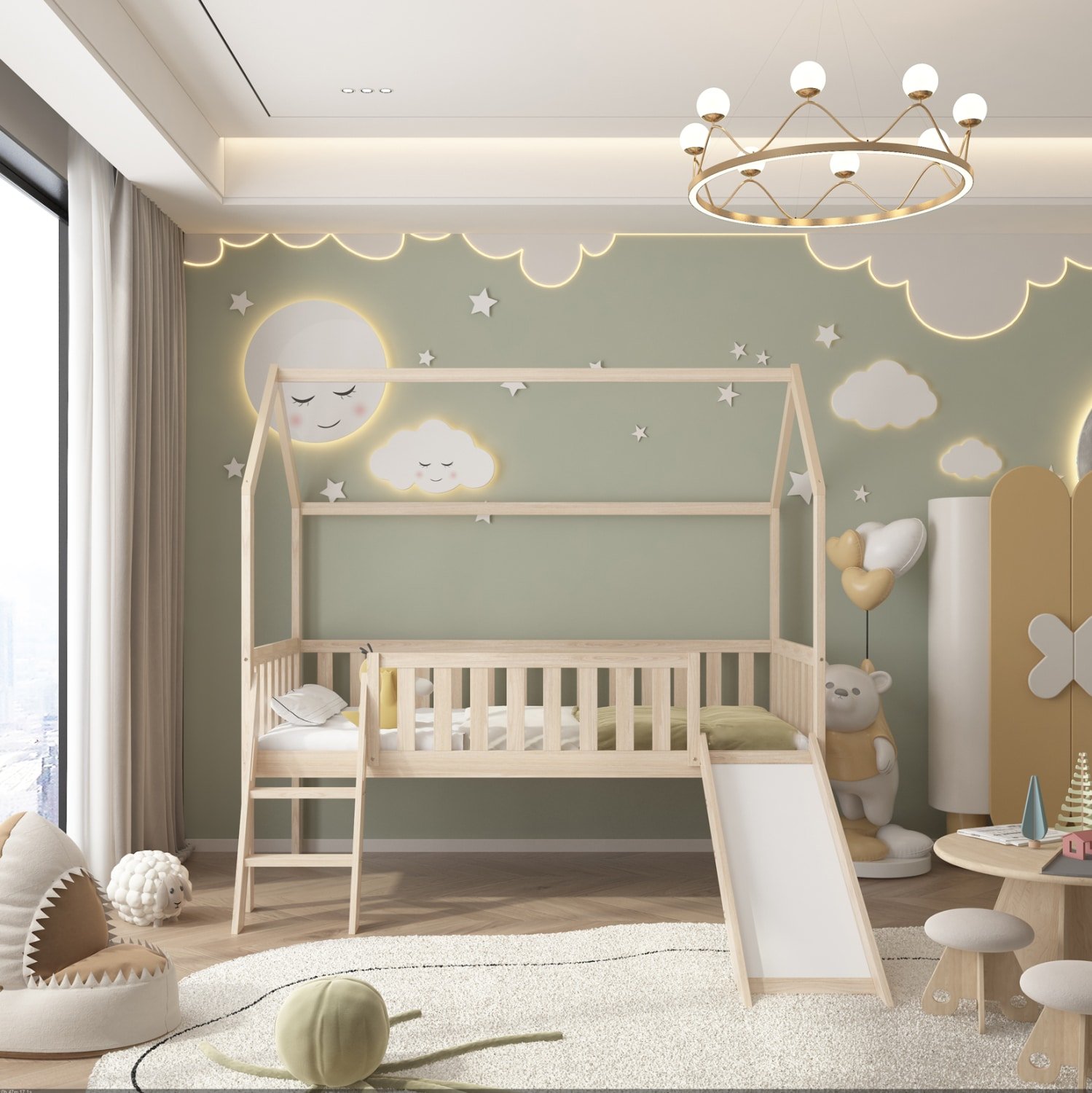 Το παιδικό κρεβάτι PHYLLIS τύπου Montessori σε διάσταση για στρώμα 90×190εκ, είναι κατασκευασμένο από ξύλο πεύκου σε ΦΥΣΙΚΟ χρώμα. Ολόκληρο το κρεβάτι είναι υπερυψωμένο και έχει σχήμα σπιτιού αλλά αυτό που κάνει τα παιδιά να το λατρέψουν είναι ότι διαθέτει τσουλήθρα προσφέροντας ατελείωτες ώρες παιχνιδιού και χαράς. Η πρόσβαση στο κρεβάτι γίνεται με μια μικρή σκαλίτσα, εξυπηρετώντας και τον σκοπό της τσουλήθρας, ενώ το στρώμα τοποθετείται σε τάβλες από κόντρα-πλακέ ξυλεία.