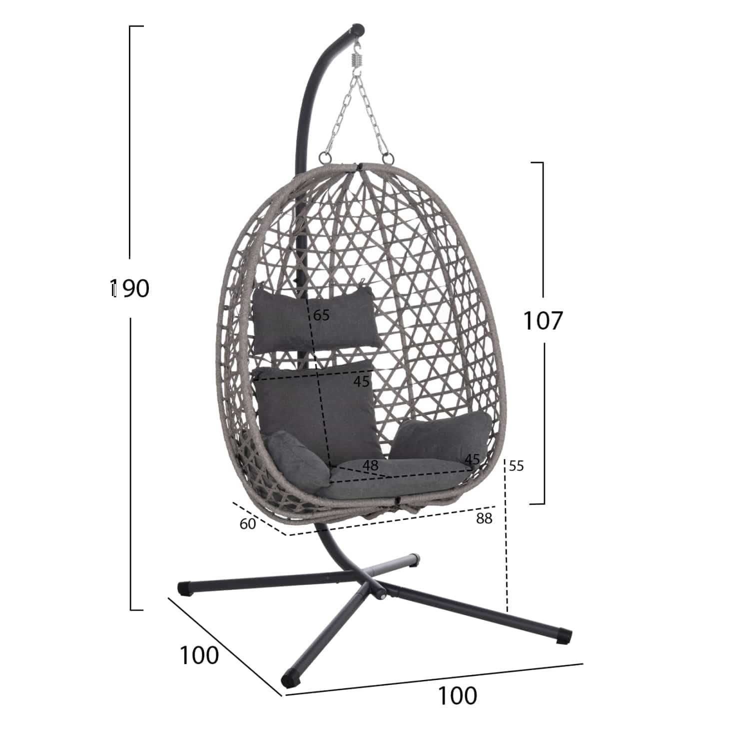 Η κρεμαστή φωλιά NESTA αποτελεί μια ιδιαίτερα κομψή και άνετη πρόταση για εξωτερικούς και εσωτερικούς χώρους. Ο σταθερός γκρι σκελετός από μέταλλο εξασφαλίζει ασφάλεια και αντοχή, ενώ η φωλιά με γκρι πλέξη από P.E. Rattan προσδίδει μοντέρνα αισθητική και φυσικό χαρακτήρα.