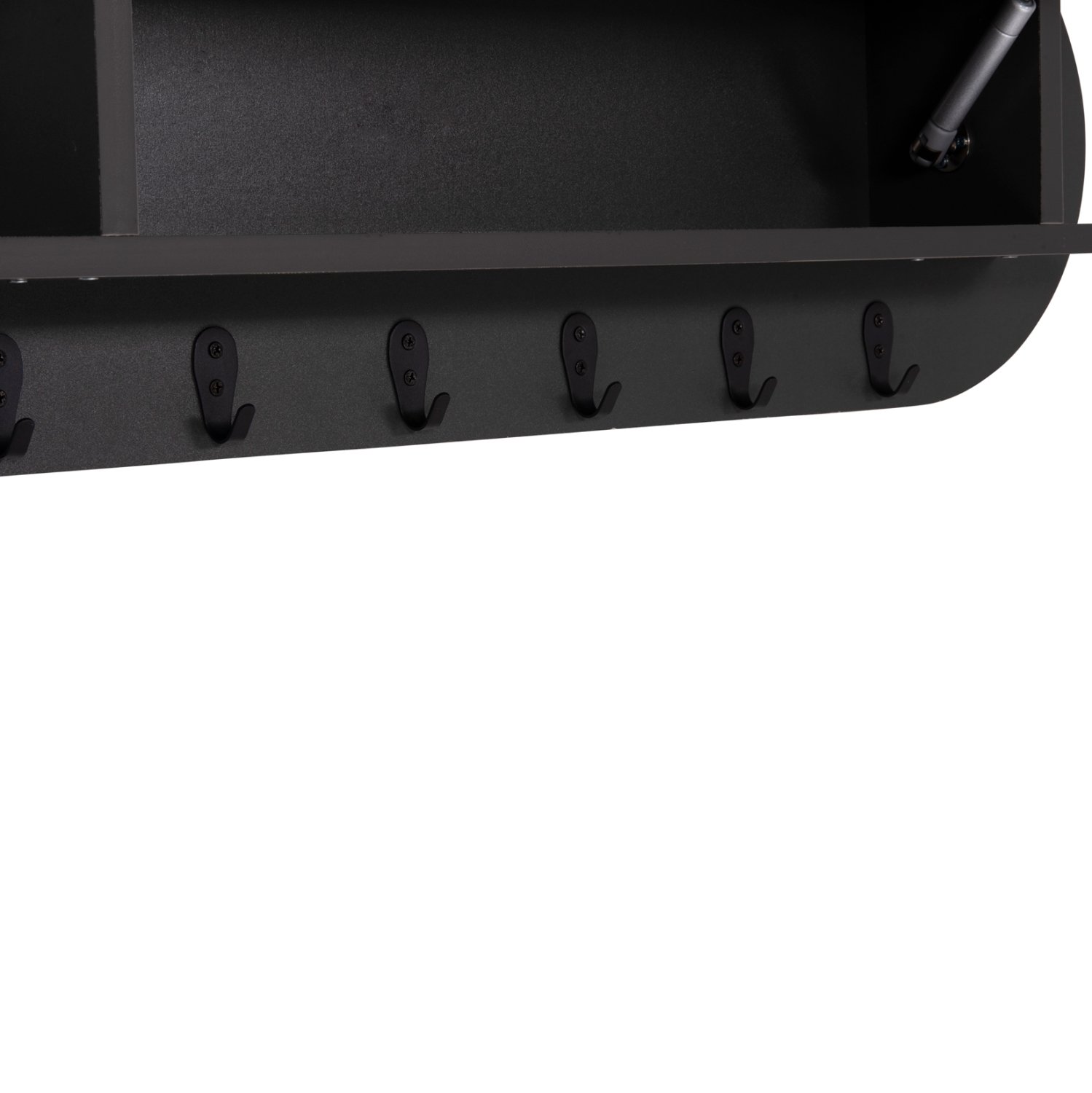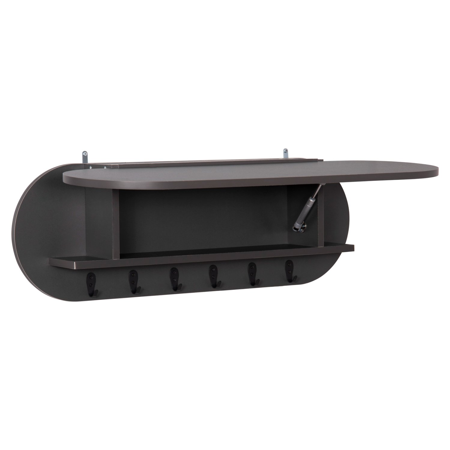 Η επιτοίχια κρεμάστρα εισόδου μελαμίνης STOR σε ΣΚΟΥΡΟ ΓΚΡΙ χρώμα είναι μια πρακτική πρόταση διακόσμησης για τον χώρο υποδοχής του σπιτιού σας, που θα σας βοηθήσει να δημιουργήσετε έναν καλά οργανωμένο και τακτοποιημένο χώρο. Έχει σχήμα οβάλ και διαθέτει 6 μονές κρεμάστρες (γαντζάκια) και 1 ορθογώνιο χώρο τοποθέτησης αντικειμένων/ράφι, το οποίο όμως κλείνει, αφού η εμπρός επιφάνεια αποτελεί την πόρτα του ραφιού. Αυτή η πόρτα ανοίγει προς τα επάνω και «κρύβει» εκτός από το ράφι, και τις κρεμάστρες.