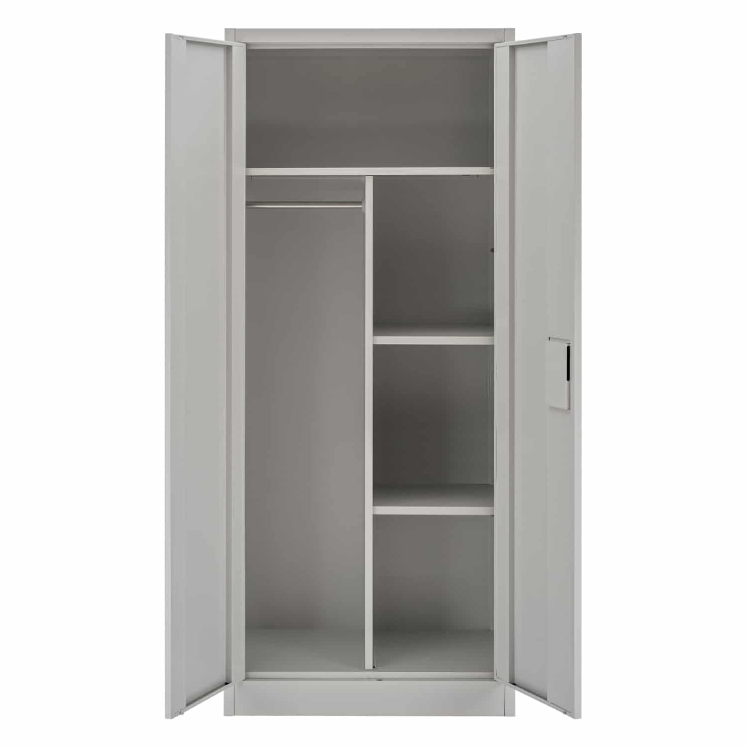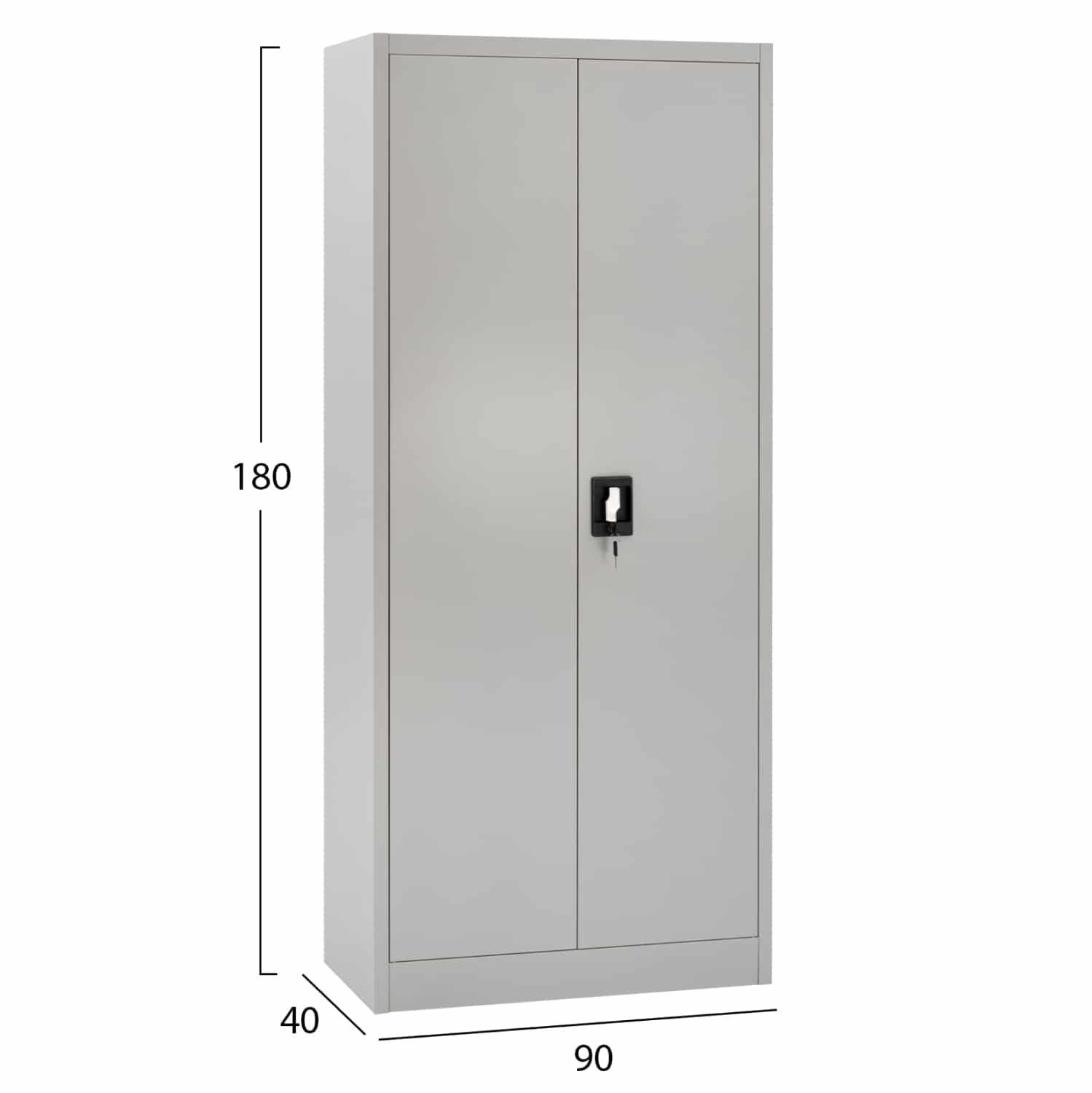 Η ΗΜ5961.01 είναι μια πρακτικότατη μεταλλική ντουλάπα που έχει φτιαχτεί με γνώμονα την χωρητικότητα και την ανθεκτικότητα. Είναι δίφυλλη με τις δύο πόρτες να κλείνουν ακριβώς στην μέση της κατασκευής, ενώ το εσωτερικό είναι χωρισμένο σε 3 κύριους χώρους με μεταλλικό χώρισμα σε σχήμα Τ. Το επάνω μέρος είναι ενιαίο σαν παταράκι, ενώ η μία πλευρά διαθέτει μεταλλική μπάρα για κρέμαση αντικειμένων και η άλλη διαθέτει 2 ράφια που δημιουργούν 3 επίπεδα αποθήκευσης. Οι πόρτες διαθέτουν κλειδαριά που κλειδώνει με κλειδί, ενώ το χρώμα της ντουλάπας είναι πολύ ανοιχτό γκρι.