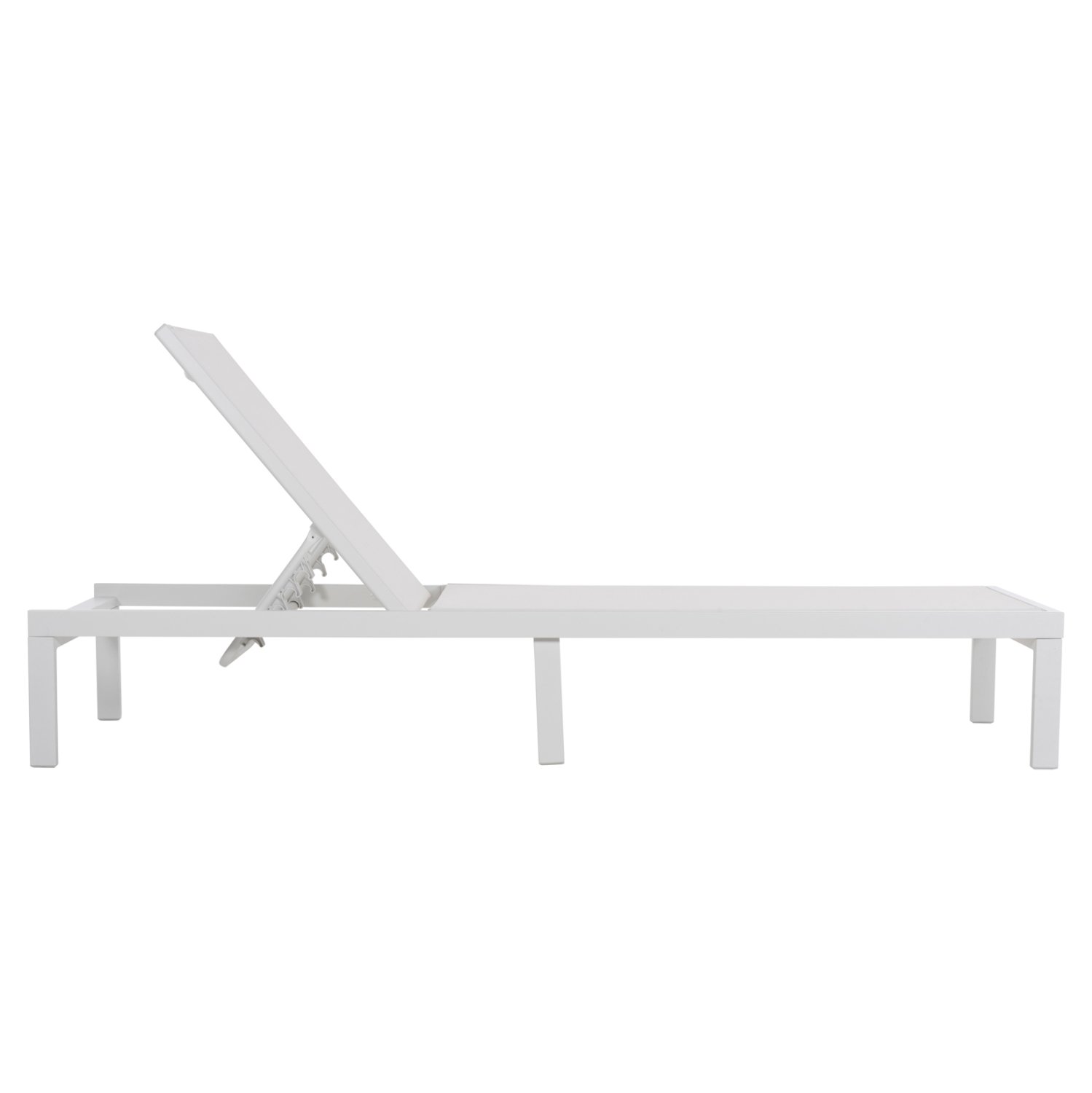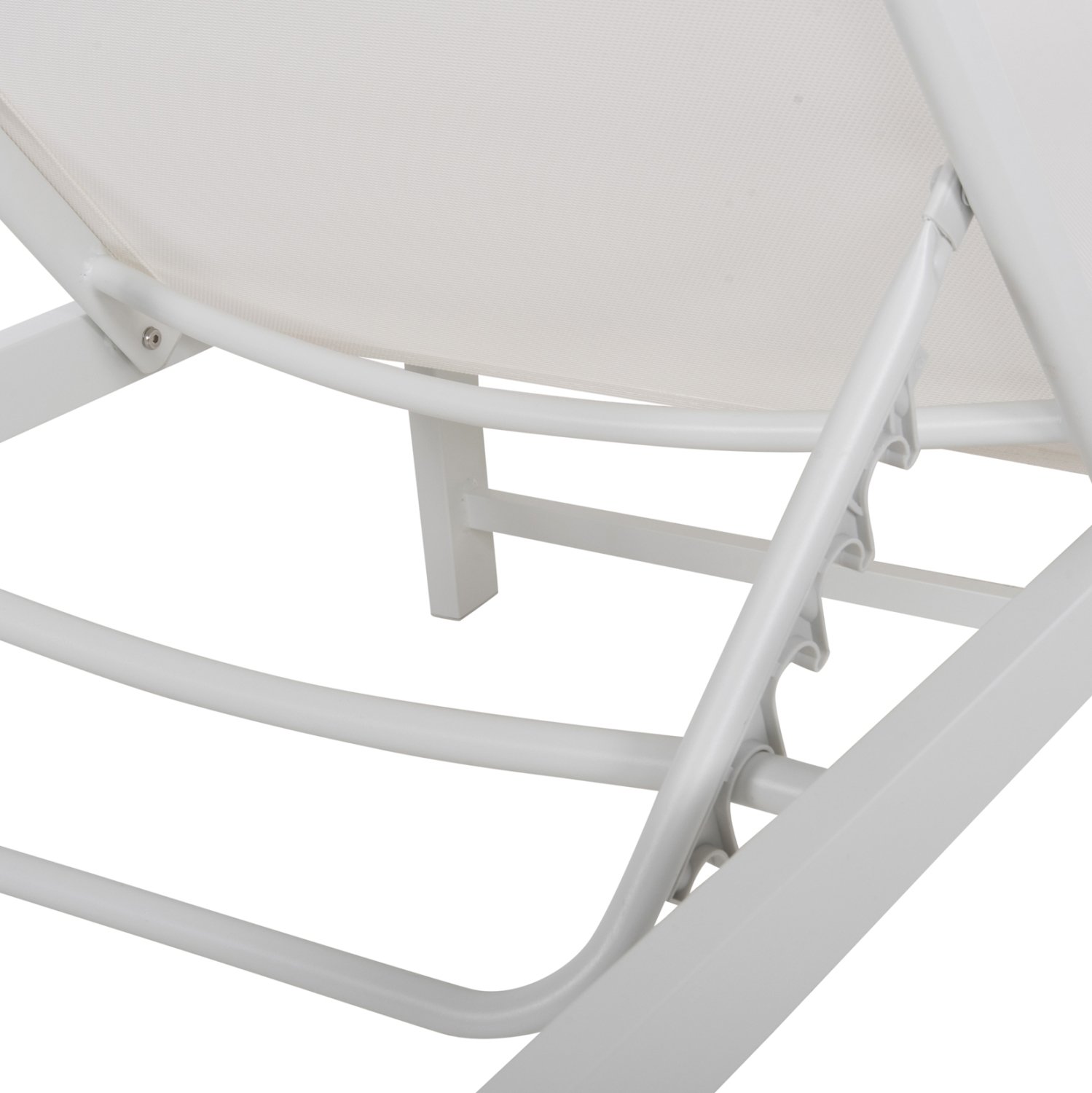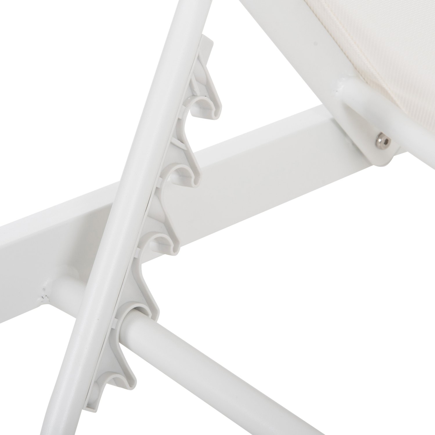 Η επαγγελματική ξαπλώστρα παραλίας THATCHER σε ΛΕΥΚΟ χρώμα είναι όμορφη και πολυτελής. Είναι κατασκευασμένη από αλουμίνιο και textilene επίσης σε ΛΕΥΚΟ χρώμα ενώ διαθέτει και έξτρα πόδια στην μέση του μήκους της για ακόμα μεγαλύτερη στιβαρότητα. Σχεδιαστικά οι «γραμμές» της είναι ξεκάθαρες και τετραγωνισμένες. Η σκαλιέρα έχει 5 επίπεδα (μαζί με την flat).