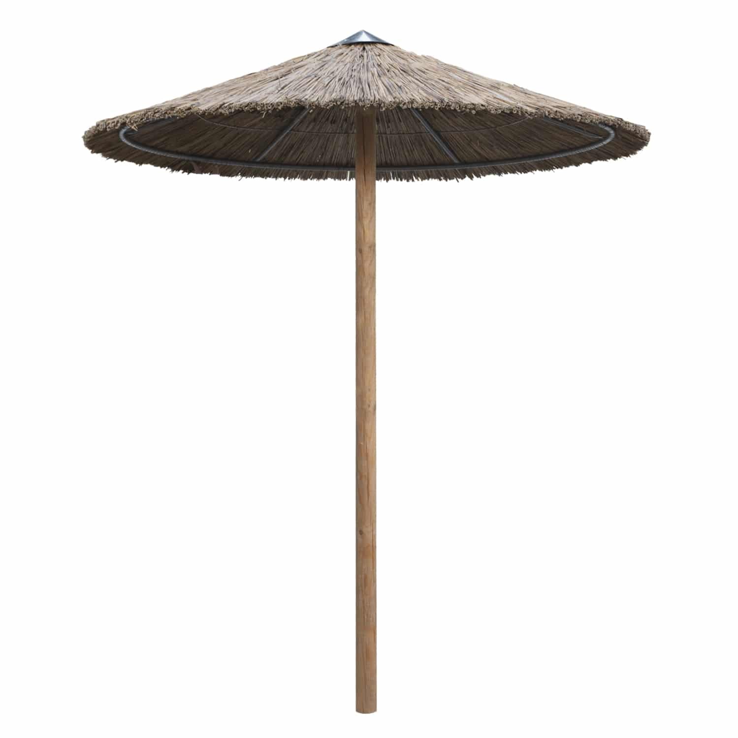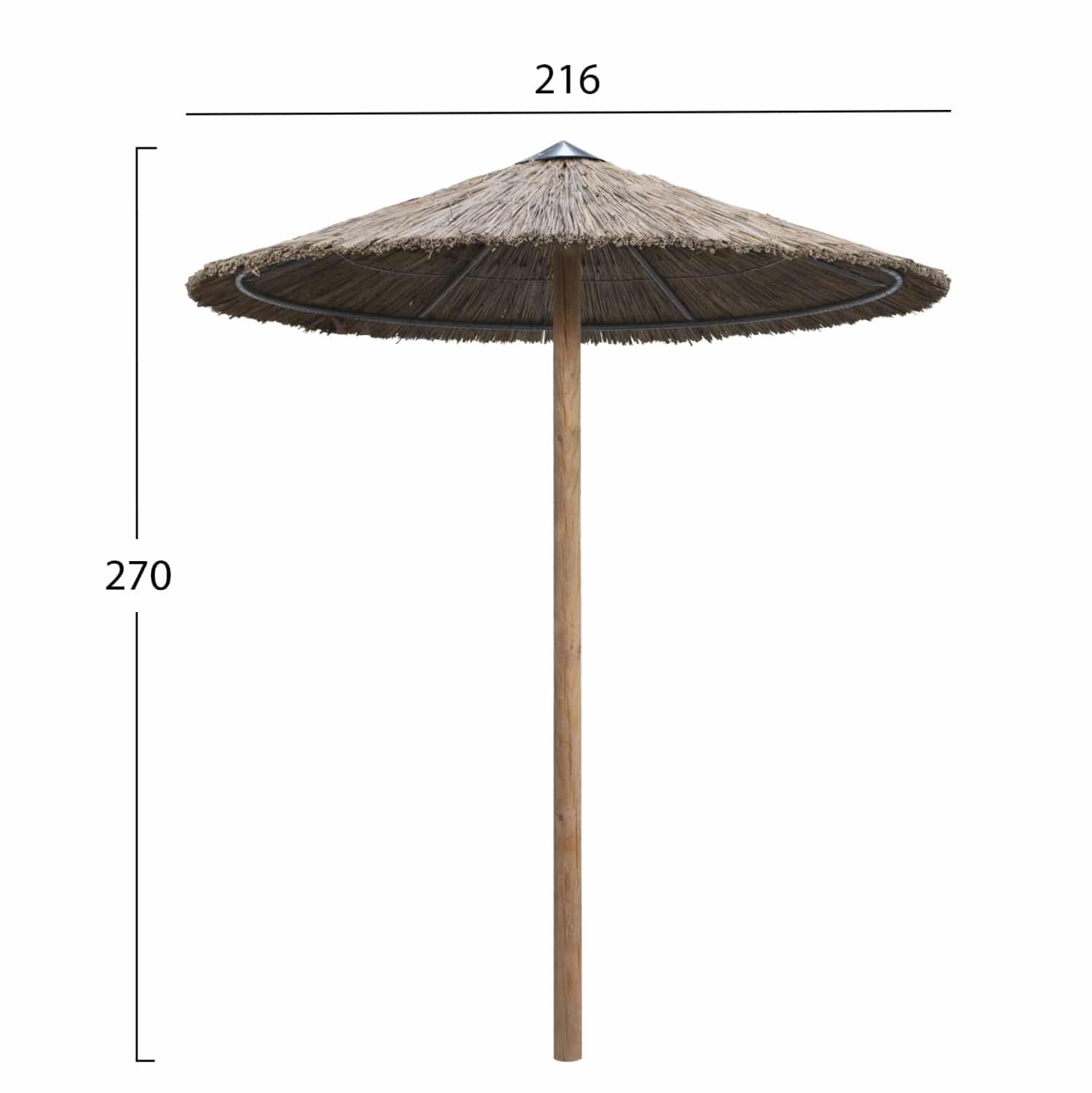 Η ομπρέλα είναι ψάθινη ενώ ο στύλος της ομπρέλας είναι από «άγριο» ξύλο πεύκου, εμποτισμένο και τορναρισμένο.