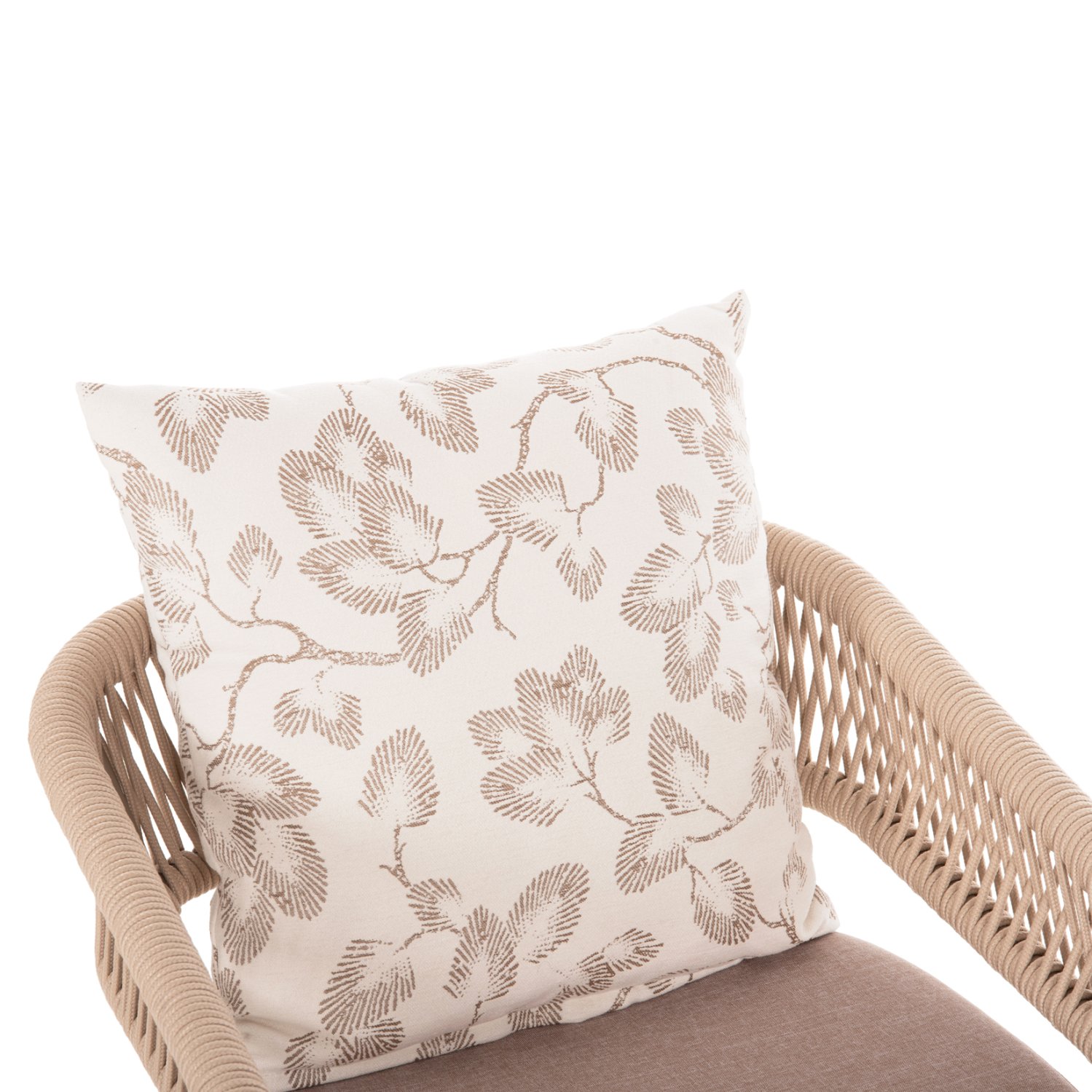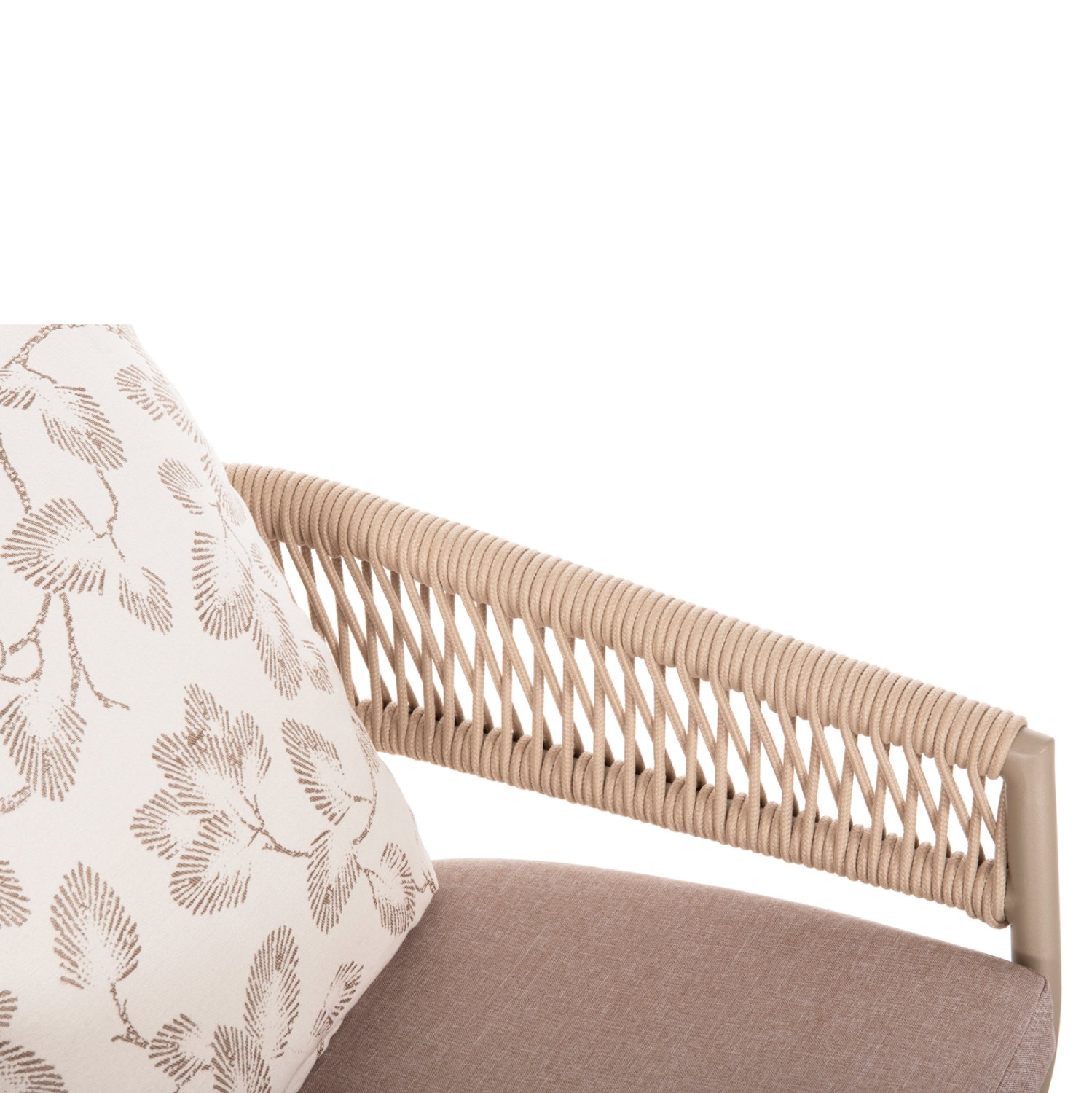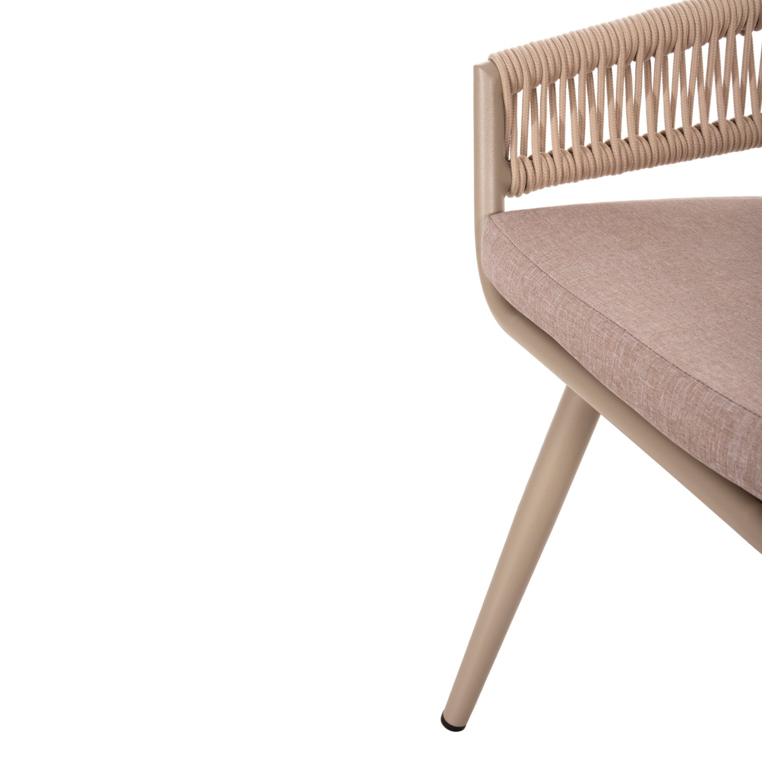 Η πολυθρόνα αλουμινίου CAMDEN σε ΚΑΠΟΥΤΣΙΝΟ χρώμα δεν έχει ξεχωριστά μπράτσα αλλά η πλάτη είναι ημικυκλική αγκαλιάζοντας το σώμα. Πρόκειται για μια πανέμορφη πολυθρόνα με χαμηλή πλάτη από συνθετικό φαρδύ πολυεστερικό σχοινί (terylene) σε ίδιο χρώμα. Το ιδιαίτερο χαρακτηριστικό αυτής της πολυθρόνας είναι ότι διαθέτει αναπαυτικά μαξιλάρια (με φερμουάρ) τόσο στο κάθισμα σε ΣΑΜΠΑΝΙ χρώμα, όσο και στην πλάτη σε εκρού χρώμα με σχέδιο PRINT.