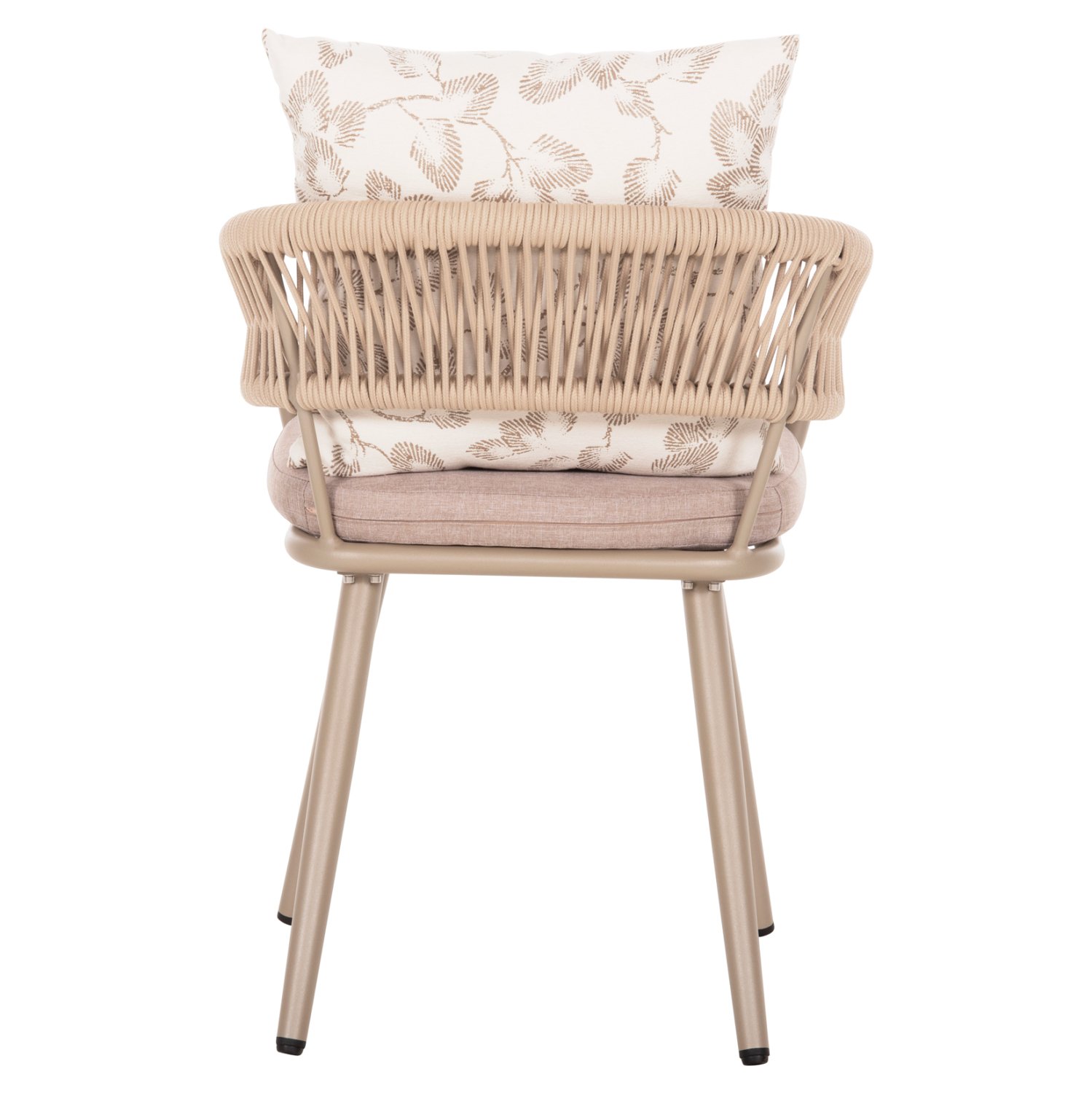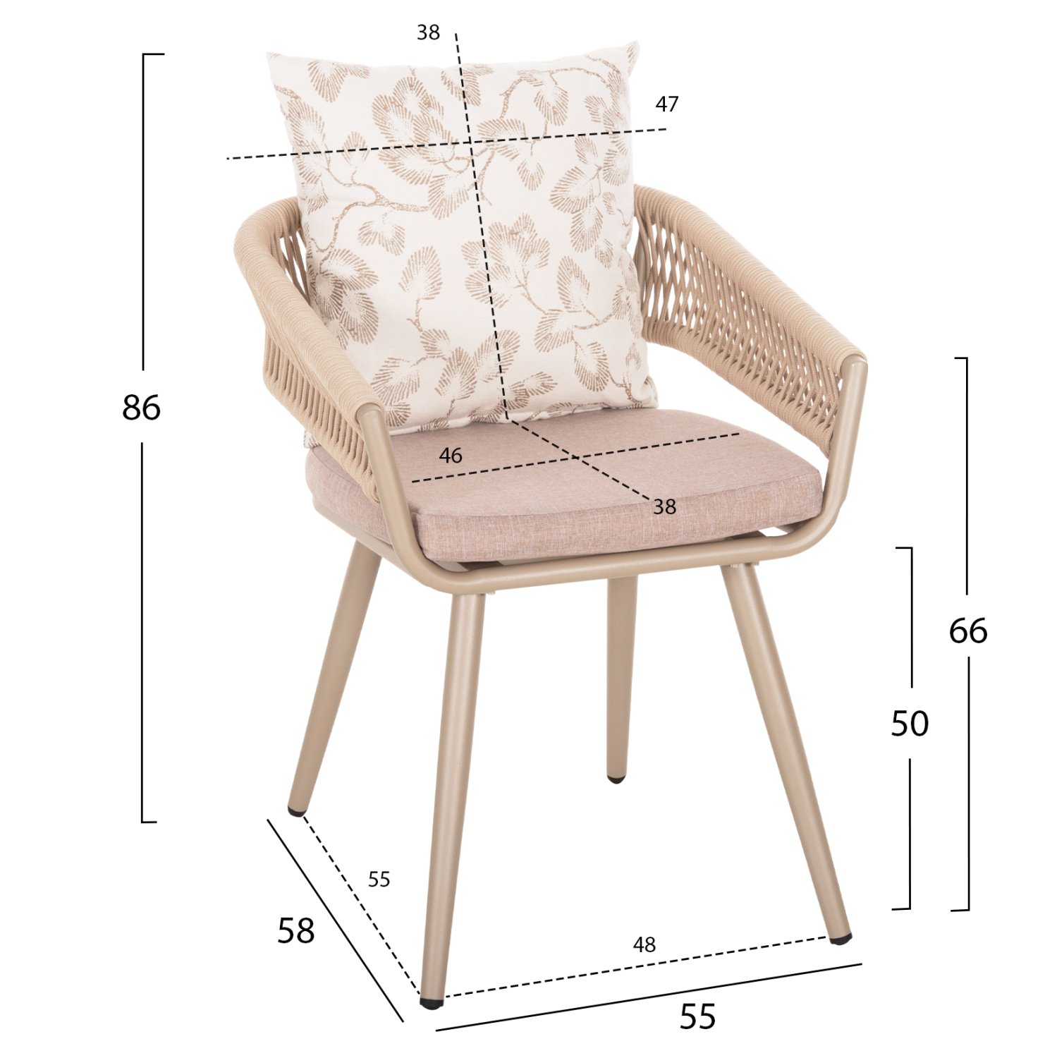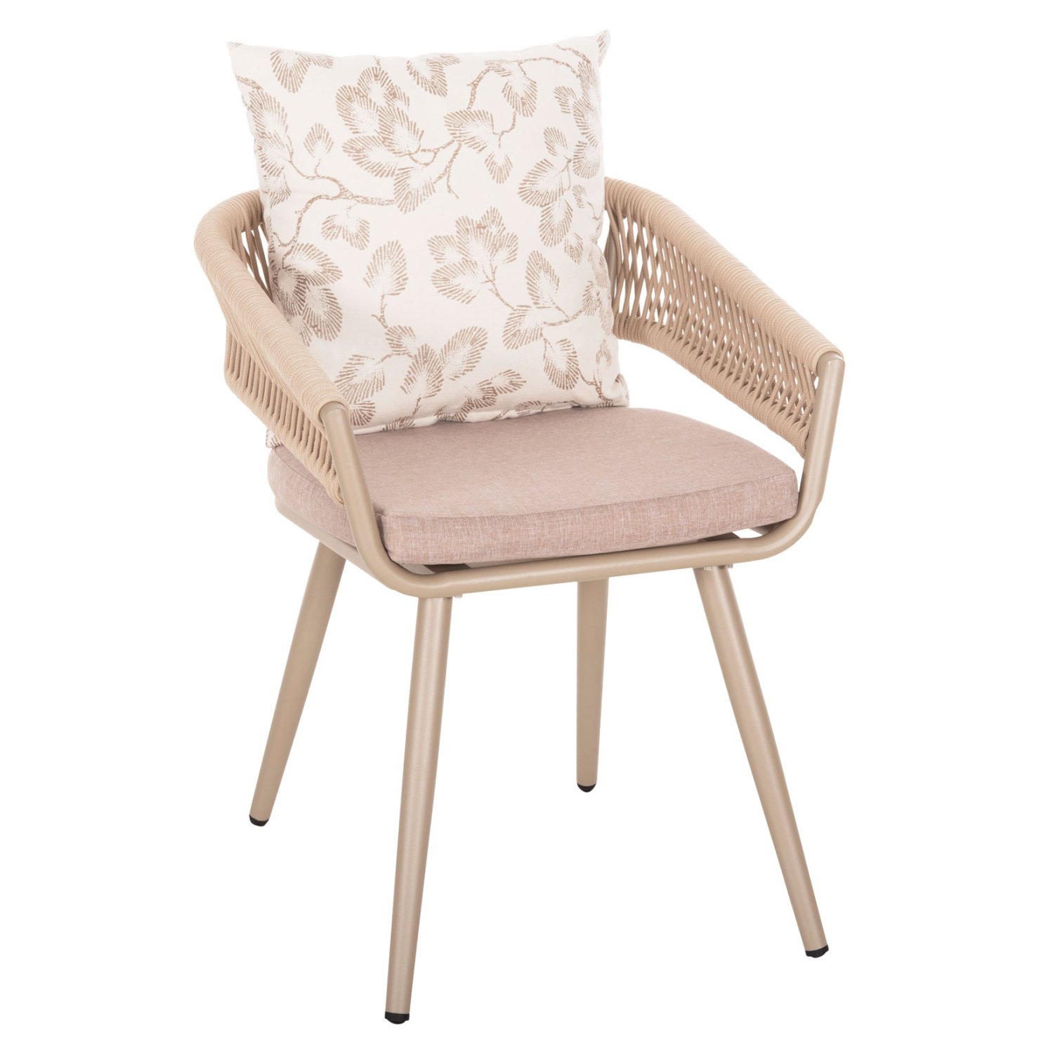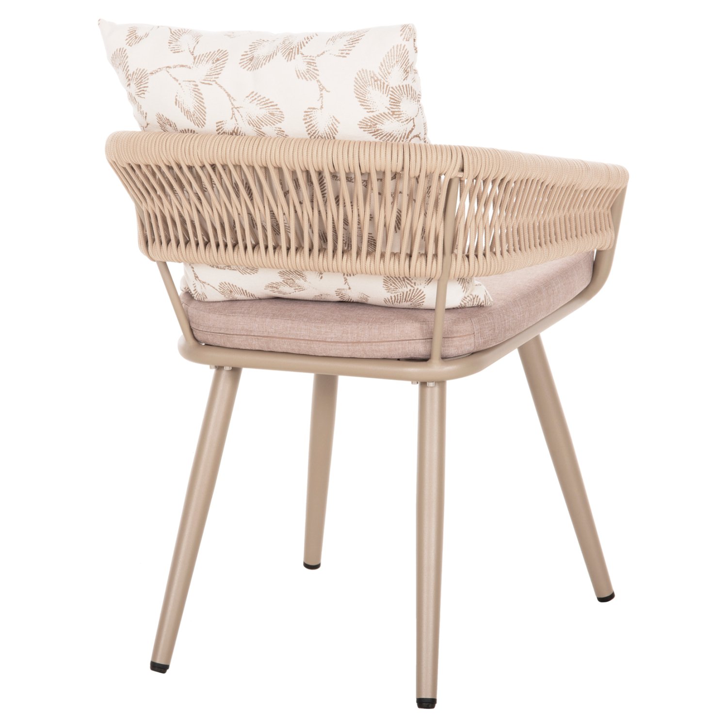 Η πολυθρόνα αλουμινίου CAMDEN σε ΚΑΠΟΥΤΣΙΝΟ χρώμα δεν έχει ξεχωριστά μπράτσα αλλά η πλάτη είναι ημικυκλική αγκαλιάζοντας το σώμα. Πρόκειται για μια πανέμορφη πολυθρόνα με χαμηλή πλάτη από συνθετικό φαρδύ πολυεστερικό σχοινί (terylene) σε ίδιο χρώμα. Το ιδιαίτερο χαρακτηριστικό αυτής της πολυθρόνας είναι ότι διαθέτει αναπαυτικά μαξιλάρια (με φερμουάρ) τόσο στο κάθισμα σε ΣΑΜΠΑΝΙ χρώμα, όσο και στην πλάτη σε εκρού χρώμα με σχέδιο PRINT.