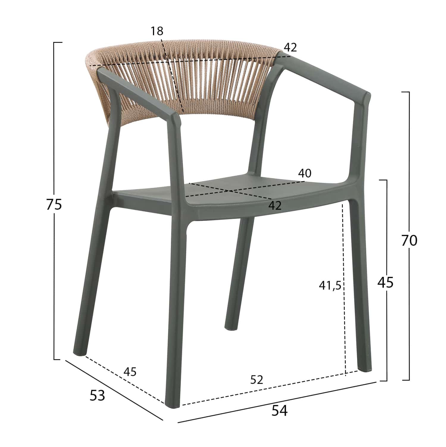 Η πολυθρόνα BOGI είναι από μονοκόμματο πολυπροπυλένιο σε OLIVE GREEN χρώμα με ελαφρώς κυρτή πλάτη επενδυμένη με συνθετικό σχοινί σε ΜΠΕΖ χρώμα, και πρακτικά μπράτσα. Όλη η κατασκευή είναι ελαφριά και άνετη, και θα γίνει το αγαπημένο κάθισμα σε όποιο χώρο κι αν τοποθετηθεί χάρη στην πρακτικότητά του. Ιδανική επιλογή και για επαγγελματική χρήση, όπως σε catering κτλ., καθώς είναι και στοιβαζόμενη.