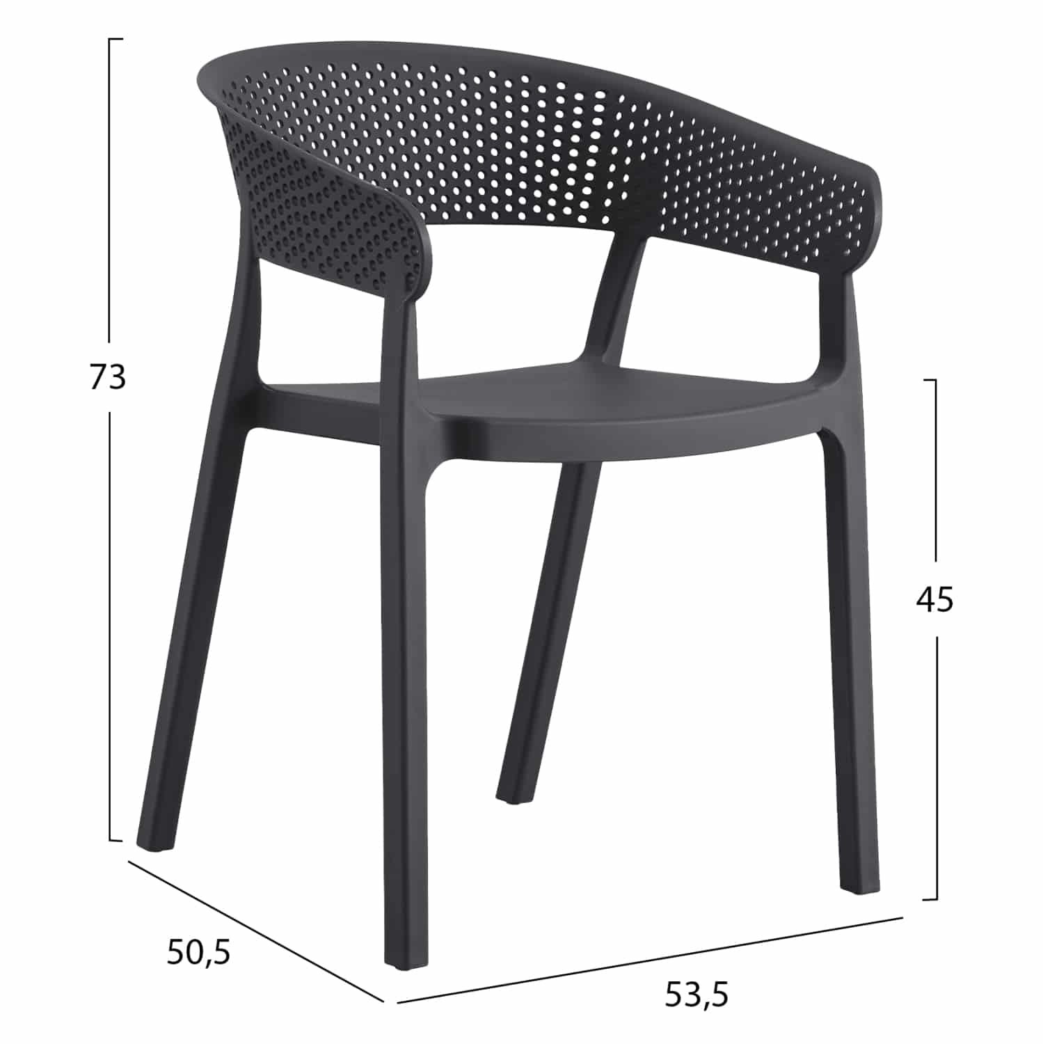 Πολυθρόνα πολυπροπυλενίου σε ΓΚΡΙ χρώμα. Ιδανική πρόταση για χρήση σε εξωτερικούς χώρους, είτε επαγγελματικούς (χώροι δεξιώσεων, εταιρείες catering, κλπ.) είτε για το σπίτι. Η πολυθρόνα αποτελείται από ένα λείο κάθισμα και μια ημικυκλική, ανεξάρτητη και «τρυπητή» πλάτη και μπράτσα. Είναι πανέμορφη και θα αναβαθμίσει αισθητικά κάθε εξωτερικό χώρο.