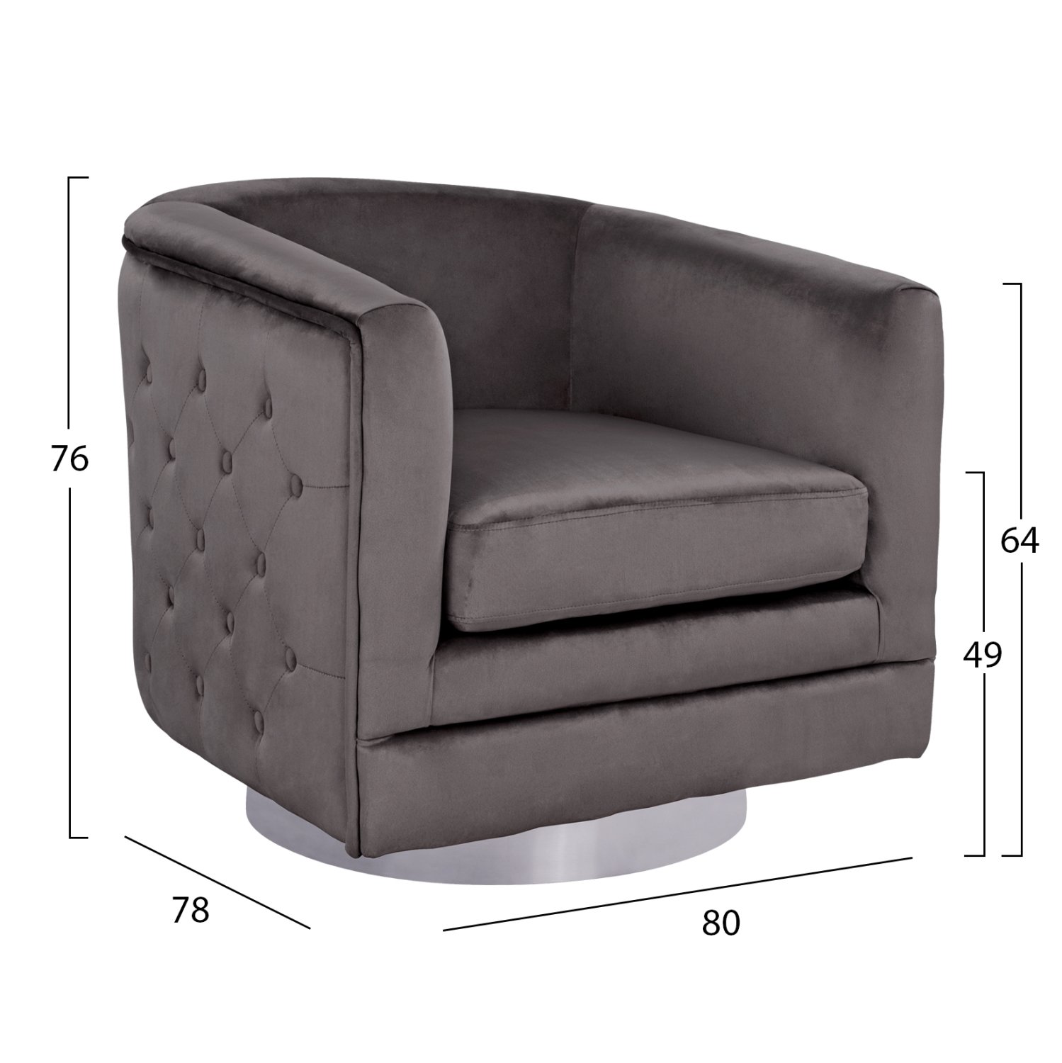 Βελούδινη πολυθρόνα, σε γκρι απόχρωση με διακοσμητικά κουμπιά και ασημί γυαλιστερή βάση.
