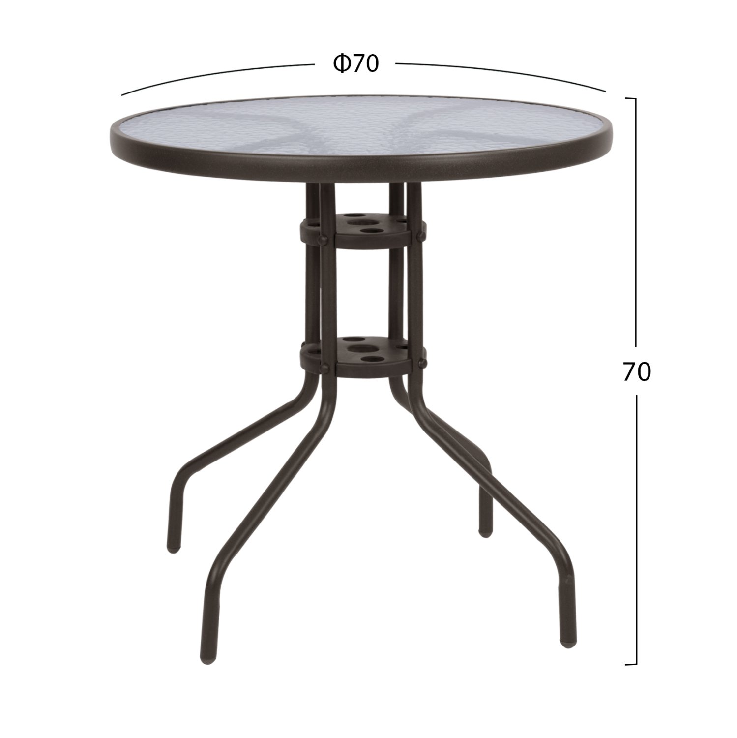Αυτό το σετ αποτελείται από 2 ΚΑΦΕ μεταλλικές καρέκλες με textilene στην πλάτη και το κάθισμα, κι ένα στρογγυλό τραπέζι σε ΚΑΦΕ χρώμα, με επιφάνεια από ημιδιάφανο γυαλί ασφαλείας. Η γυάλινη επιφάνεια στηρίζεται σε μια μεταλλική κολώνα με 4 πόδια με όμορφη καμπυλωτή διάταξη. Οι καρέκλες είναι ελαφριές και γενικά το σετ αυτό είναι ιδανικό για περιορισμένους χώρους, όπως μπαλκόνια και μικρές αυλές.