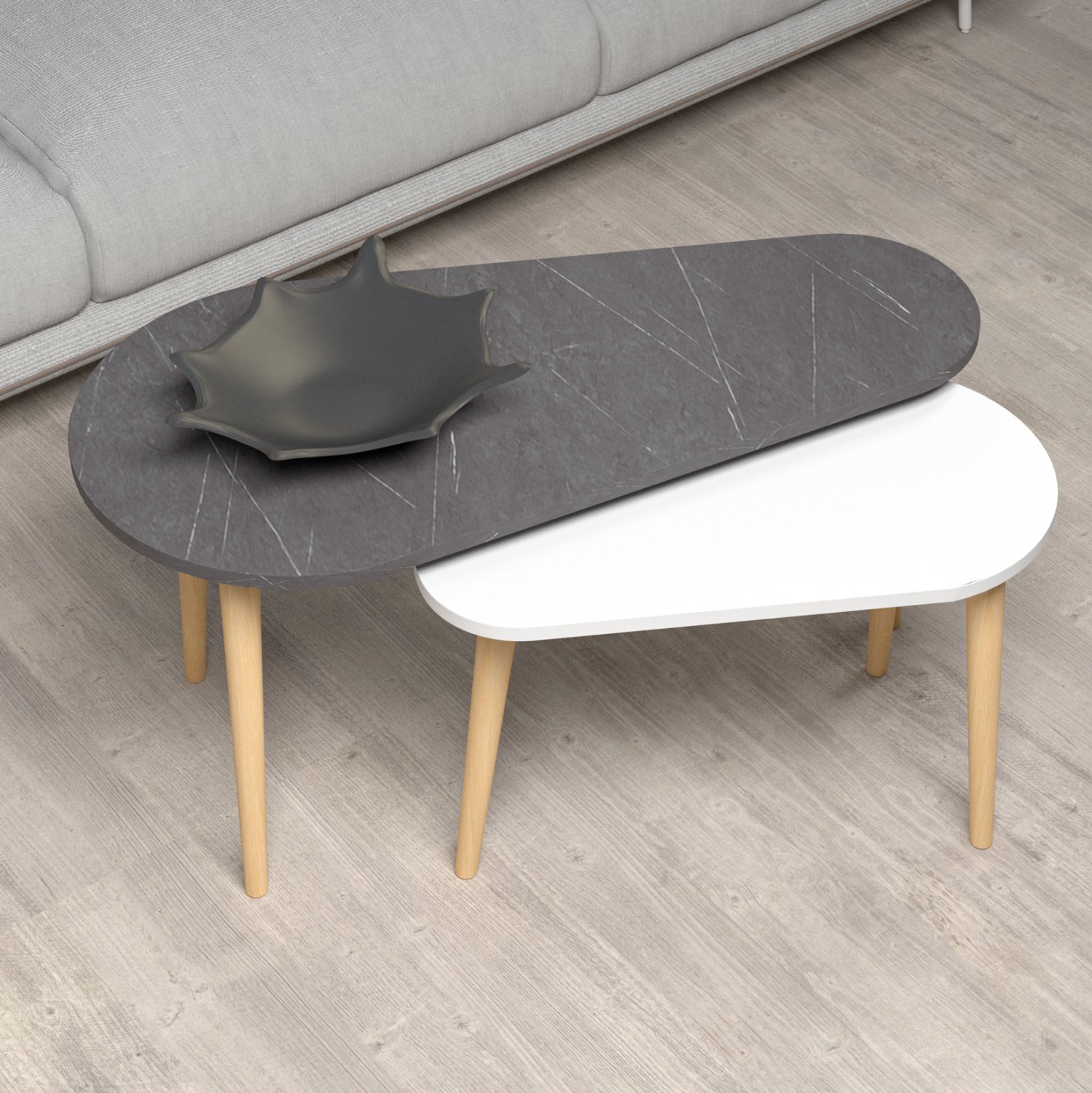 Το καινούργιο σετ 2τμχ οβάλ τραπεζιών για το σαλόνι APRILIA θα ικανοποιήσει και θα εξυπηρετήσει κάθε σας ανάγκη στο χώρο του σαλονιού. Πρόκειται για 2 τρίποδα τραπέζια με επιφάνεια από μελαμίνη 18mm σε χρωματισμό(όψη) ΜΑΥΡΟΥ ΜΑΡΜΑΡΟΥ το ένα και ΛΕΥΚΟ το μικρότερο, ενώ τα πόδια είναι ξύλινα σε ΦΥΣΙΚΟ χρώμα ξύλου.