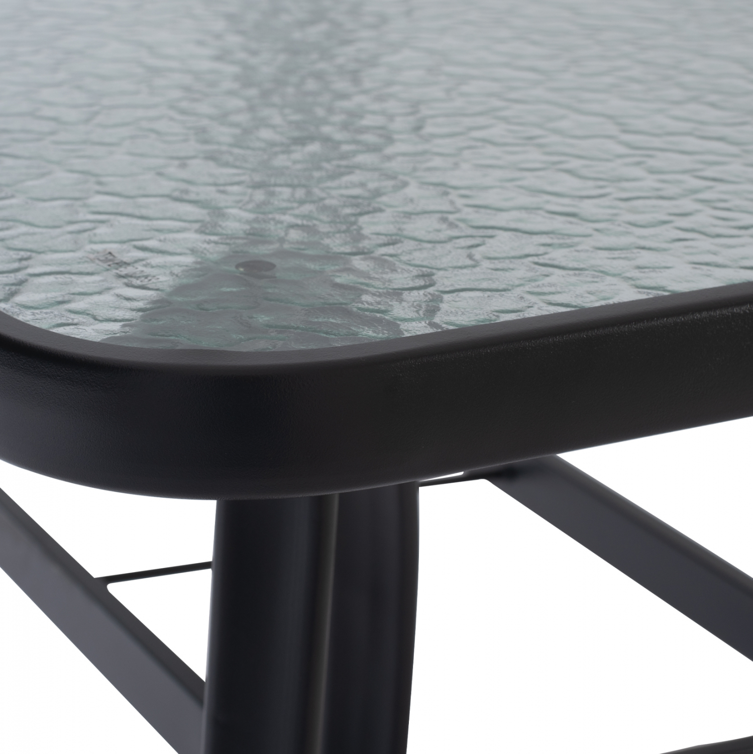 ΗΜ5021.11 Τραπέζι BRAVO εξωτερικού χώρου με ΓΚΡΙ μεταλλικό σκελετό και γυάλινη θολή επιφάνεια! Πρόκειται για πολύ δημοφιλές τραπέζι που δεν λείπει σχεδόν από κανέναν μπαλκόνι ή κήπο. Το BRAVO μάλιστα έρχεται και με τρύπα στο κέντρο για τοποθέτηση ομπρέλας. Είναι ορθογώνιο με γωνίες στρογγυλεμένες ενώ το γυαλί της επιφάνειας είναι ενισχυμένο.
