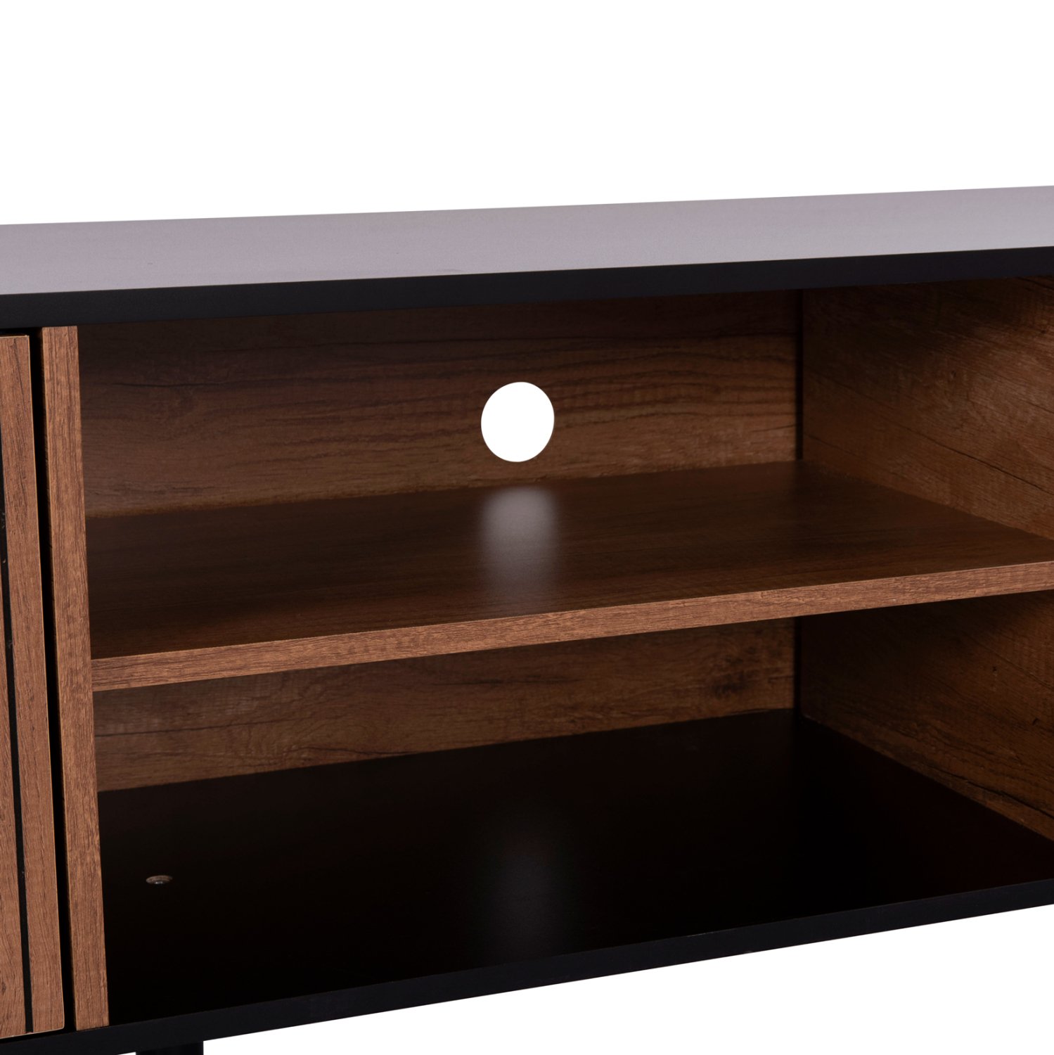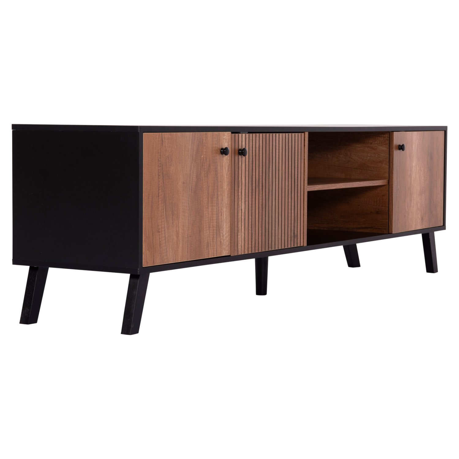 Το KRUDEN είναι ένα μοντέρνο και λειτουργικό έπιπλο τηλεόρασης, που θα ομορφύνει το σαλόνι σας! Είναι μακρύ και διαθέτει 2 ντουλάπια με ενιαίο χώρο. Ένα με διπλή πόρτα, κι ένα ακόμα με μονή πόρτα. Ανάμεσα σε αυτά, υπάρχει ανοιχτός χώρος τοποθέτησης αντικειμένων με ένα ράφι. Τα χρώματα του επίπλου είναι το μαύρο που είναι και το χρώμα της επιφάνειας, και το φυσικό του ξύλου που είναι το χρώμα στα ντουλάπια. Πρόκειται για μια κομψή και ολοκληρωμένη πρόταση για το σαλόνι σας!