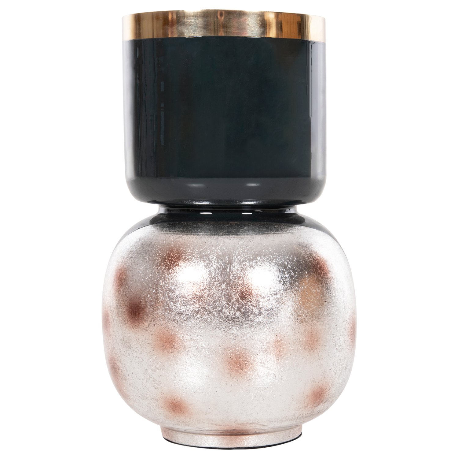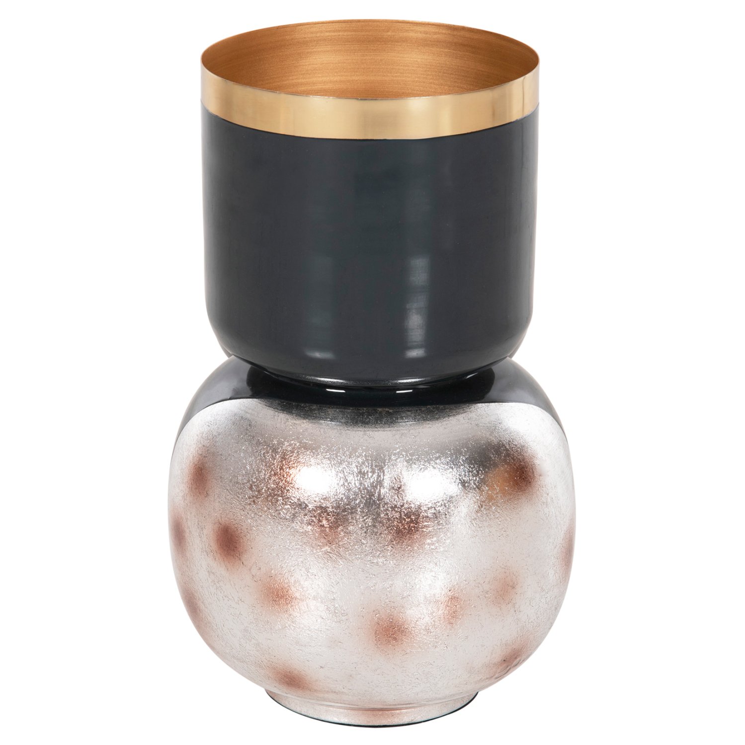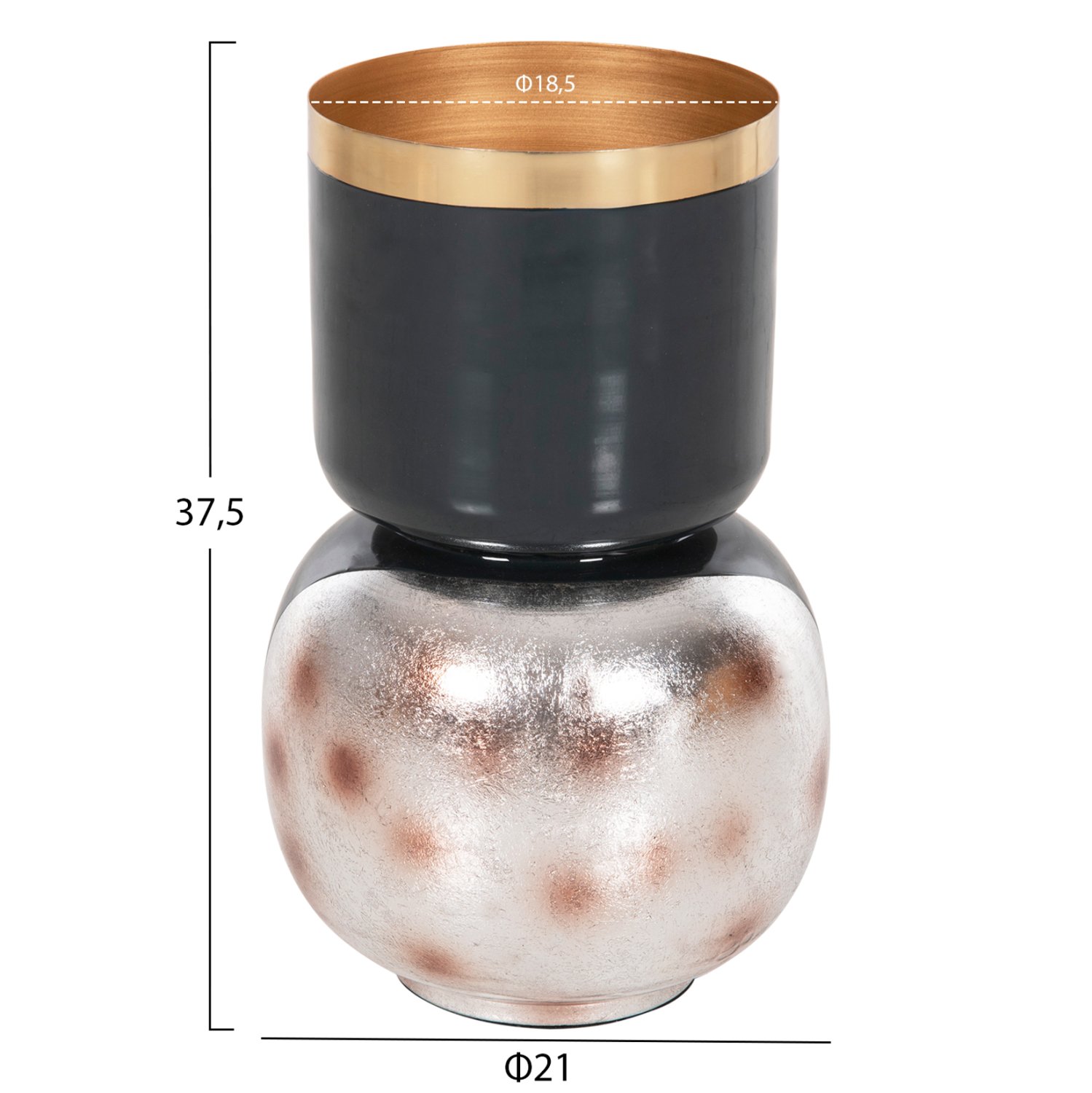 Το διακοσμητικό επιτραπέζιο βάζο LINGON είναι εξολοκλήρου μεταλλικό και αποτελείται από δύο μέρη. Την σχεδόν σφαιρική βάση και το βάζο με το μεγάλο στόμιο κολλημένο επάνω στην βάση. Το χρώμα του είναι ΜΠΛΕ ΑΝΘΡΑΚΙ με ΧΡΥΣΟ περιμετρικά στο στόμιο, ενώ η βάση είναι ΜΠΛΕ ΑΝΘΡΑΚΙ με brushed ΑΣΗΜΙ θολό χρώμα με θολό κόκκινο πουά χρωματισμό. Αυτό το βάζο θα ομορφύνει κάθε χώρο είτε στο σπίτι είτε στον επαγγελματικό σας χώρο.