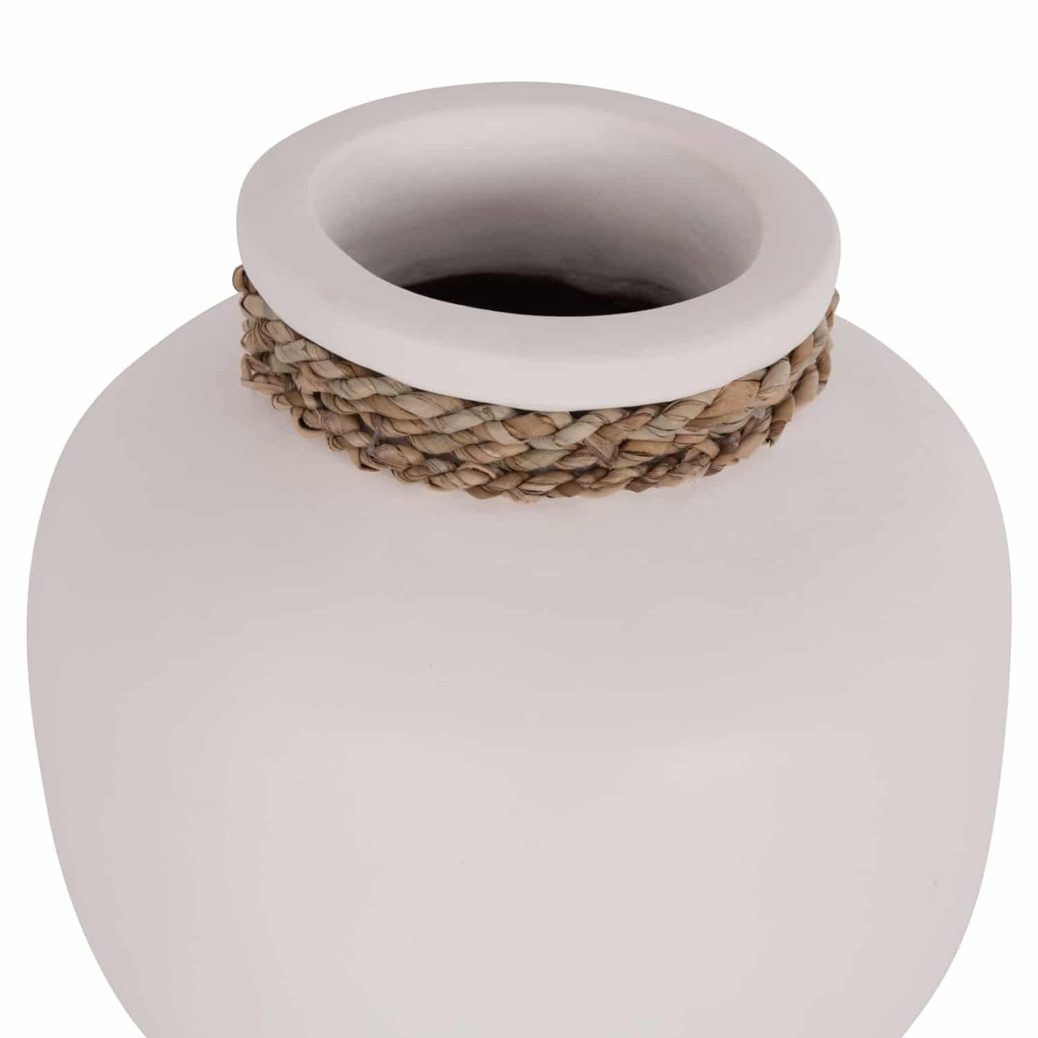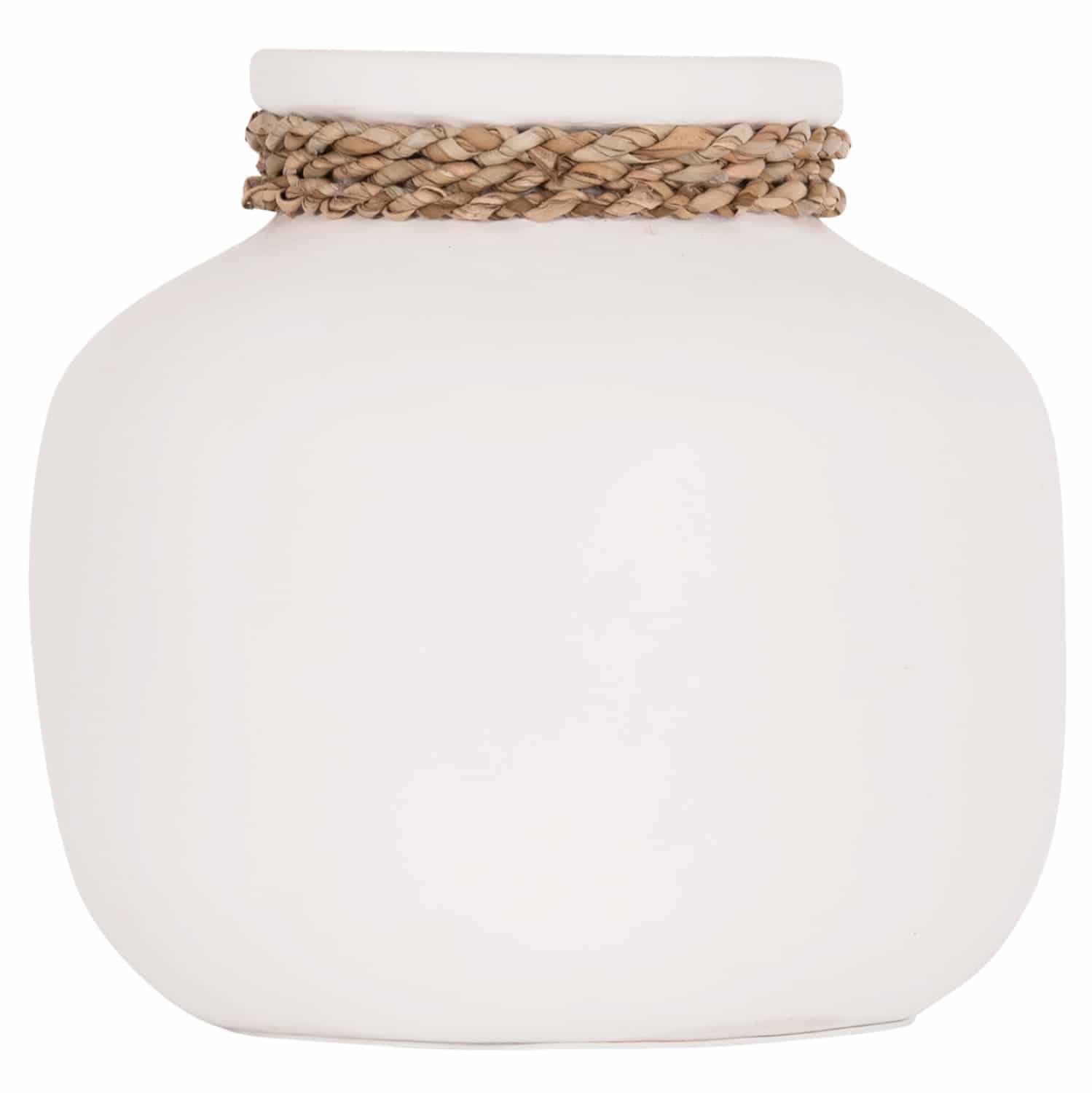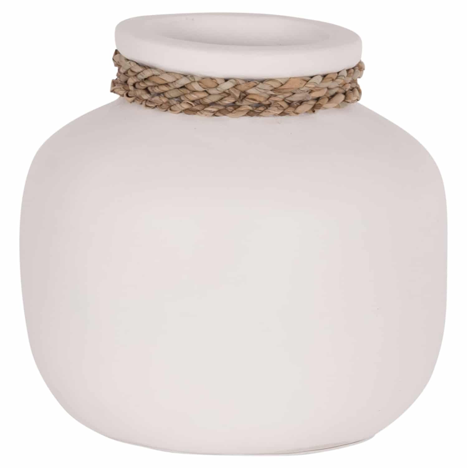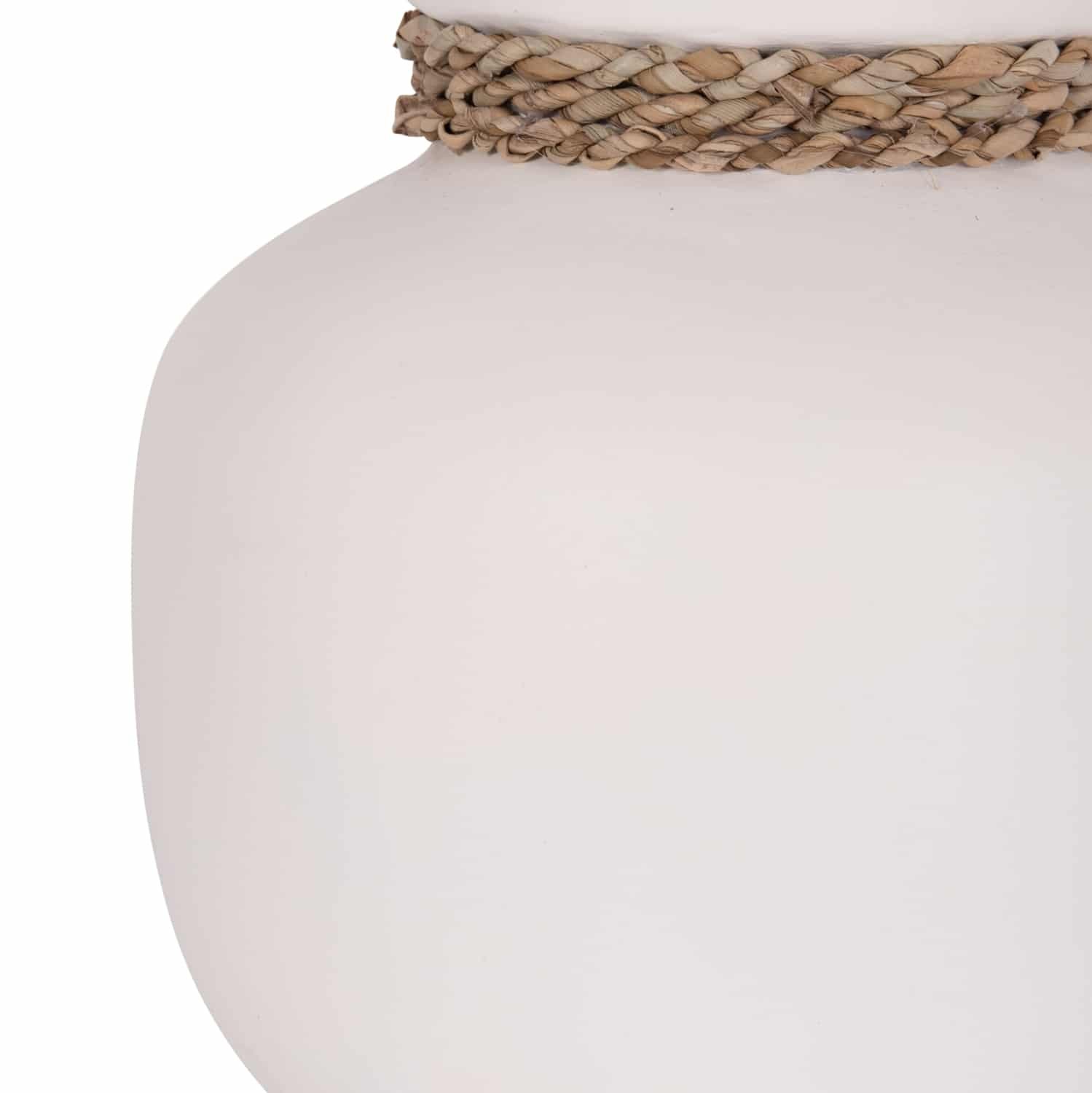 Το επιτραπέζιο χειροποίητο διακοσμητικό βάζο CAMMER είναι κατασκευασμένο εξολοκλήρου από τερακότα σε ΛΕΥΚΟ χρώμα ενώ διαθέτει διακοσμητική πλέξη από seagrass περιμετρικά στον «λαιμό» του βάζου. Ιδανικό για πληθώρα χώρων, τόσο για το σπίτι, όσο και για επαγγελματικούς χώρους.