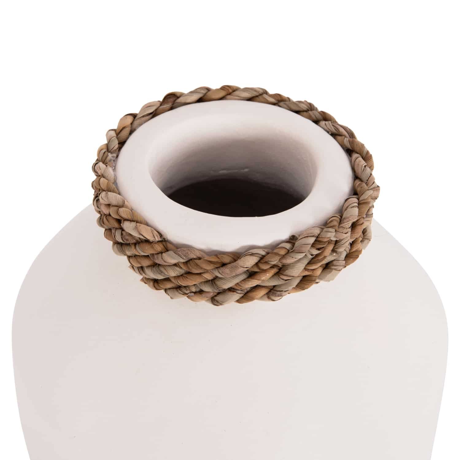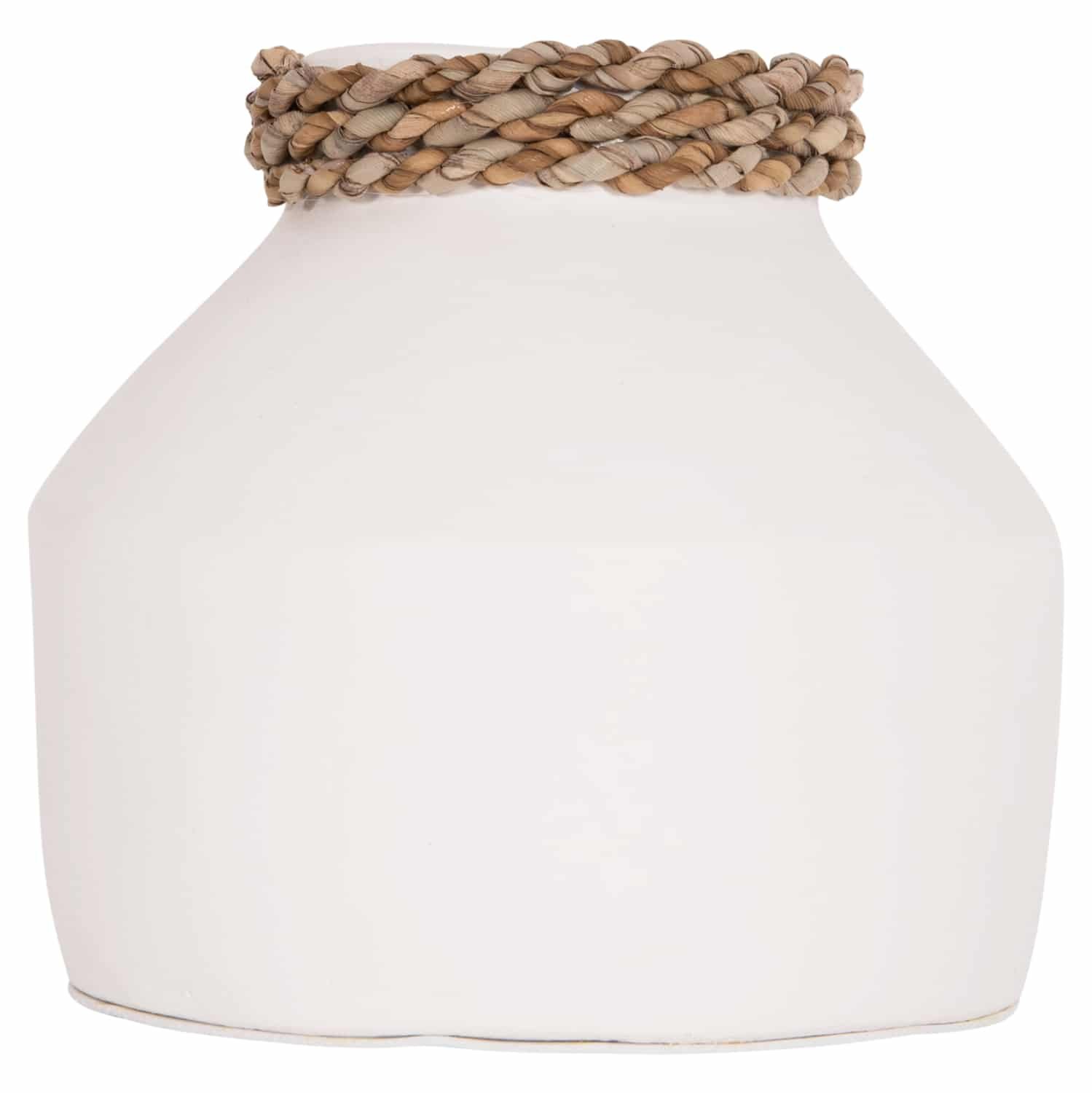 Το επιτραπέζιο χειροποίητο διακοσμητικό βάζο CAMMER είναι κατασκευασμένο εξολοκλήρου από τερακότα σε ΛΕΥΚΟ χρώμα ενώ διαθέτει διακοσμητική πλέξη από seagrass περιμετρικά στον «λαιμό» του βάζου. Ιδανικό για πληθώρα χώρων, τόσο για το σπίτι, όσο και για επαγγελματικούς χώρους.