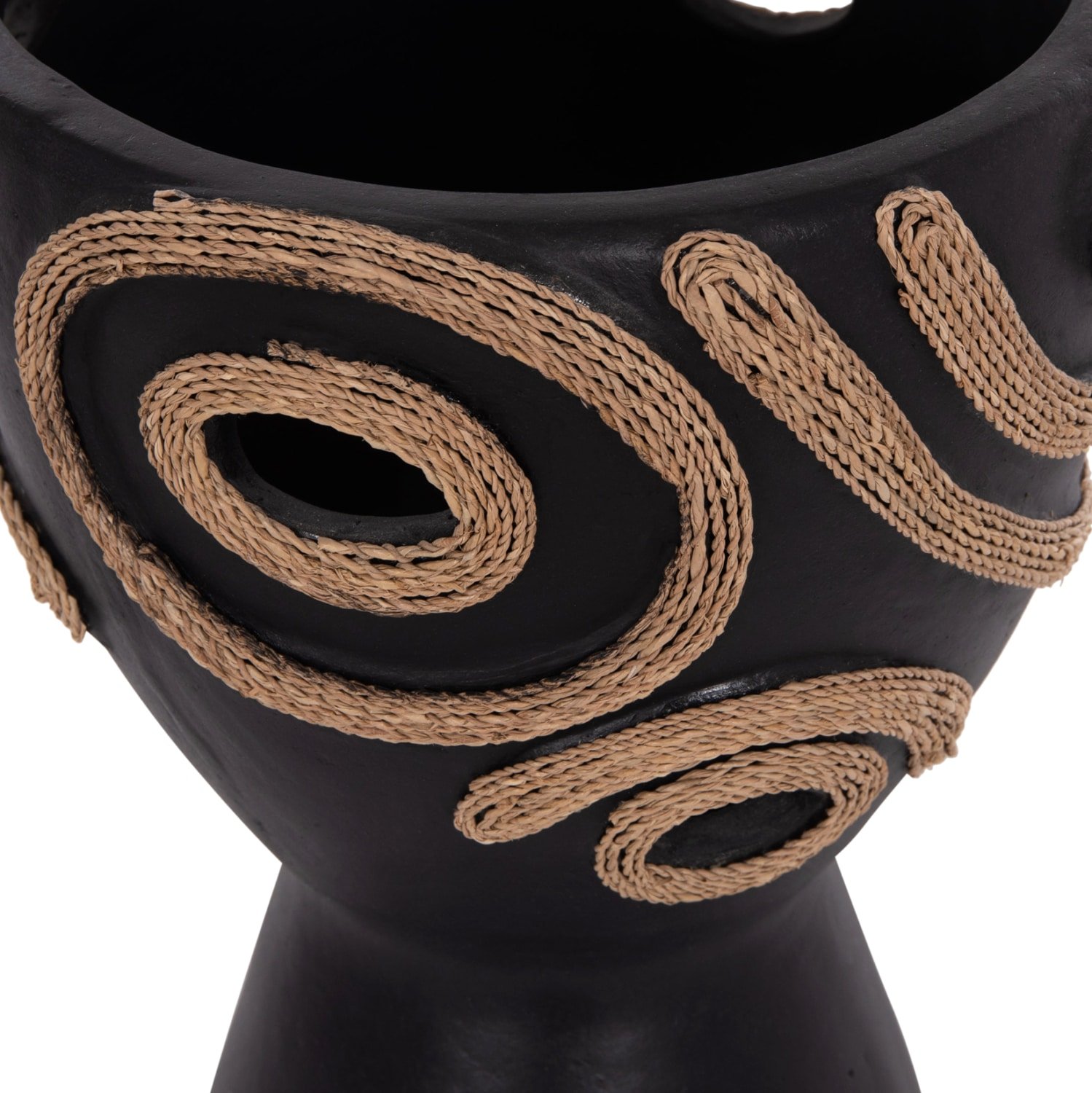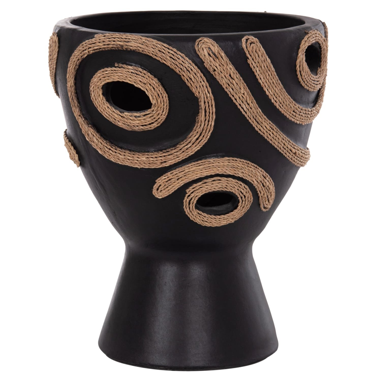 Το επιτραπέζιο χειροποίητο διακοσμητικό βάζο DEAN έχει το σχήμα μεγάλου κύπελλου. Είναι κατασκευασμένο εξολοκλήρου από τερακότα σε ΜΑΥΡΟ χρώμα ενώ διαθέτει διακοσμητικά σχέδια με σχοινί από ίνες φοίνικα κολλημένο στις πλευρές του βάζου. Ιδανικό για πληθώρα χώρων, τόσο για το σπίτι, όσο και για επαγγελματικούς χώρους.