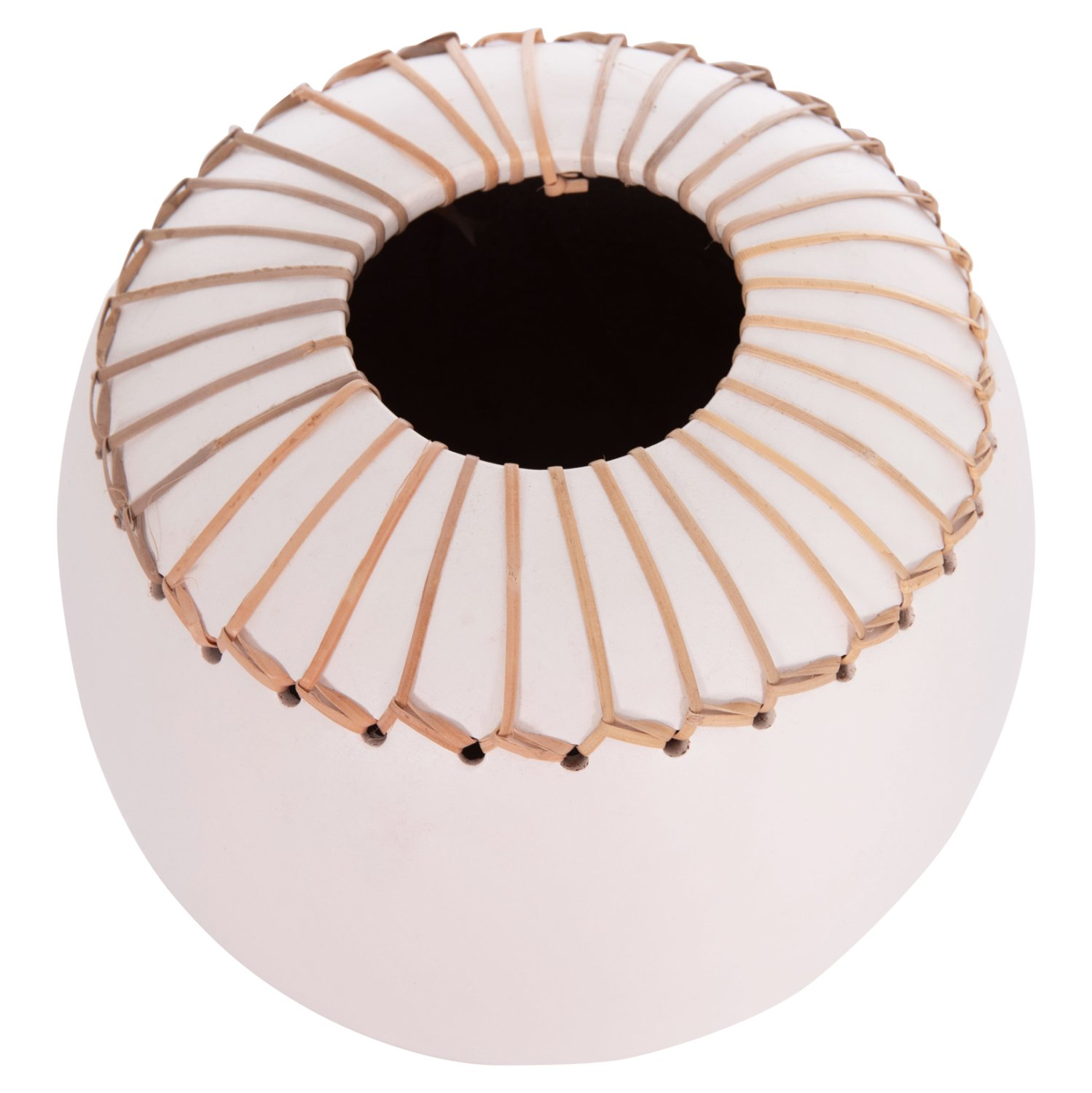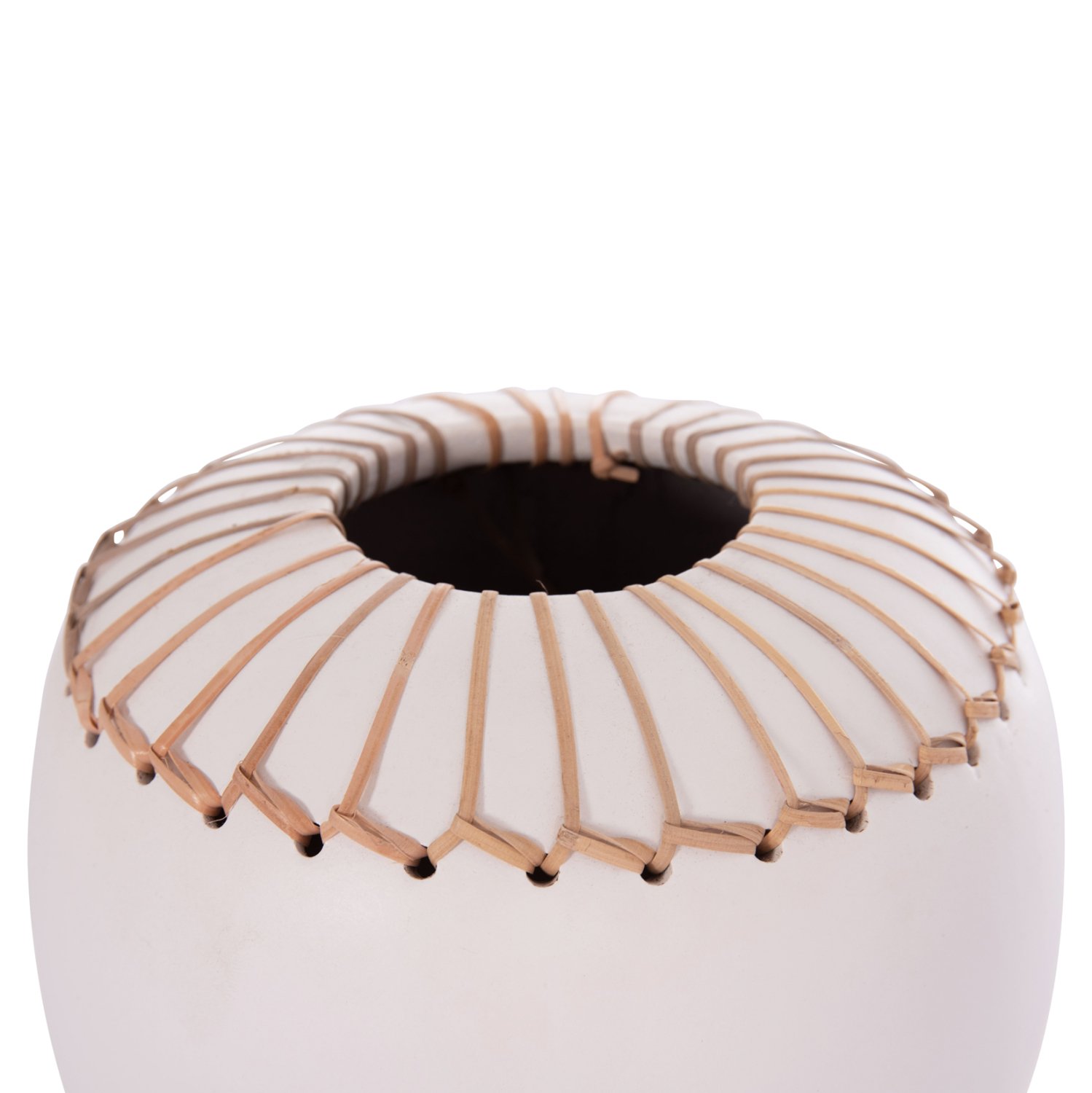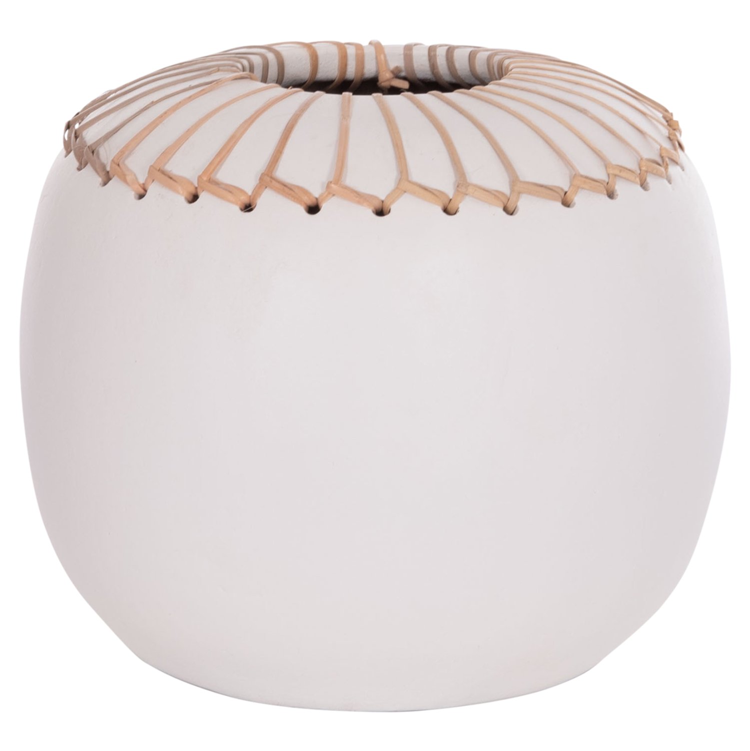 Το χειροποίητο επιτραπέζιο διακοσμητικό βάζο LENNOX είναι ένα όμορφο διακοσμητικό στοιχείο για κάθε χώρο. Είναι σχετικά κοντό αλλά φαρδύ και κατασκευασμένο εξολοκλήρου από τερακότα σε ΛΕΥΚΟ χρώμα ενώ το στόμιο είναι διακοσμημένο με μια πλέξη από φυσικό rattan. Ιδανικό για πληθώρα χρήσεων και χώρων.