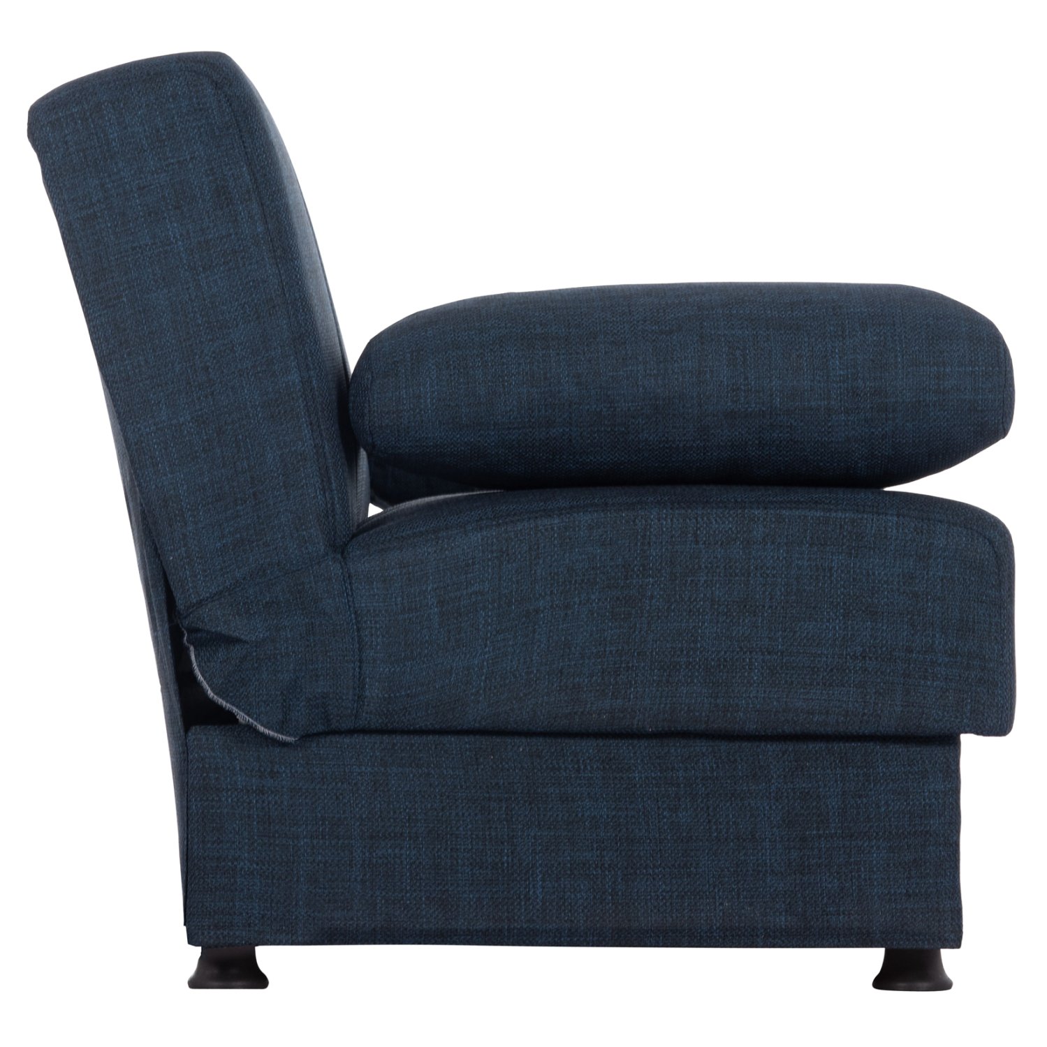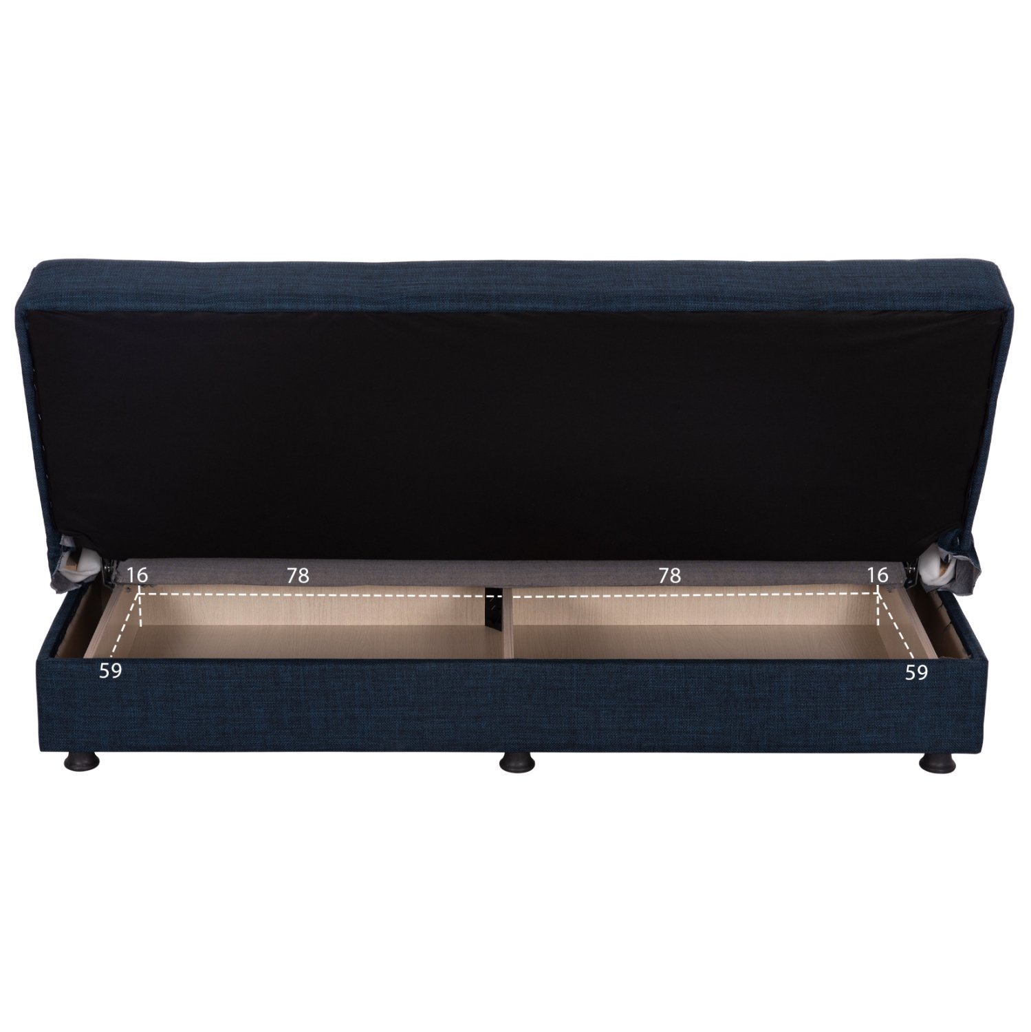 Ξεκινώντας από τα βασικά και τα προφανή, το χρώμα της επένδυσης με το εξαιρετικό και καλοραμμένο ανάγλυφο ύφασμα αυτού του καναπέ, είναι ΜΠΛΕ. Διαθέτει 2 μικρά μακρόστενα μαξιλάρια με το ίδιο ύφασμα που μπορούν να χρησιμοποιηθούν όπως θέλει ο καθένας. Χαρακτηριστικό αυτού του καναπέ είναι ότι δεν διαθέτει μπράτσα με αποτέλεσμα να μην περιορίζει την χρήση του από τους χρήστες του. Επίσης, γίνεται πολύ εύκολα κρεβάτι μέσω ενός εύχρηστου μηχανισμού (κλικ-κλακ) πολλαπλασιάζοντας την χρησιμότητά του. Κάτω από το κάθισμα του καναπέ υπάρχουν 2 αποθηκευτικοί χώροι με ενισχυμένο πάτωμα καθιστώντας τον ένα πραγματικό πολυεργαλείο, ειδικά για φοιτητικά σπίτια αλλά και σπίτια με περιορισμένο γενικά χώρο.