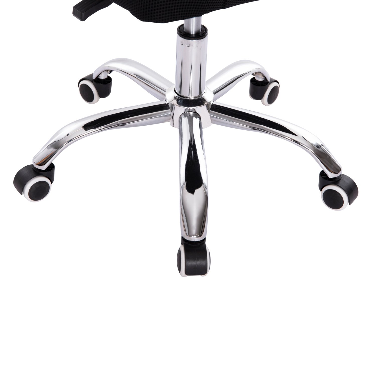 Τέλος, τα πόδια καταλήγουν στους μαύρους τροχίσκους της καρέκλας με λευκή ρίγα που είναι επίσης από ειδικό nylon υλικό και επιφάνεια κύλισης από μαλακή πολυουρεθάνη για αθόρυβη κύλιση και ταυτόχρονα προστασία του πατώματος.
