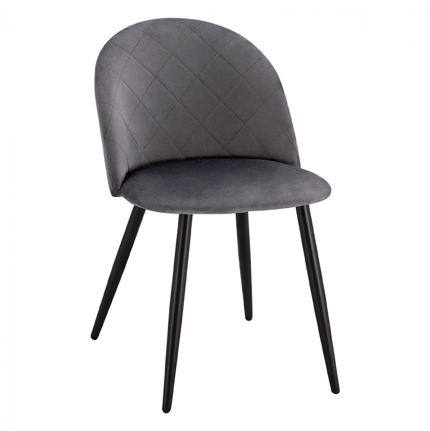 Καρέκλα επενδυμένη με ύφασμα βελούδο σε γκρι απόχρωση και μεταλλικό μαύρο σκελετό.