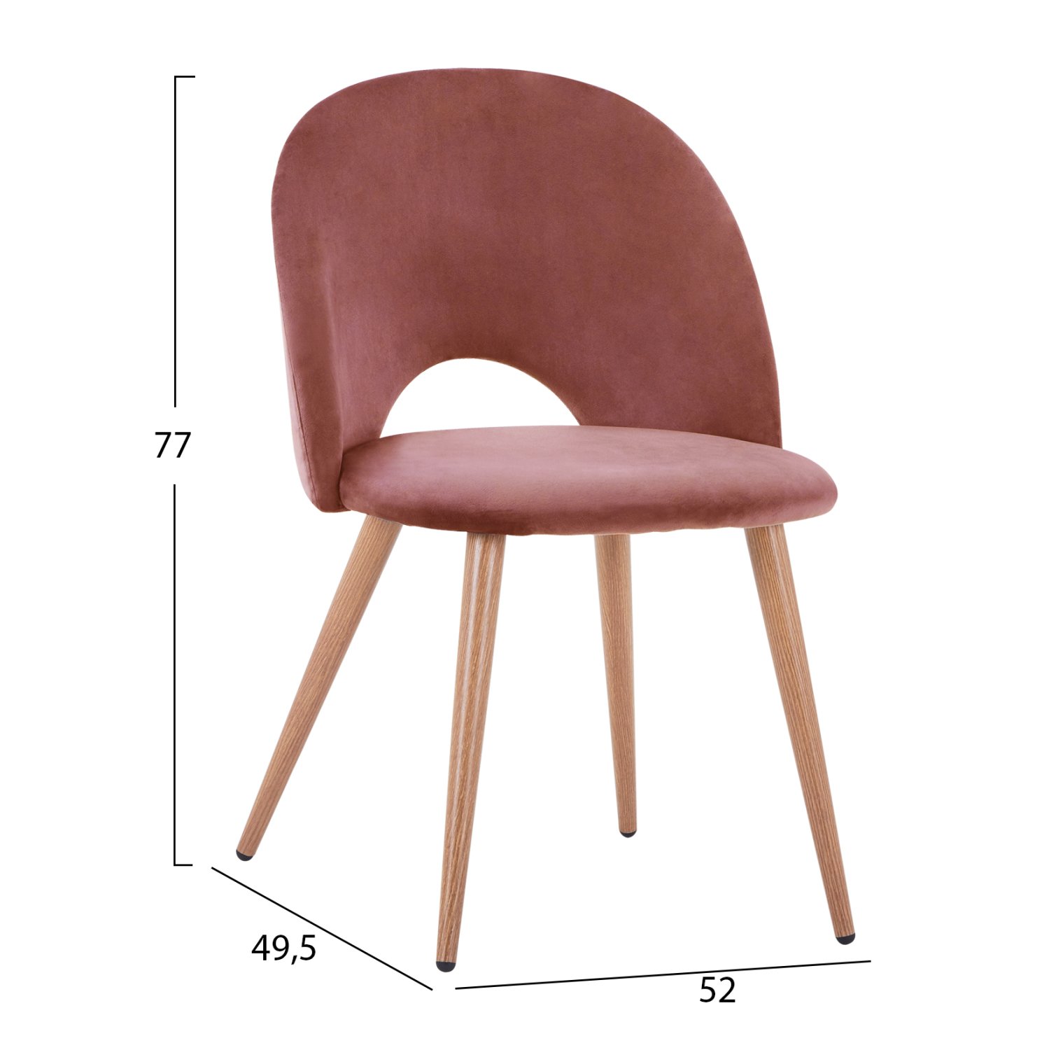 Καρέκλαι SADIE επενδυμένη με βελούδο σε απόχρωση σάπιο μήλο. Τα πόδια είναι μεταλλικά, βαμμένα έτσι ώστε να αποδίδουν την όψη του ξύλου.