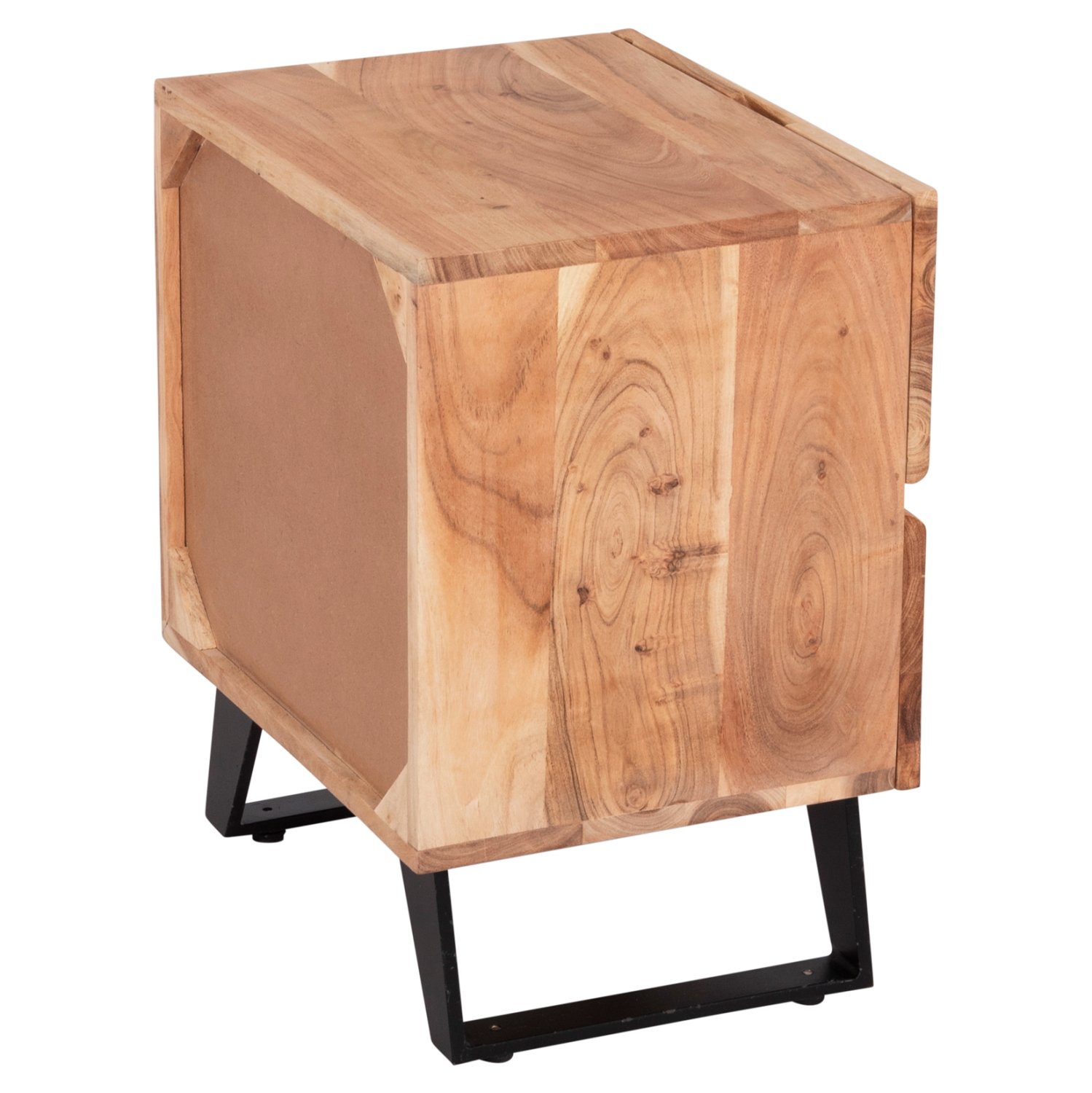 Κομοδίνο από μασίφ ξύλο Ακακίας σε φυσική απόχρωση και μεταλλικά πόδια σε μαύρο χρώμα.