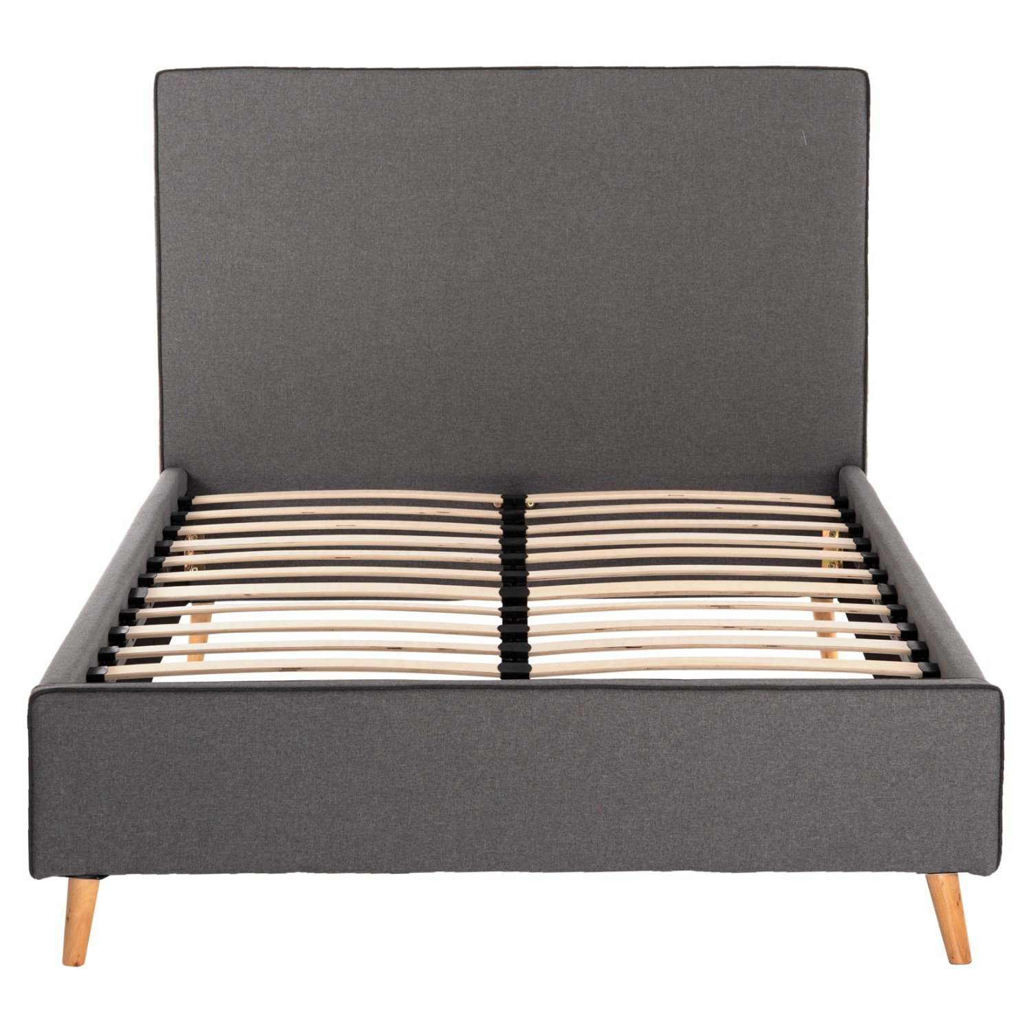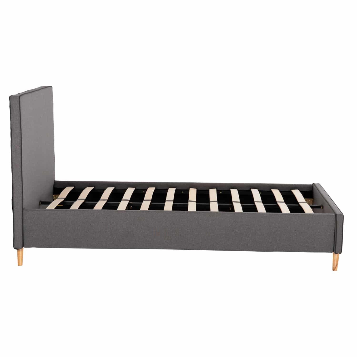 Το ημίδιπλο κρεβάτι MAYLIN είναι επενδυμένο με ποιοτικό ύφασμα σε ΓΚΡΙ χρώμα με πιο σκούρο ρέλι στις ραφές. Το στρώμα (διατίθεται σε ROLL-PACKING*) που συνοδεύει το κρεβάτι τοποθετείται σε δύο σειρές ανατομικές τάβλες, είναι διπλής όψης και είναι ΑΦΡΟΥ χωρίς ελατήρια. Τα πόδια είναι ξύλινα σε φυσικό χρώμα.