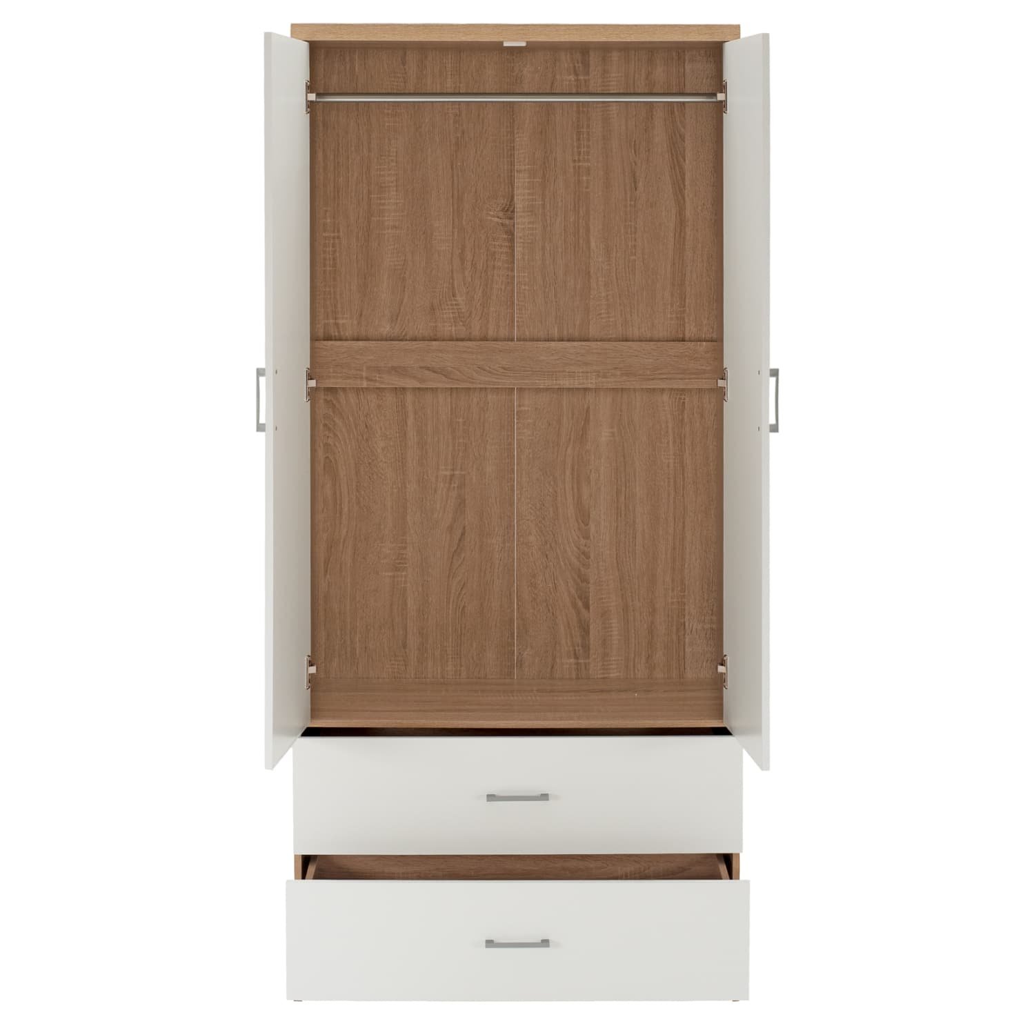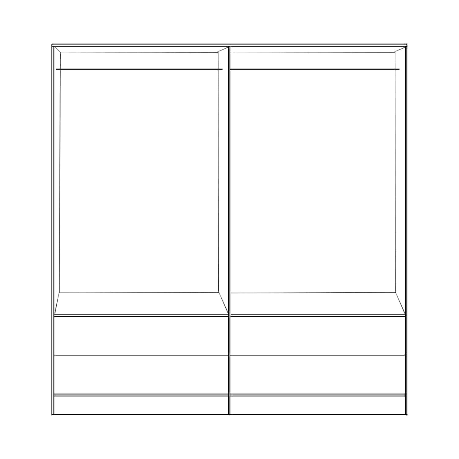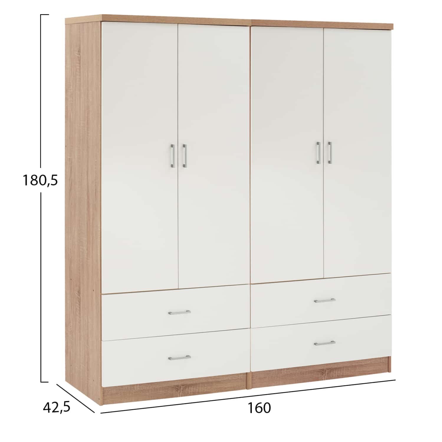 Γνωρίστε την 4-φυλλη ντουλάπα-γκαρνταρόμπα REINA. Πρόκειται για μια μεγάλη ντουλάπα με 4 πόρτες, και στο εσωτερικό της υπάρχει μόνο μια INOX μπάρα για κρέμαση ρούχων. Κάτω ακριβώς από τον χώρο της γκαρνταρόμπας υπάρχουν και 4 ευρύχωρα συρτάρια. Οι πόρτες αλλά και τα συρτάρια ανοίγουν με καλαίσθητα ασημί χερούλια. Είναι κατασκευασμένη από μελαμίνη σε ΛΕΥΚΟ-SONAMA χρώμα και αισθητικά μπορεί να ταιριάξει με πολλά άλλα στυλ, χάρη και στις «καθαρές» γραμμές της.