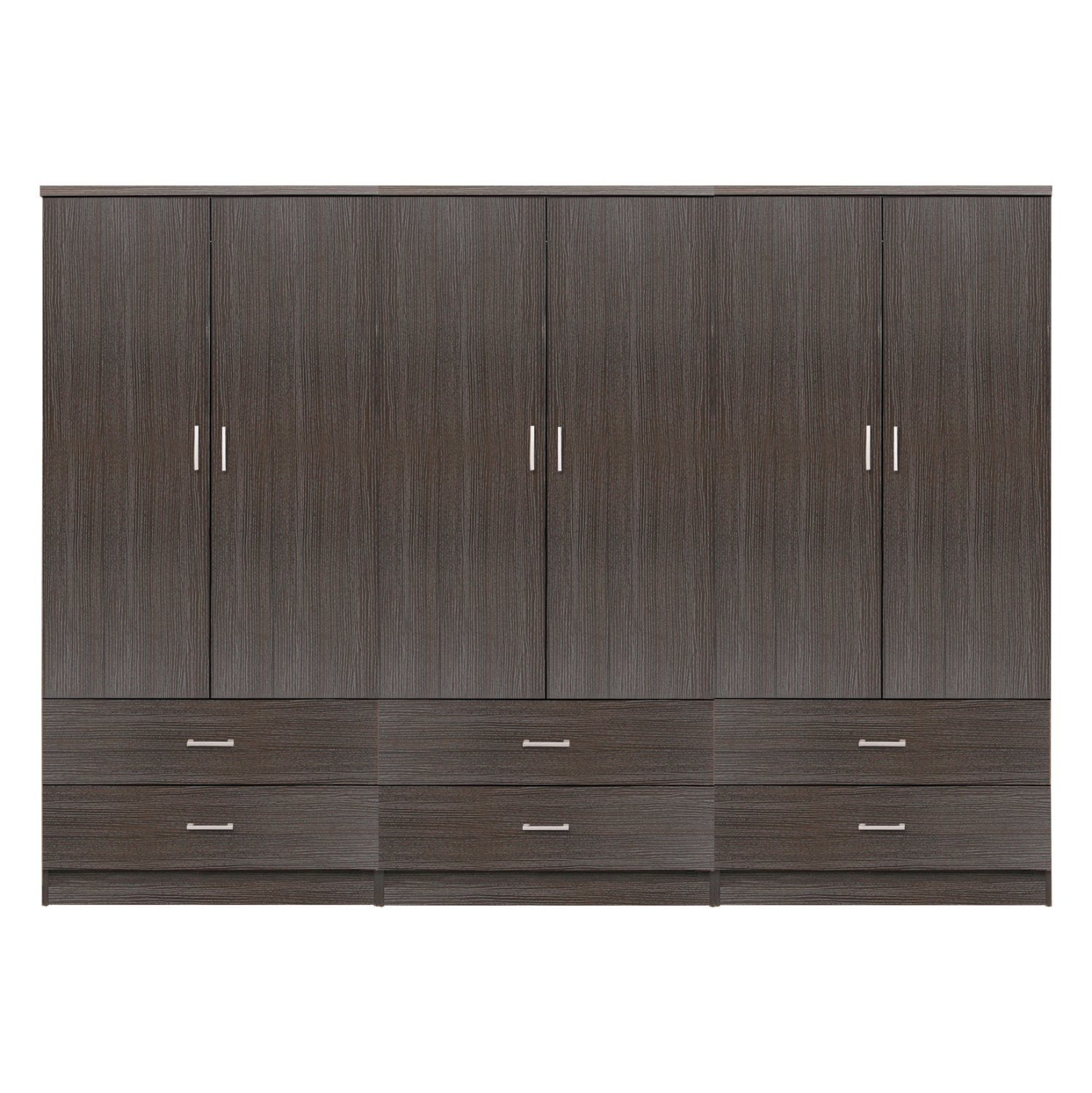 Γνωρίστε την 6-φυλλη ντουλάπα-γκαρνταρόμπα REINA. Πρόκειται για μια μεγάλη ντουλάπα με 6 πόρτες, και στο εσωτερικό της υπάρχει μόνο μια INOX μπάρα για κρέμαση ρούχων. Κάτω ακριβώς από τον χώρο της γκαρνταρόμπας υπάρχουν και 6 ευρύχωρα συρτάρια. Οι πόρτες αλλά και τα συρτάρια ανοίγουν με καλαίσθητα ασημί χερούλια. Είναι κατασκευασμένη από μελαμίνη σε ZEBRANO χρώμα και αισθητικά μπορεί να ταιριάξει με πολλά άλλα στυλ, χάρη και στις «καθαρές» γραμμές της.