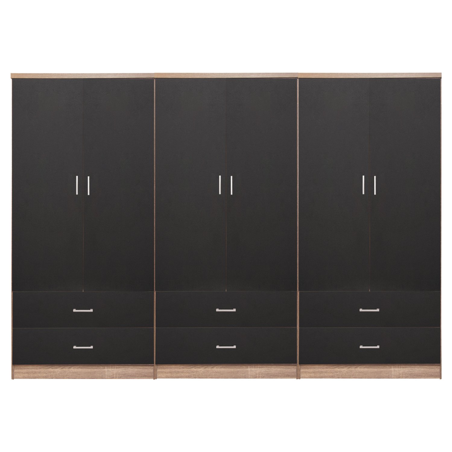 Γνωρίστε την 6-φυλλη ντουλάπα-γκαρνταρόμπα REINA. Πρόκειται για μια μεγάλη ντουλάπα με 6 πόρτες, και στο εσωτερικό της υπάρχει μόνο μια INOX μπάρα για κρέμαση ρούχων. Κάτω ακριβώς από τον χώρο της γκαρνταρόμπας υπάρχουν και 6 ευρύχωρα συρτάρια. Οι πόρτες αλλά και τα συρτάρια ανοίγουν με καλαίσθητα ασημί χερούλια. Είναι κατασκευασμένη από μελαμίνη σε ΓΚΡΙ-ΣΟΝΑΜΑ χρώμα και αισθητικά μπορεί να ταιριάξει με πολλά άλλα στυλ, χάρη και στις «καθαρές» γραμμές της.
