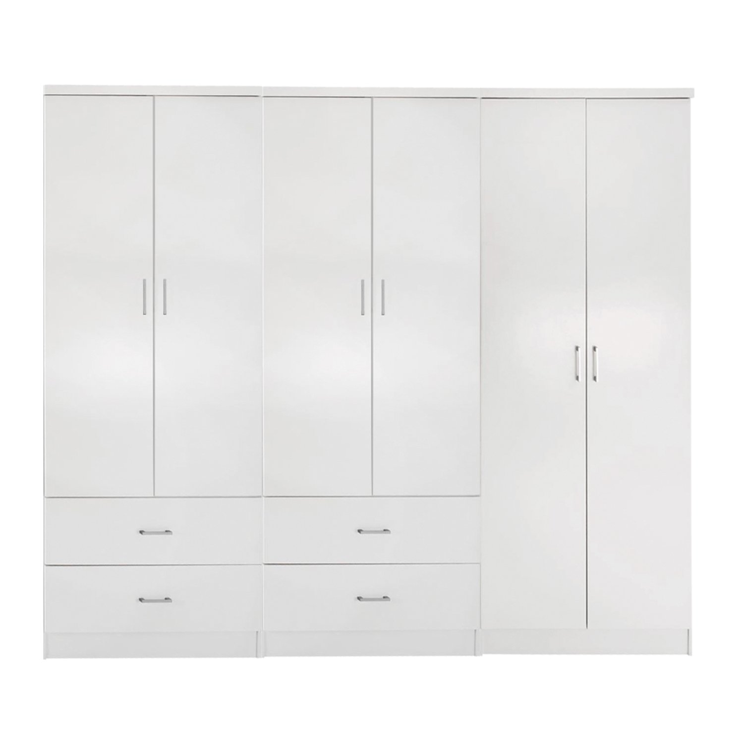 Γνωρίστε άλλη μία εκδοχή της ντουλάπας-γκαρνταρόμπας REINA. Πρόκειται για μια μεγάλη ντουλάπα με 6 πόρτες, χωρισμένη σε δύο μέρη. Η μία πλευρά διαθέτει μπάρα για κρέμαση ρούχων και 4 συρτάρια στο κάτω μέρος. Η άλλη πλευρά διαθέτει επίσης μπάρα για κρέμαση ρούχων και ένα ράφι πάνω από την μπάρα. Οι πόρτες αλλά και τα συρτάρια ανοίγουν με καλαίσθητα ασημί χερούλια. Είναι κατασκευασμένη από μελαμίνη σε ΛΕΥΚΟ χρώμα και αισθητικά μπορεί να ταιριάξει με πολλά άλλα στυλ, χάρη και στις «καθαρές» γραμμές της.