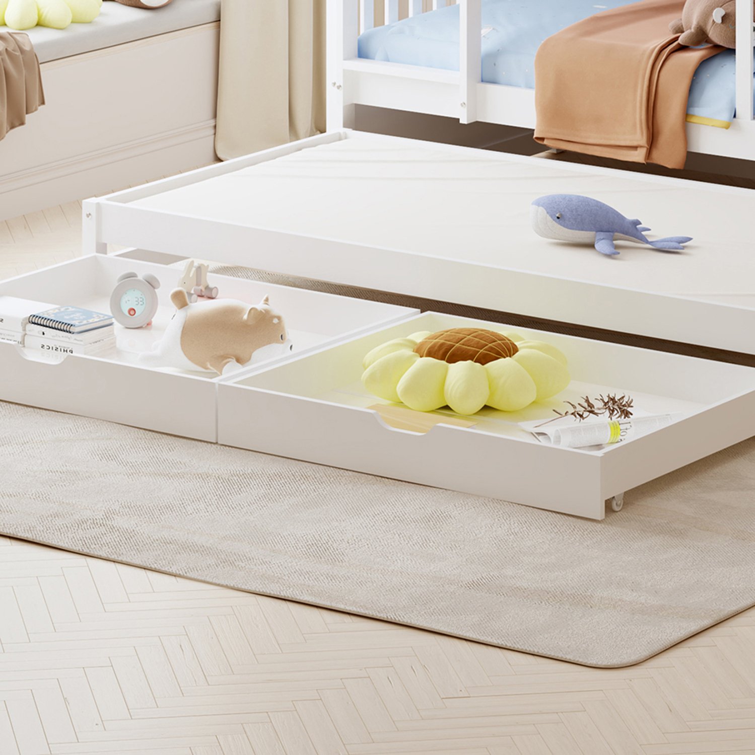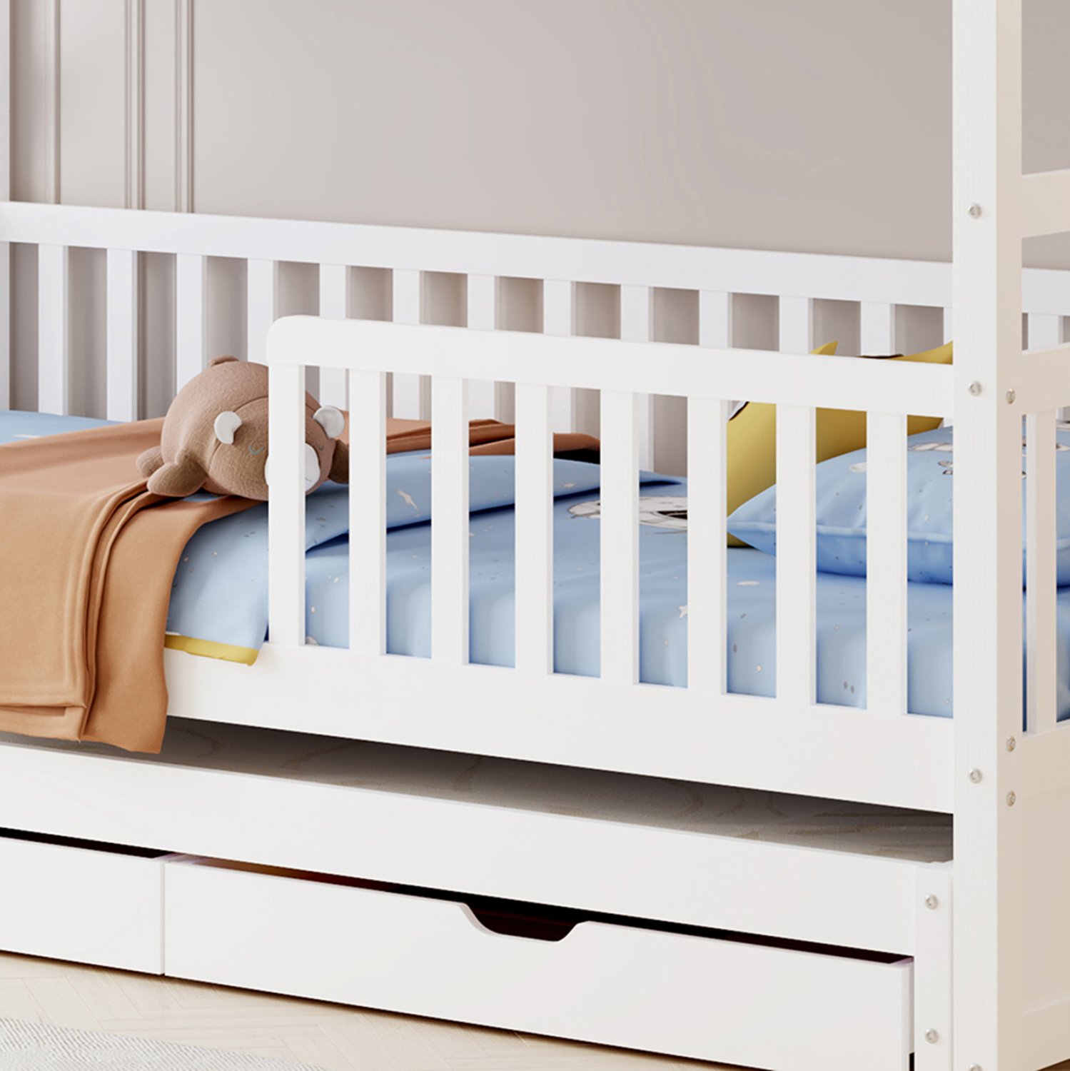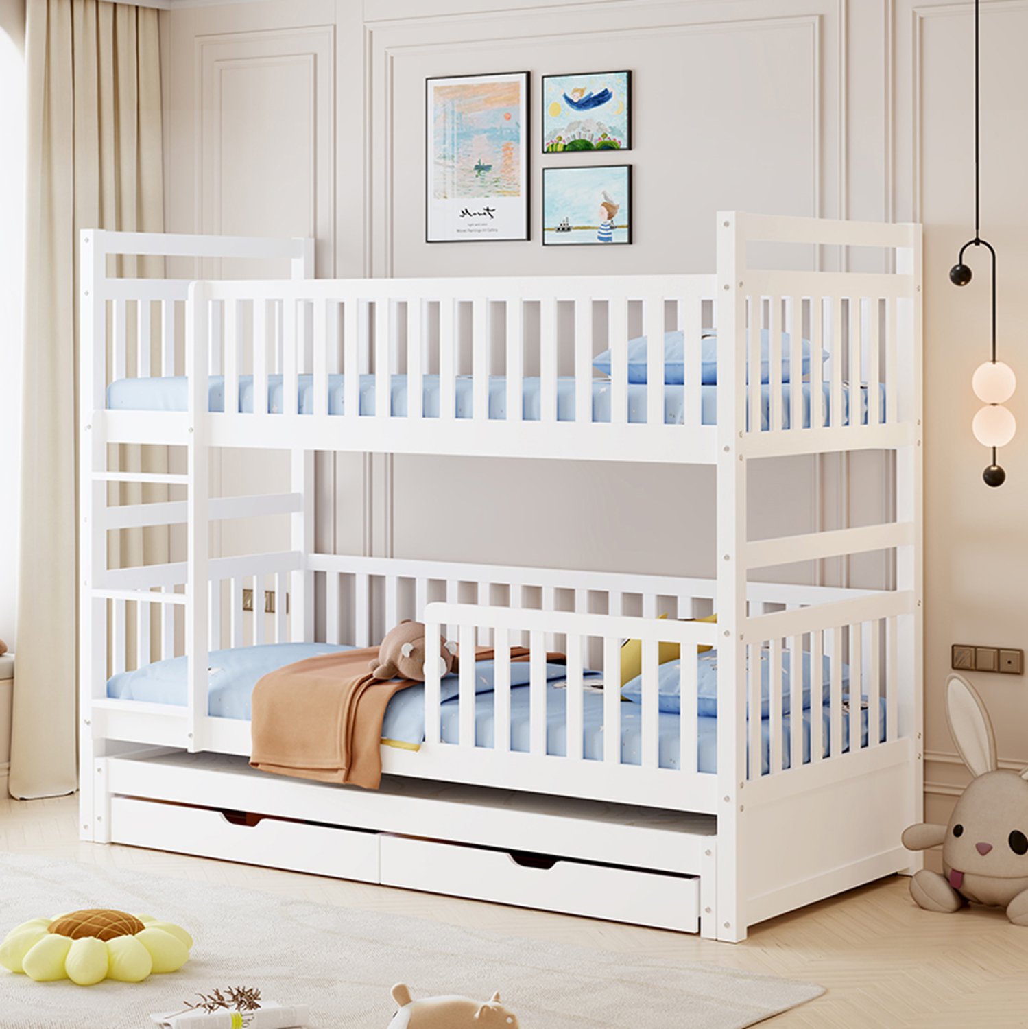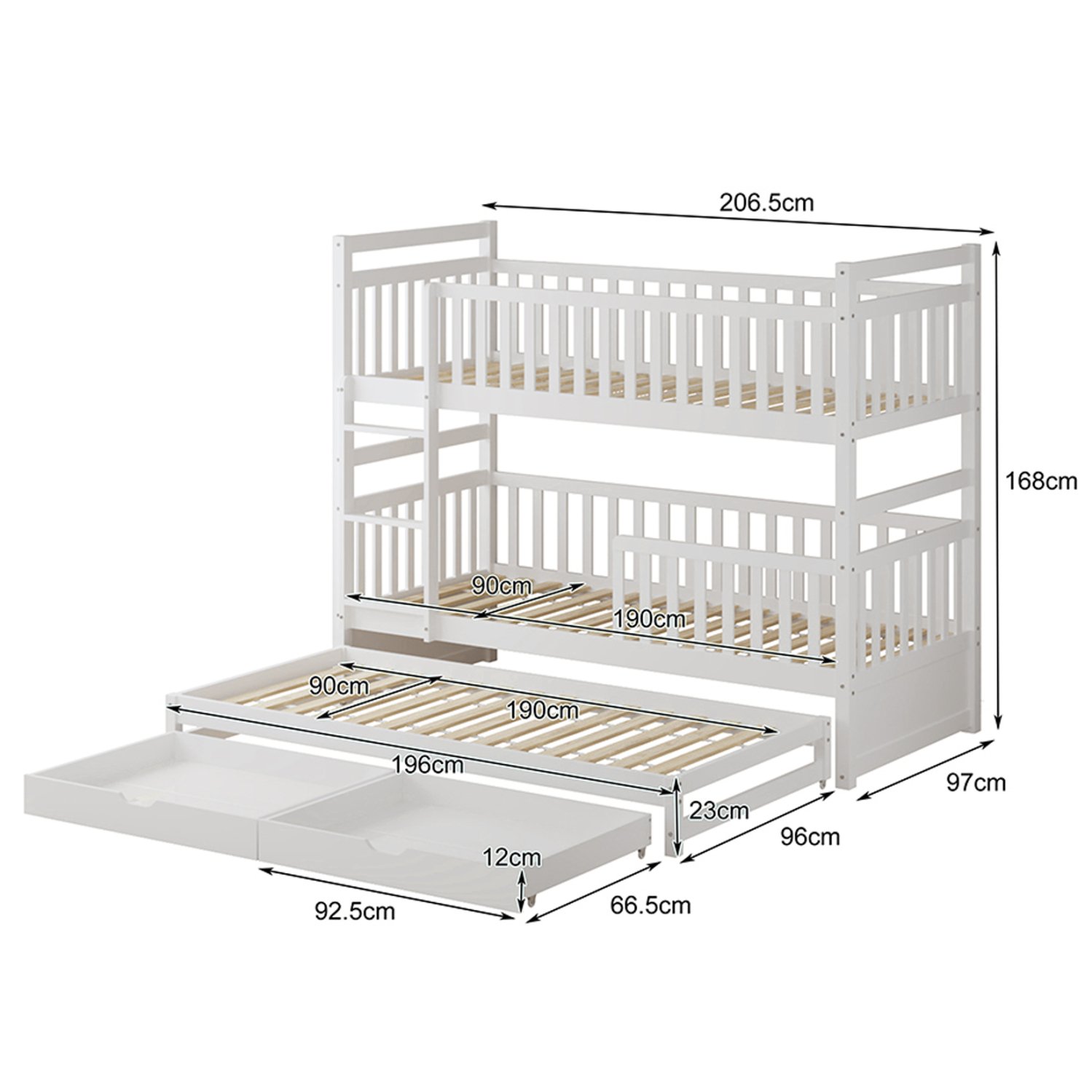 Σας παρουσιάζουμε το καινούργιο παιδικό κρεβάτι-κουκέτα TRIPLON σε διάσταση για μονά στρώματα 90×190 & 200 εκ, και αποτελεί μια άριστης ποιότητας, μοντέρνα και ασφαλή επιλογή για το παιδικό δωμάτιο. Είναι ξύλινο σε ΛΕΥΚΟ χρώμα βαμμένο με αβλαβές μη τοξικό βερνίκι με βάση το νερό, ιδανικό για παιδιά. Τα στρώματα τοποθετούνται σε τάβλες κατασκευασμένες από ξυλεία κόντρα πλακέ. Η πρόσβαση στο επάνω κρεβάτι γίνεται με πρακτική κάθετη σκάλα, ενώ και τα δύο κρεβάτια διαθέτουν περιμετρικά κάγκελα. Ωστόσο, αυτή η κουκέτα ξεχωρίζει για το γεγονός ότι έχει και ένα ακόμα κρεβάτι που είναι συρόμενο και τοποθετείται στο κάτω μέρος της κουκέτας, όπως και 2 συρτάρια στα οποία μπορείτε να τοποθετήσετε οτιδήποτε χρειαστεί. Μια ιδανική πρόταση για σπίτια με περιορισμένο χώρο.