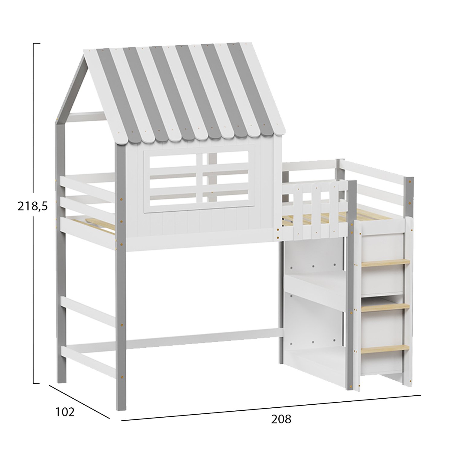 Το HOMI είναι ένα κρεβάτι-κουκέτα με σχήμα σπιτάκι τύπου Montessori που σημαίνει ότι έχει σχεδιαστεί σύμφωνα με το εκπαιδευτικό σύστημα Montessori, σύμφωνα με το οποίο τα παιδιά μαθαίνουν καλύτερα, όταν επιλέγουν μόνα τους τι θα κάνουν, σε διάσταση για μονό στρώμα 90×190 εκ, και αποτελεί μια άριστης ποιότητας, μοντέρνα και ασφαλή επιλογή για το παιδικό δωμάτιο. Είναι ξύλινο σε ΛΕΥΚΟ και ΓΚΡΙ χρώμα βαμμένο με αβλαβές μη τοξικό βερνίκι με βάση το νερό, ιδανικό για παιδιά. Το στρώμα τοποθετείται σε τάβλες κατασκευασμένες από ξυλεία κόντρα πλακέ. Η πρόσβαση στο κρεβάτι γίνεται με πρακτική κάθετη σκάλα, ενώ το κάτω μέρος είναι άδειο (δίνοντάς σας την δυνατότητα να εκμεταλλευτείτε τον χώρο όπως εσείς επιθυμείτε) με δύο ράφια τοποθετημένα στην δεξιά πλευρά πίσω από την σκάλα. Μια ιδανική πρόταση για δωμάτια με περιορισμένο χώρο.