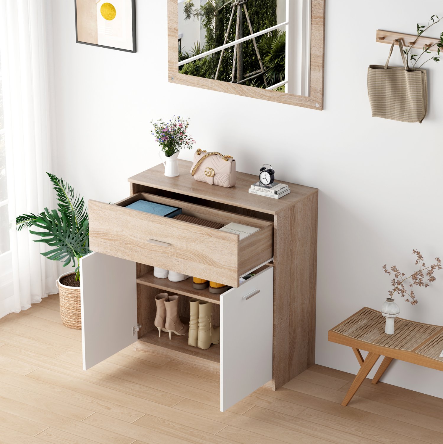 Σας παρουσιάζουμε την παπουτσοθήκη μελαμίνης DIONNE σε SONAMA και ΛΕΥΚΟ χρώμα. Ένα έπιπλο με κλασικό σχεδιασμό ντουλαπιού, που εκτός από χώρο αποθήκευσης παπουτσιών, διαθέτει και συρτάρι για να αποθηκεύετε οτιδήποτε χρειαστείτε. Ο χώρος αποθήκευσης διαθέτει ένα ράφι που δημιουργεί 2 χώρους τοποθέτησης παπουτσιών και κλείνει με δύο πόρτες με όμορφα ασημί χερούλια. Σκοπός μας είναι να σας βοηθήσουμε να οργανώσετε και να βελτιώσετε με τον καλύτερο δυνατό τρόπο την λειτουργικότητα του σπιτιού σας.