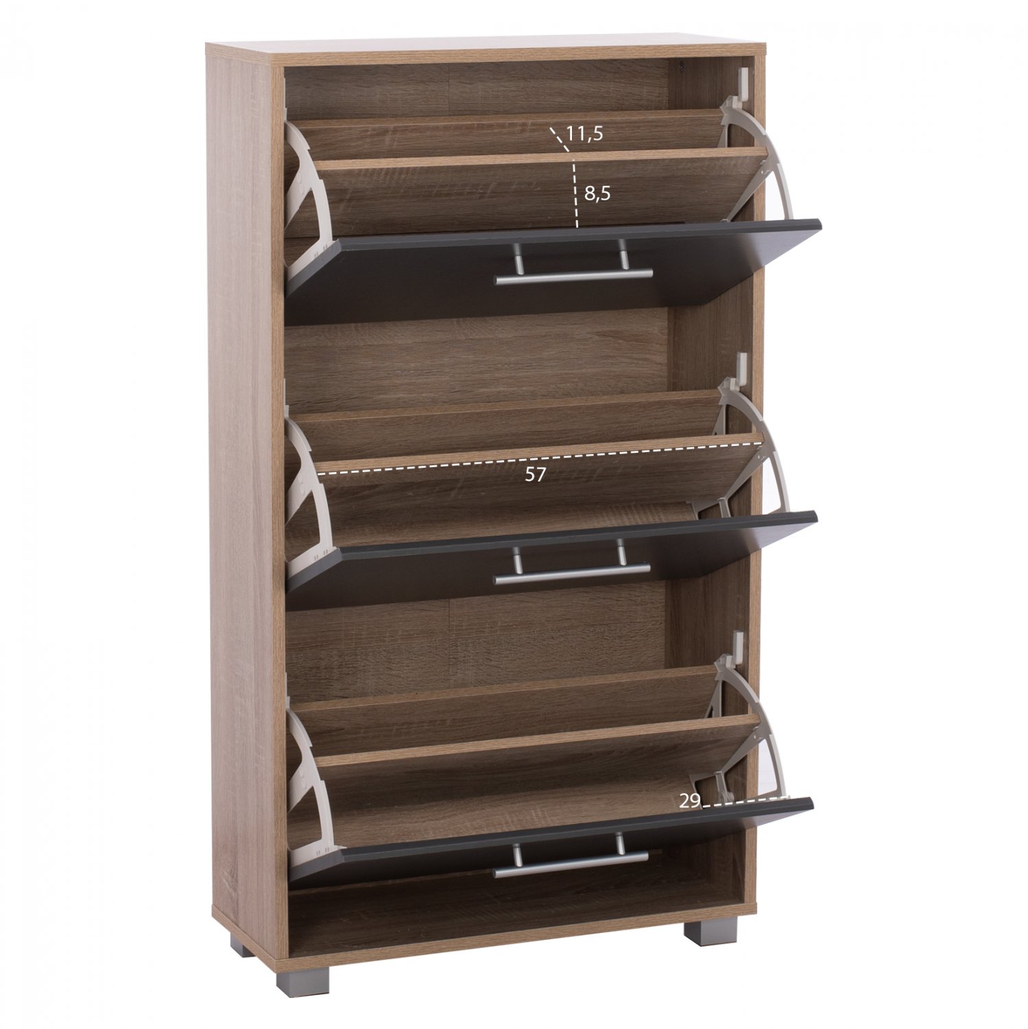 Διαθέτει τρια ανακλινόμενα ντουλάπια που χωράνε 18-21 ζευγάρια παπούτσια, κάθε ντουλάπι διαθέτει εσωτερικά ένα ράφι, δημιουργώντας δύο ράφια για τοποθέτηση παπουτσιών σε κάθε πόρτα.