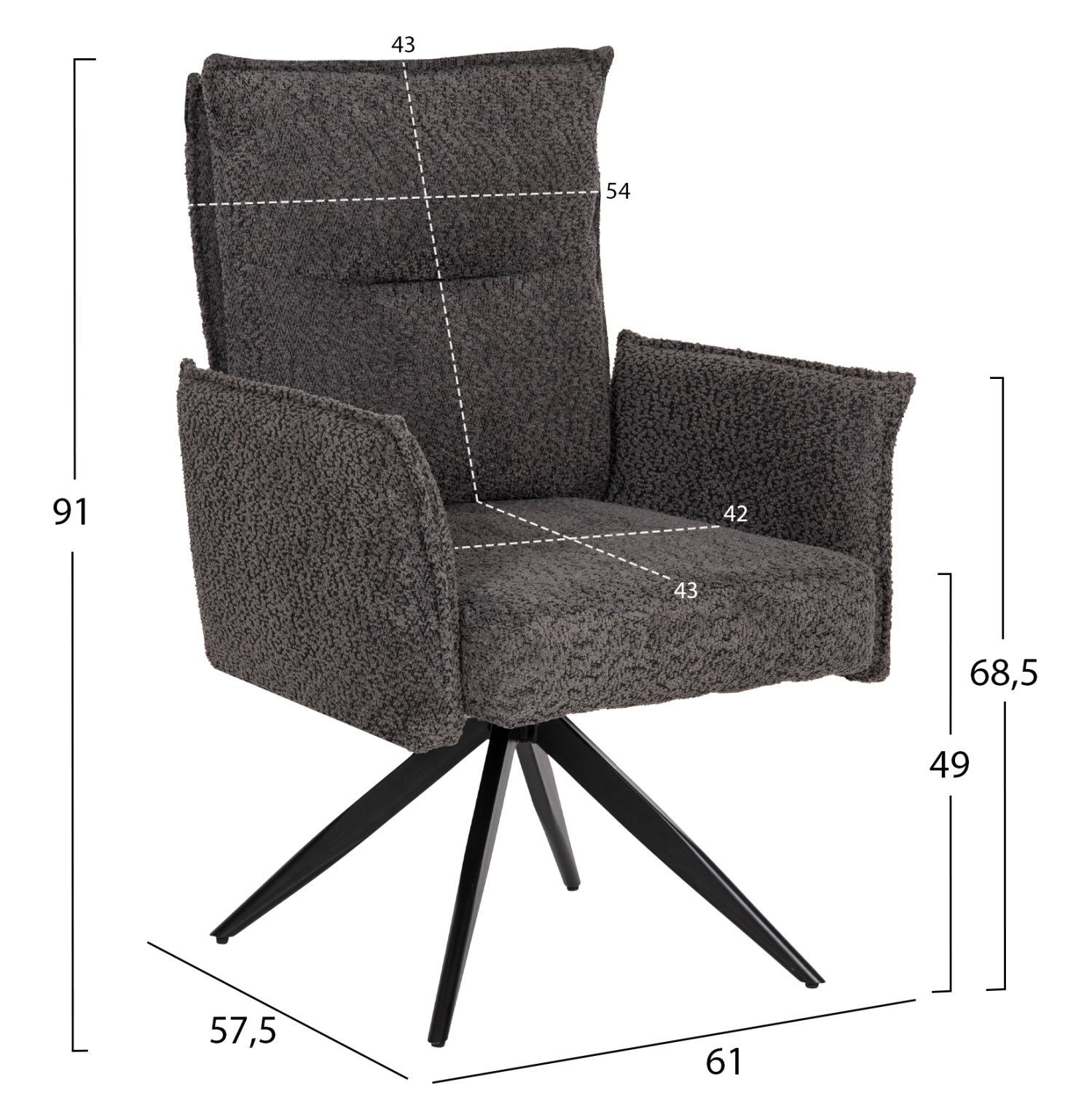 Αυτό είναι το πολυθρονάκι ZORIN σε ΓΚΡΙ χρώμα με 4 μεταλλικά πόδια σε ΜΑΥΡΟ χρώμα. Η πλάτη είναι ψηλή και δίνει την εντύπωση ότι είναι αφαιρούμενο μαξιλάρι ενώ στην πραγματικότητα αποτελεί μέρος του σκελετού, ενώ το κάθισμα είναι αναπαυτικότατο χάρη και στο γεγονός ότι διαθέτει ελατήρια, κι όχι μόνο αφρολέξ. Τα μπράτσα είναι χαμηλά ενώ το ύφασμα είναι υψηλής ποιότητας και δίνει μια αίσθηση πολυτέλειας. Το χαρακτηριστικό, όμως, που κάνει αυτή την πολυθρόνα να ξεχωρίζει είναι ότι τα πόδια έχουν διάταξη «αστέρι», δίνοντας την εντύπωση ότι η πολυθρόνα είναι περιστρεφόμενη.