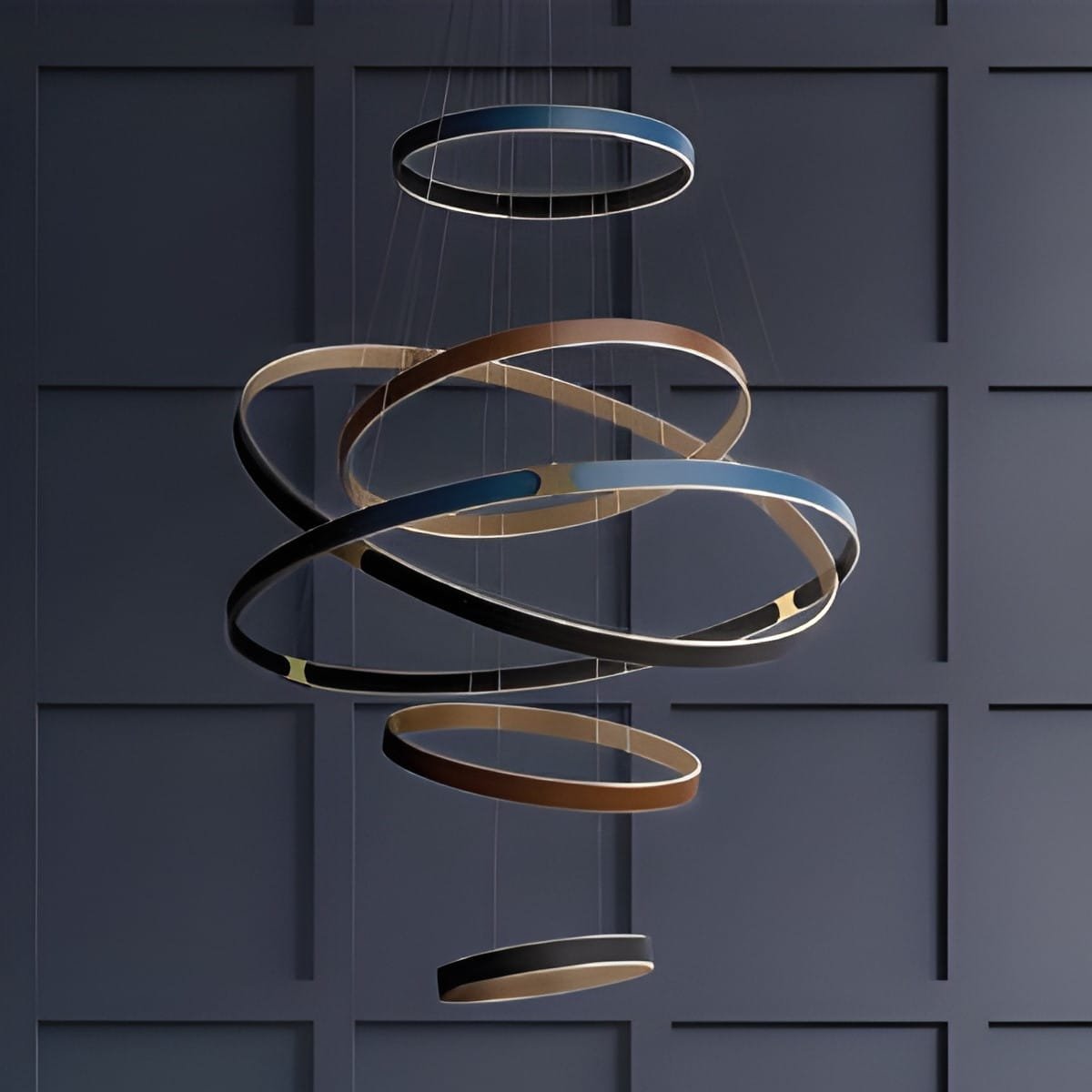Οι αιωρούμενοι φωτεινοί δακτύλιοι σχηματίζουν μια δυναμική σύνθεση που τραβά αμέσως το βλέμμα και αναβαθμίζει κάθε χώρο, από καθιστικό και τραπεζαρία έως επαγγελματικούς χώρους υψηλής αισθητικής.
