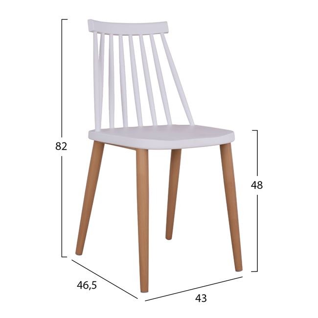 Τέσσερις καρέκλες με κάθισμα από πολυπροπυλένιο σε λευκή απόχρωση και μεταλλικά πόδια με απόδοση στο φυσικό χρώμα του ξύλου.