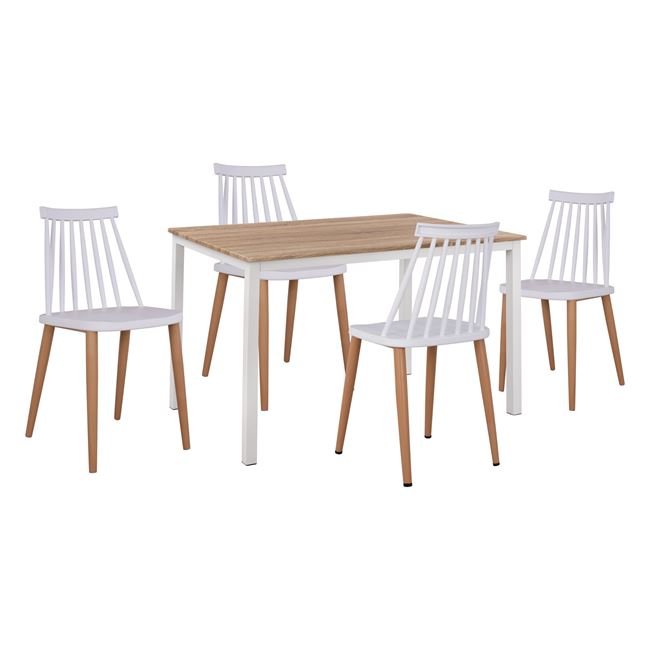 Τέσσερις καρέκλες με κάθισμα από πολυπροπυλένιο σε λευκή απόχρωση και μεταλλικά πόδια με απόδοση στο φυσικό χρώμα του ξύλου.