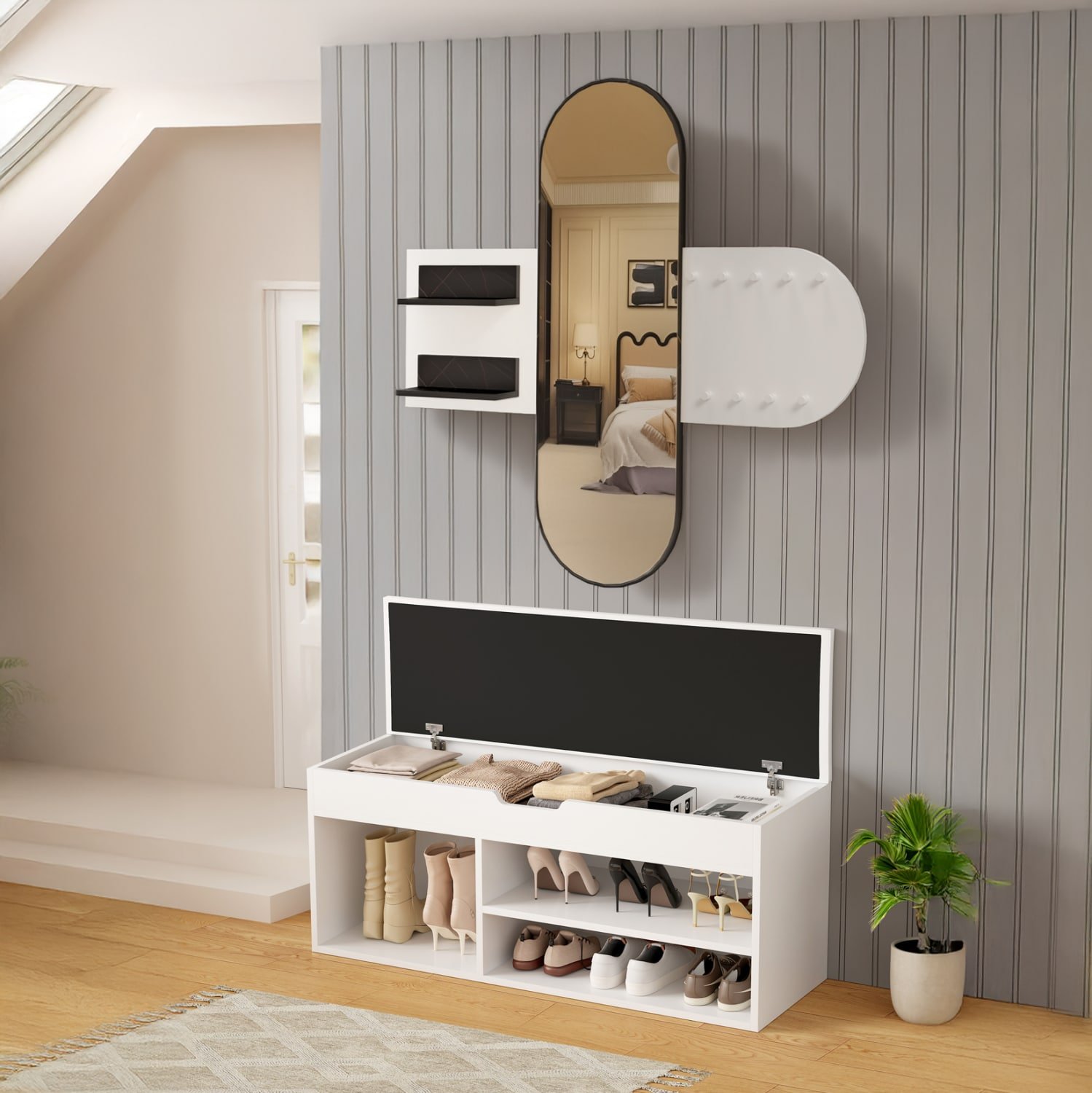 •Μία παπουτσοθήκη σε ΛΕΥΚΟ χρώμα με κάθισμα επενδυμένο με PU δέρμα. Ο χώρος αποθήκευσης είναι ανοιχτός με 2 επίπεδα στην μια πλευρά και έναν μεγαλύτερο στην άλλη για ψηλότερα παπούτσια, ενώ κάτω από το κάθισμα που ανασηκώνεται υπάρχει ακόμα ένας, πιο ρηχός, χώρος αποθήκευσης αντικειμένων.