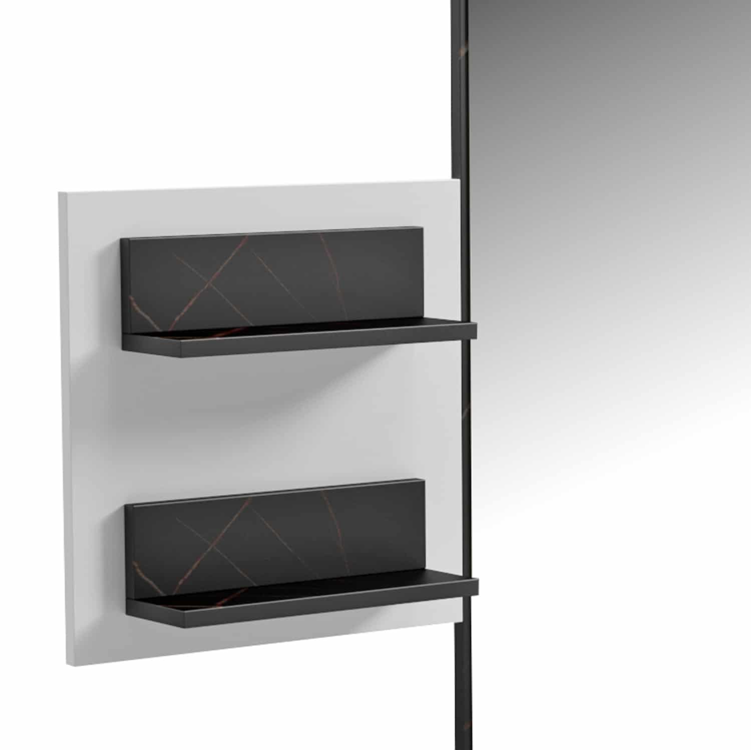 •Μια κρεμάστρα εισόδου με καθρέφτη που διαθέτει 9 κρεμάστρες ως βεστιάριο στην μια πλευρά του οβάλ καθρέφτη, και 2 ραφάκια σε χρώμα ΜΑΥΡΟΥ ΜΑΡΜΑΡΟΥ στην άλλη πλευρά.