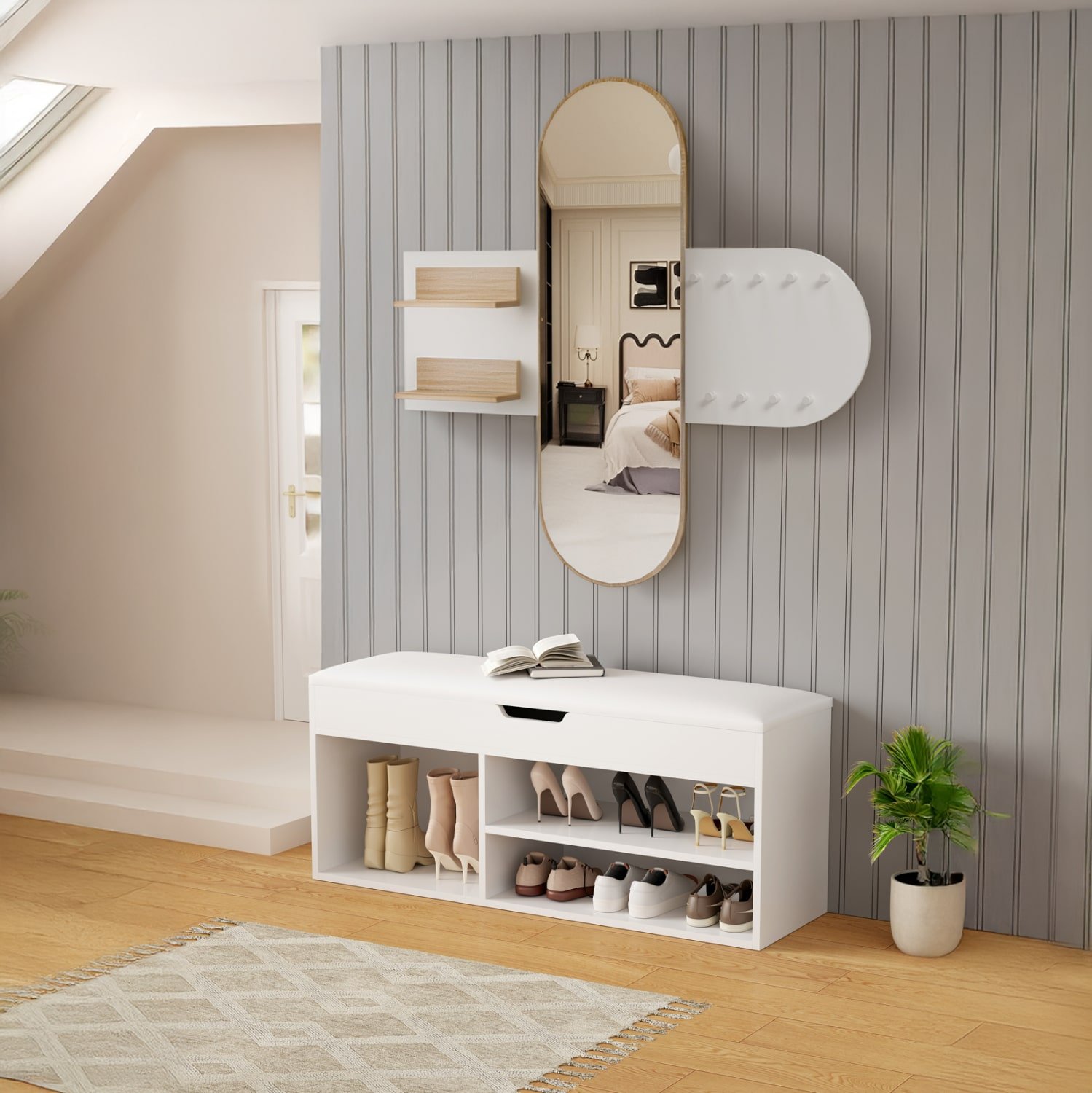 •Μία παπουτσοθήκη σε ΛΕΥΚΟ χρώμα με κάθισμα επενδυμένο με PU δέρμα. Ο χώρος αποθήκευσης είναι ανοιχτός με 2 επίπεδα στην μια πλευρά και έναν μεγαλύτερο στην άλλη για ψηλότερα παπούτσια, ενώ κάτω από το κάθισμα που ανασηκώνεται υπάρχει ακόμα ένας, πιο ρηχός, χώρος αποθήκευσης αντικειμένων.